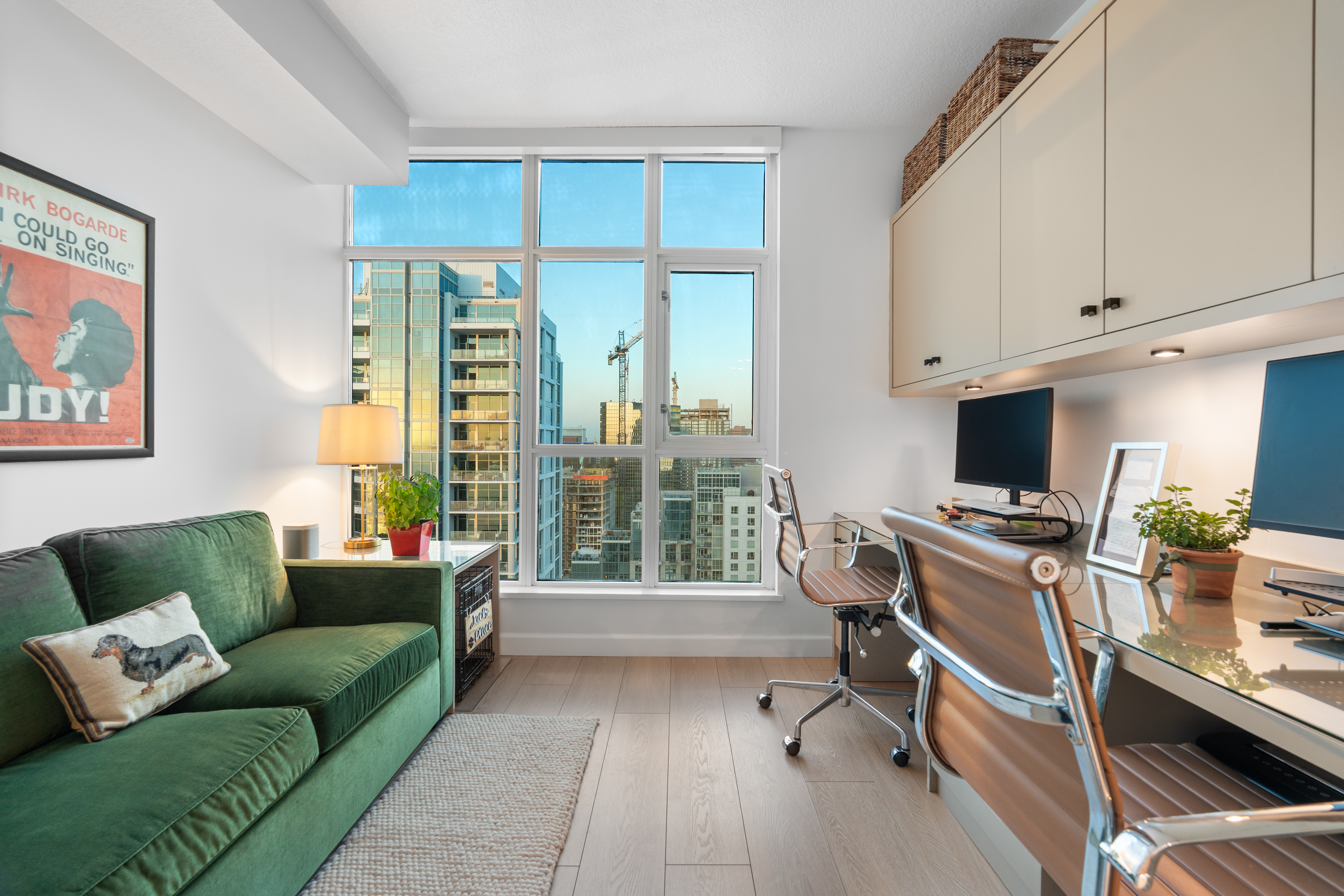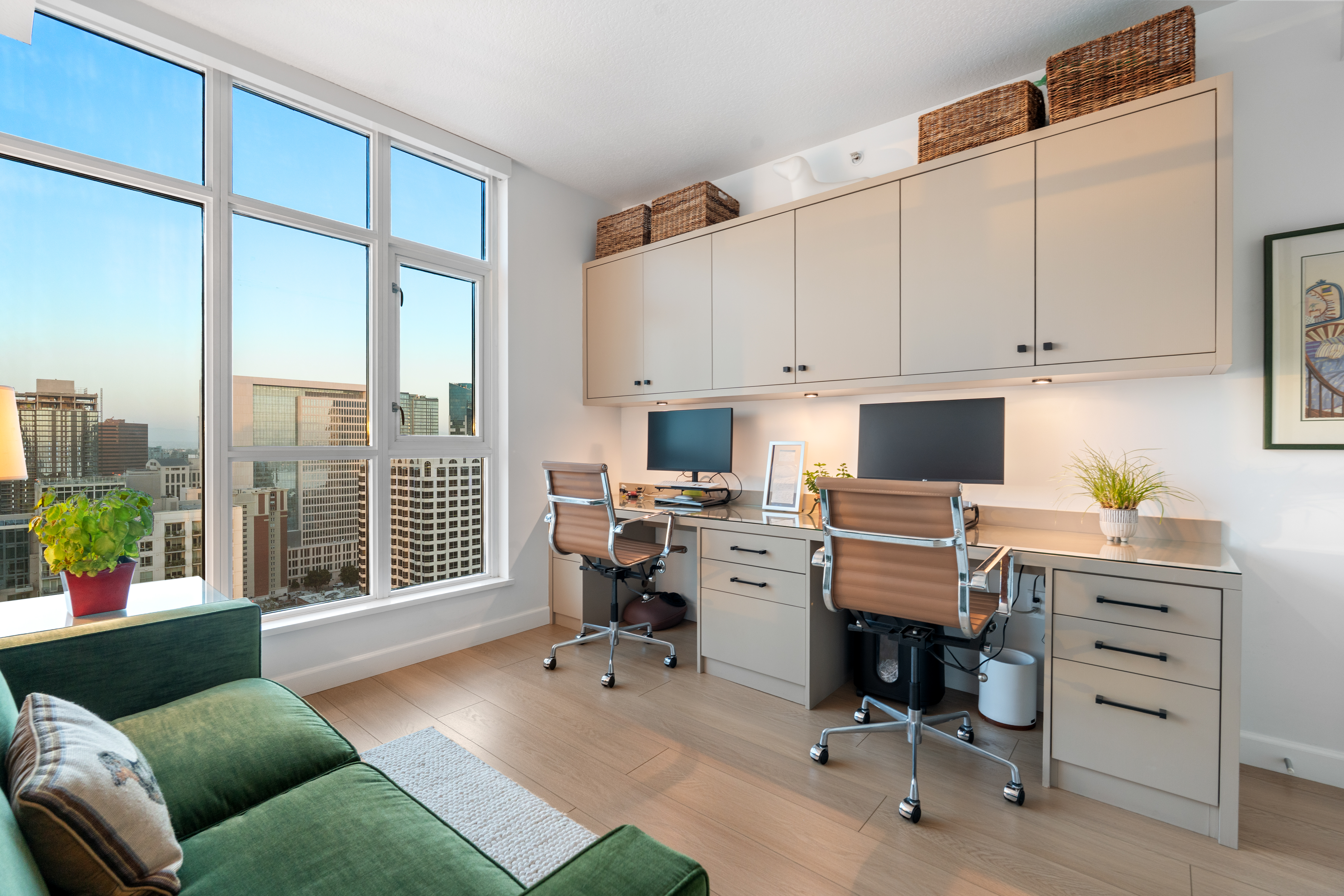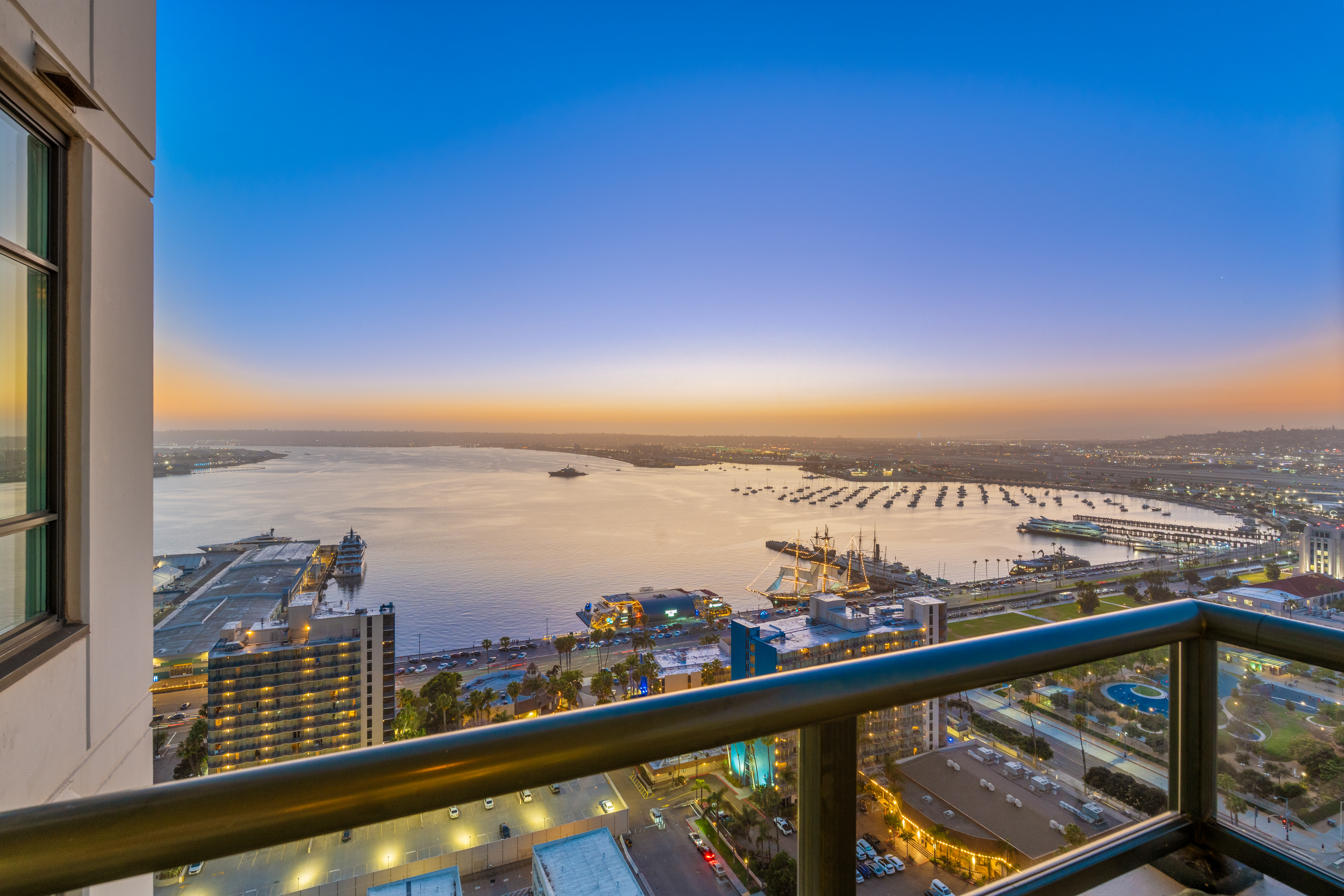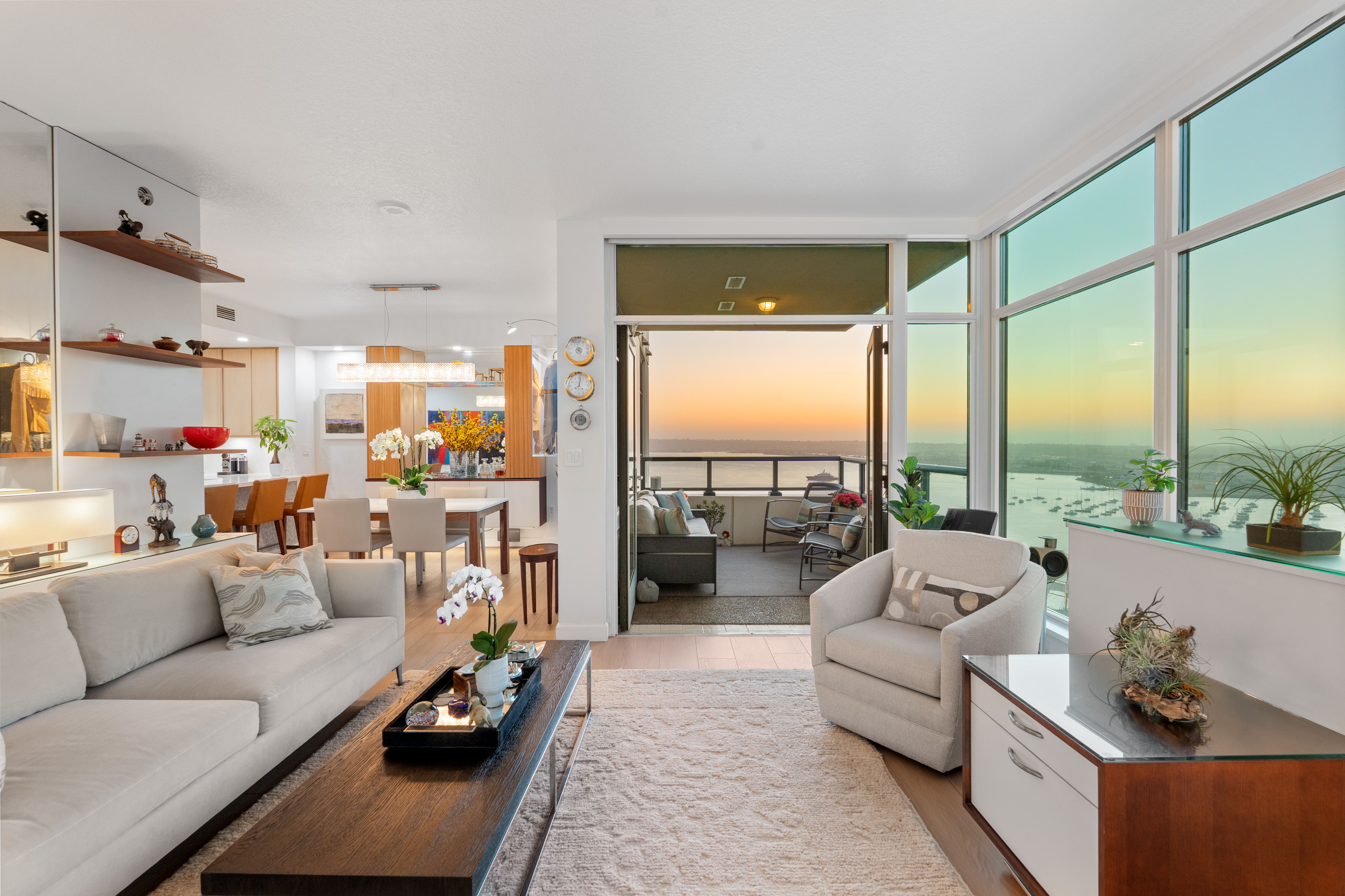 Soaring high above the city on the 31st floor of the distinguished Grande North, this rare corner residence commands a front-row seat to San Diego’s most breathtaking scenery. Walls of glass unveil an ever-changing canvas of San Diego Bay, the glittering skyline, distant mountains, and the vast Pacific beyond. From sunrise to sailboat regattas, golden sunsets to SeaWorld’s nightly fireworks—every moment is a masterpiece, best enjoyed from your own private terrace in the sky. This fully remodeled and professionally designed 2-bedroom, 2-bath home has been reimagined with a focus on luxury, comfort, and functionality. Both bathrooms have been completely renovated with designer finishes and thoughtful details. The chef-inspired kitchen is equipped with new Sub-Zero and Wolf appliances, quartz countertops, and sleek custom cabinetry. Enhancing the experience throughout the home is a state-of-the-art Bang & Olufsen surround sound system, delivering rich, immersive audio. Motorized window shades, custom closets, and built-in storage offer refined ease, while every design detail has been meticulously curated. This is more than a home—it’s a lifestyle inspired by The Art of Living. Whether you’re entertaining against a sunset backdrop or enjoying a quiet morning above the bay, this residence delivers a daily experience of beauty, style, and sophistication. Welcome home!