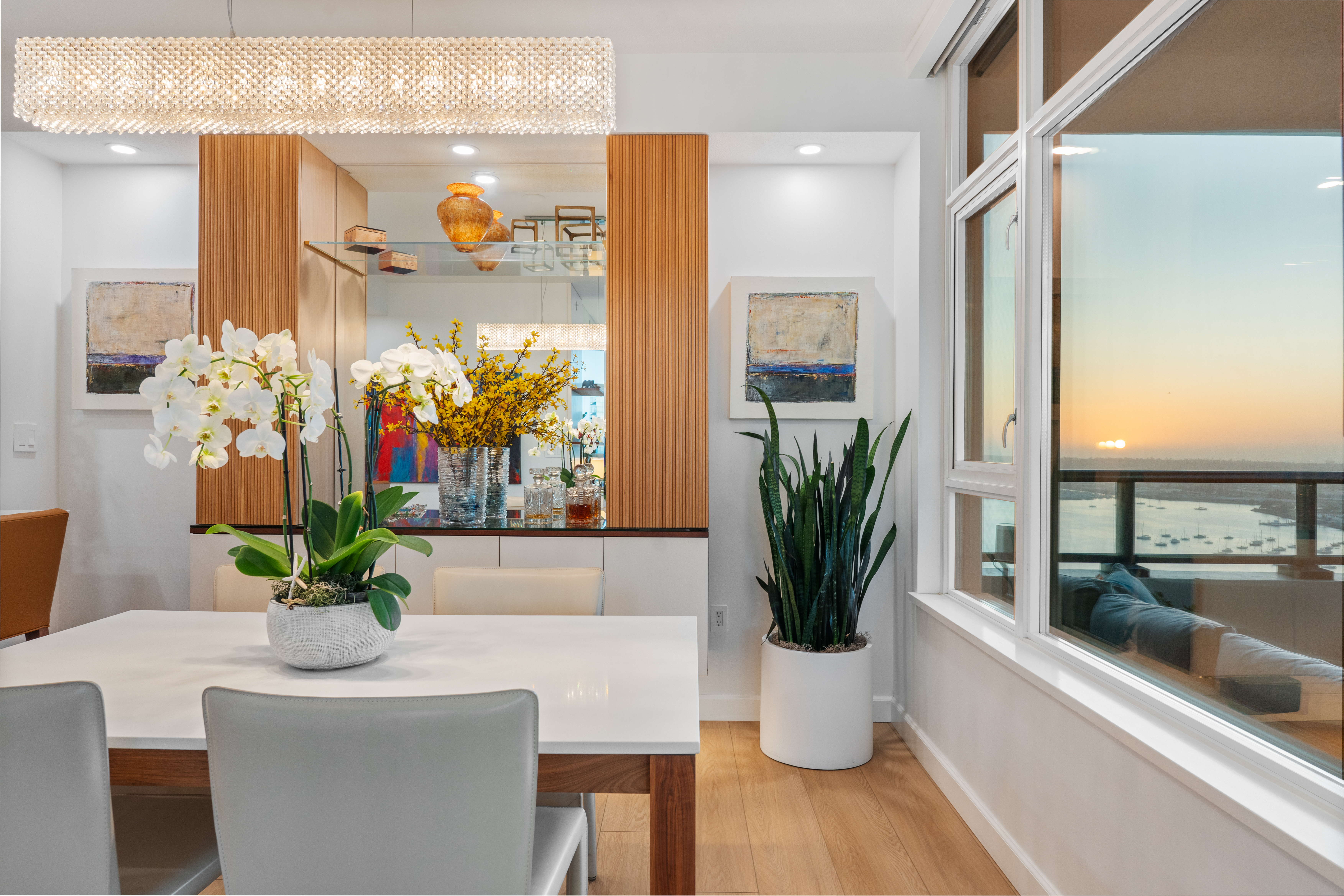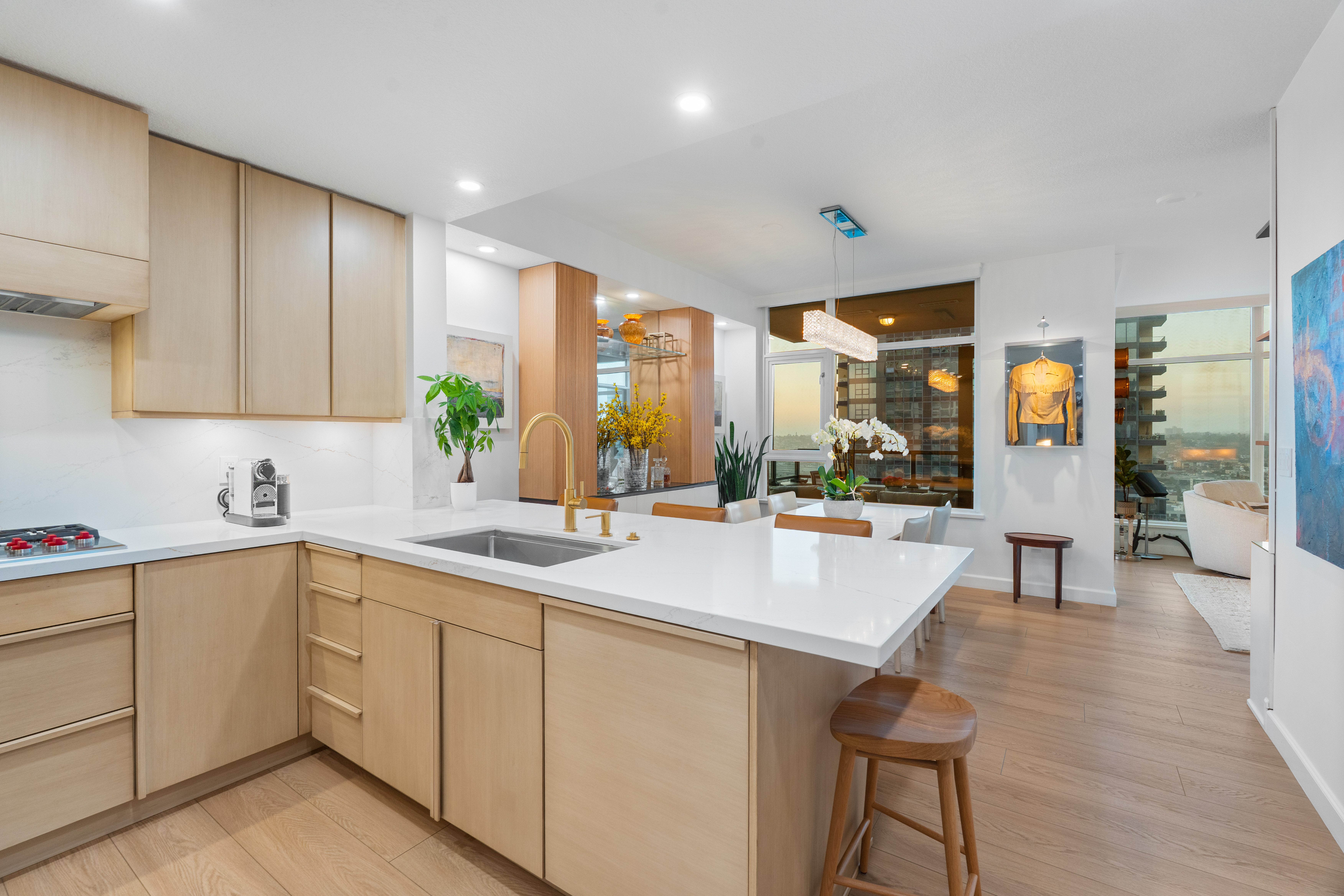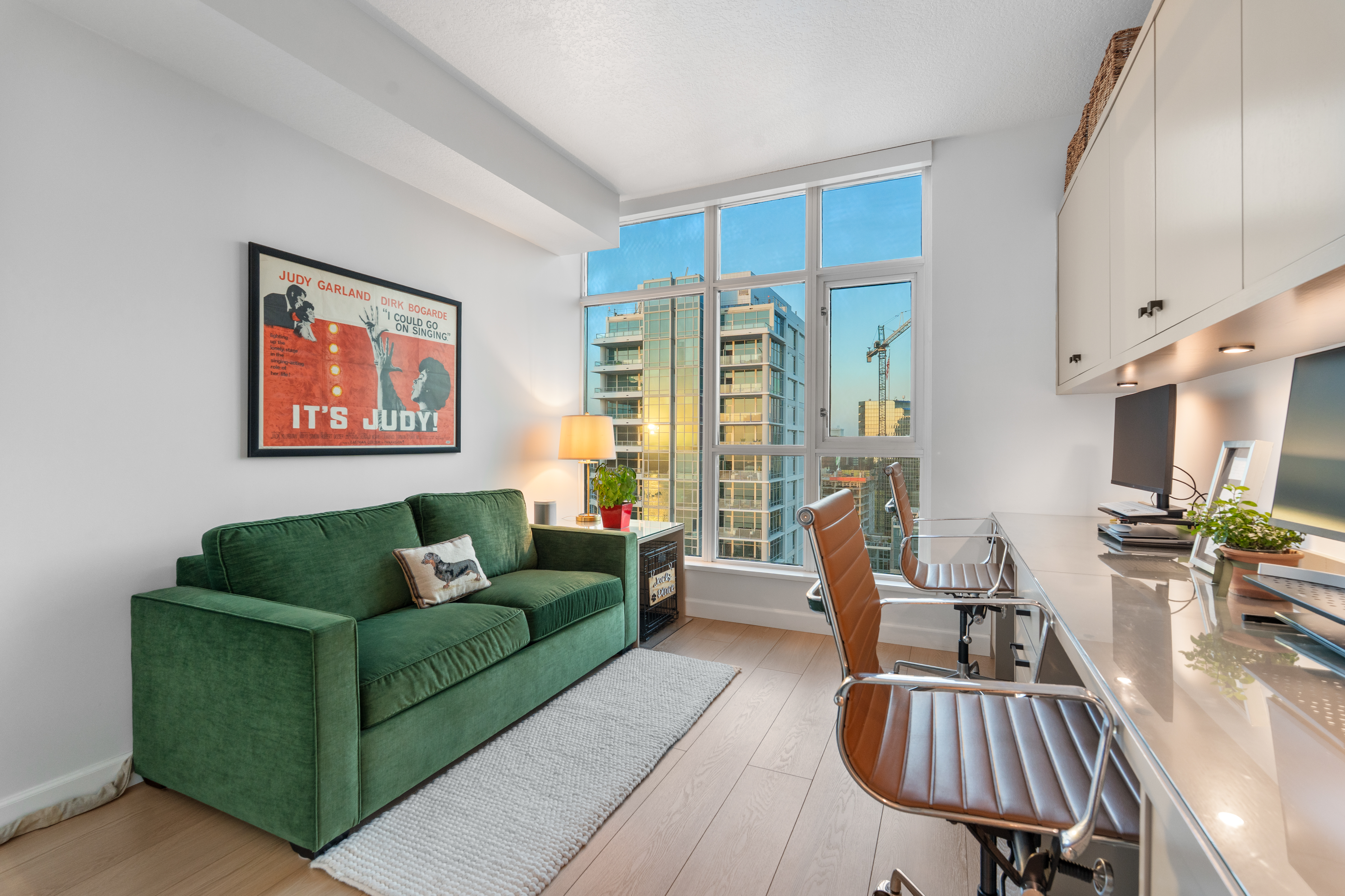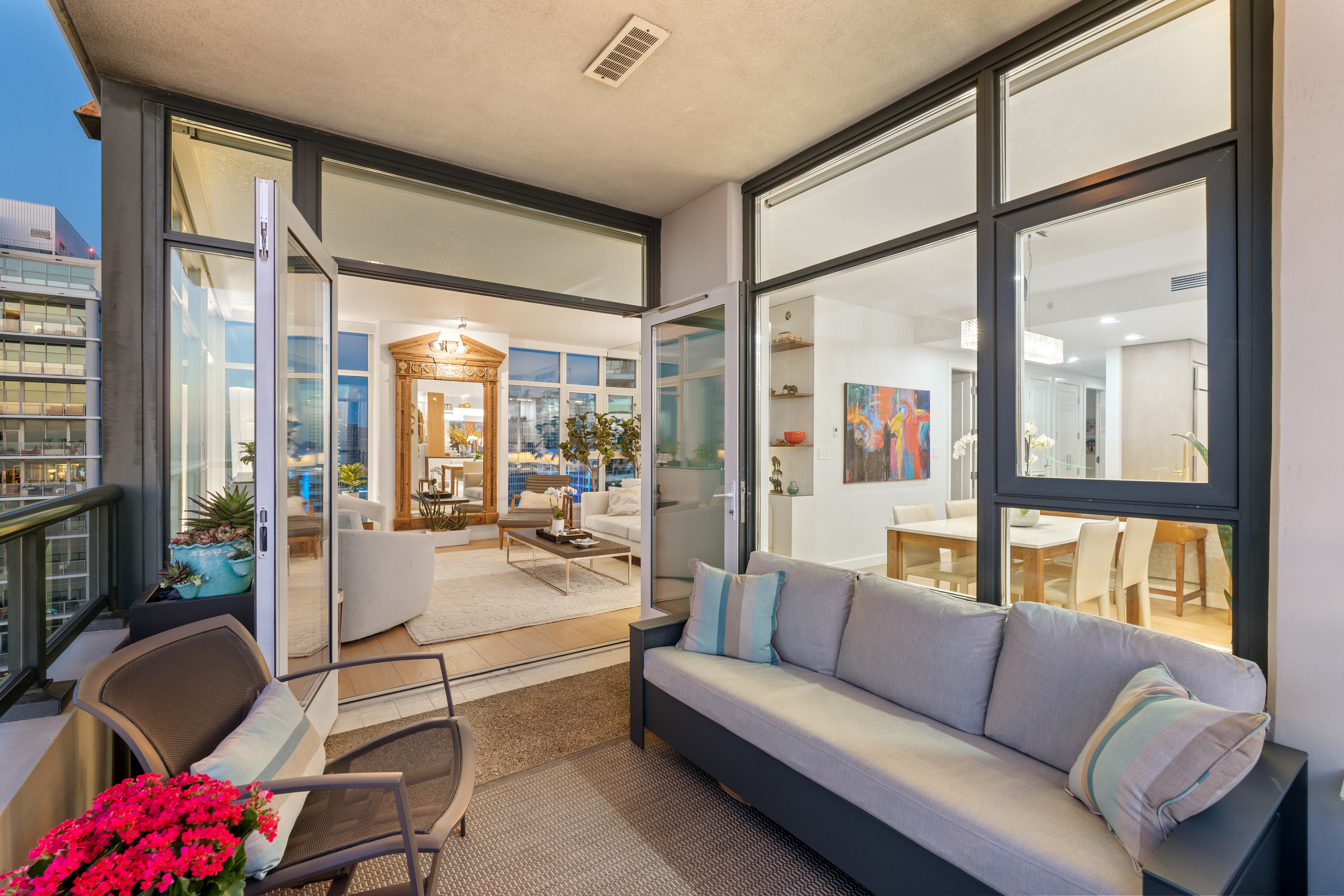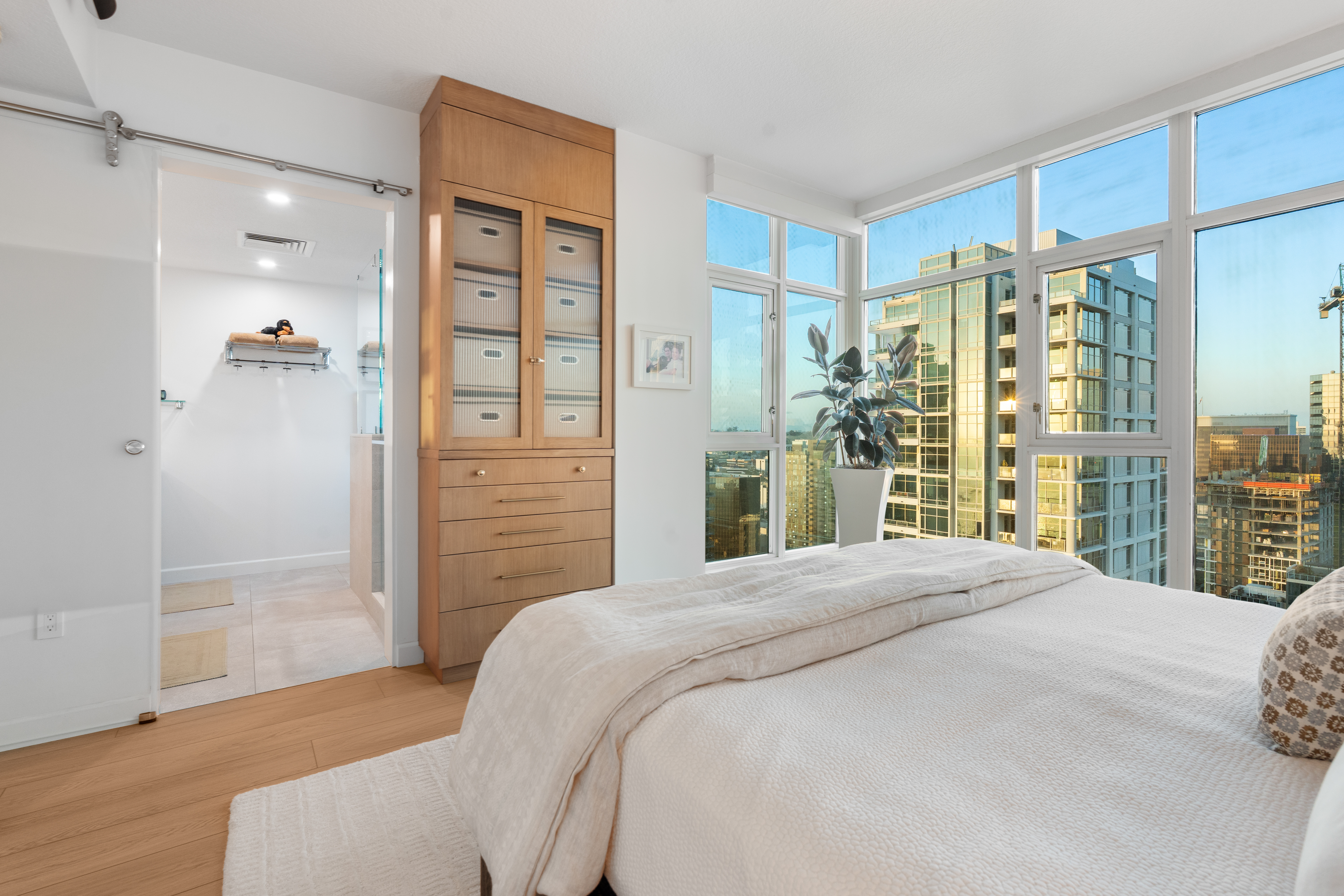Soaring high above the city on the 31st floor of the distinguished Grande North, this rare corner residence commands a front-row seat to San Diego’s most breathtaking scenery. Walls of glass unveil an ever-changing canvas of San Diego Bay, the glittering skyline, distant mountains, and the vast Pacific beyond. From sunrise to sailboat regattas, golden sunsets to SeaWorld’s nightly fireworks—every moment is a masterpiece, best enjoyed from your own private terrace in the sky. This fully remodeled and professionally designed 2-bedroom, 2-bath home has been reimagined with a focus on luxury, comfort, and functionality. Both bathrooms have been completely renovated with designer finishes and thoughtful details. The chef-inspired kitchen is equipped with new Sub-Zero and Wolf appliances, quartz countertops, and sleek custom cabinetry. Enhancing the experience throughout the home is a state-of-the-art Bang & Olufsen surround sound system, delivering rich, immersive audio. Motorized window shades, custom closets, and built-in storage offer refined ease, while every design detail has been meticulously curated. This is more than a home—it’s a lifestyle inspired by The Art of Living. Whether you’re entertaining against a sunset backdrop or enjoying a quiet morning above the bay, this residence delivers a daily experience of beauty, style, and sophistication. Welcome home!