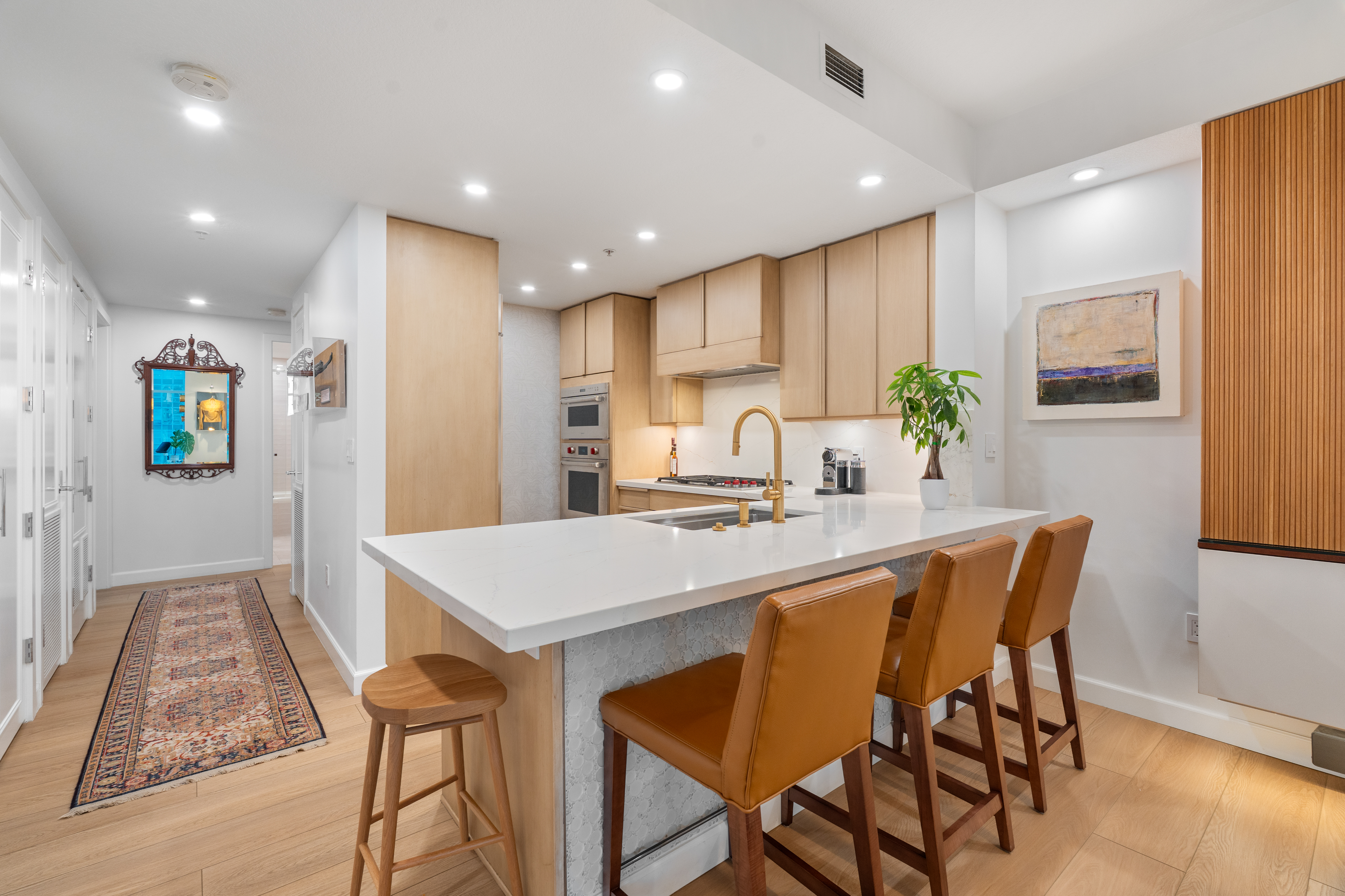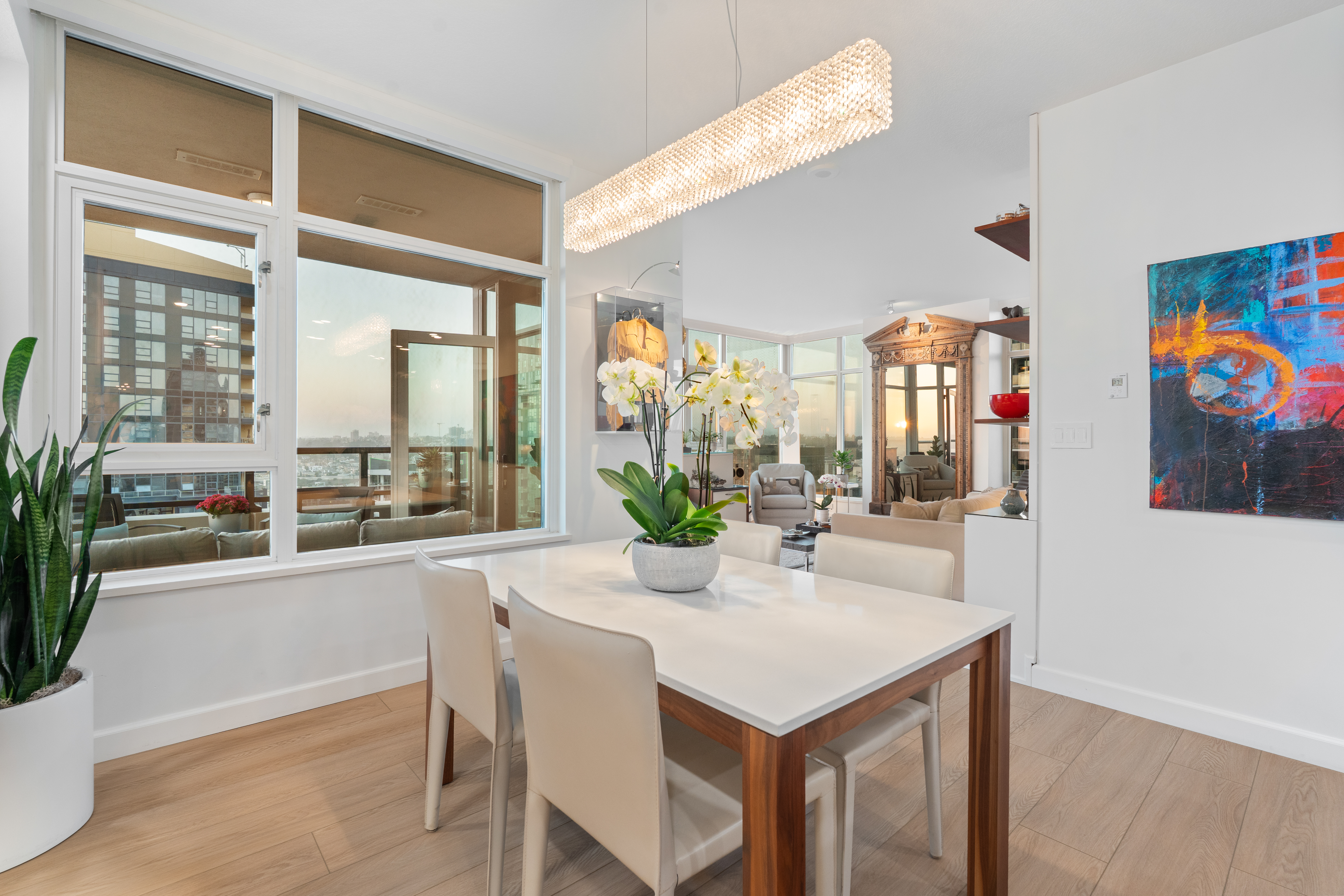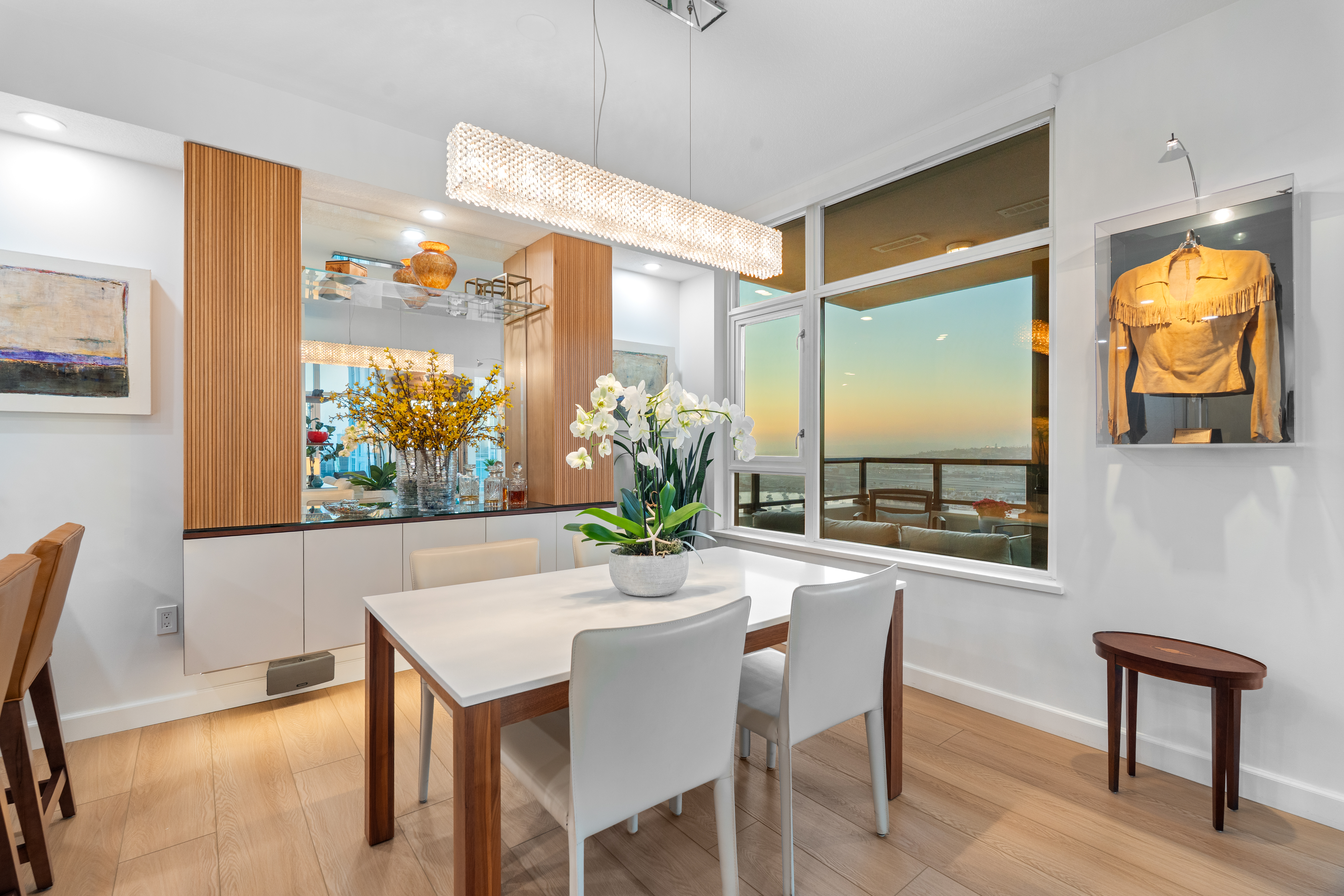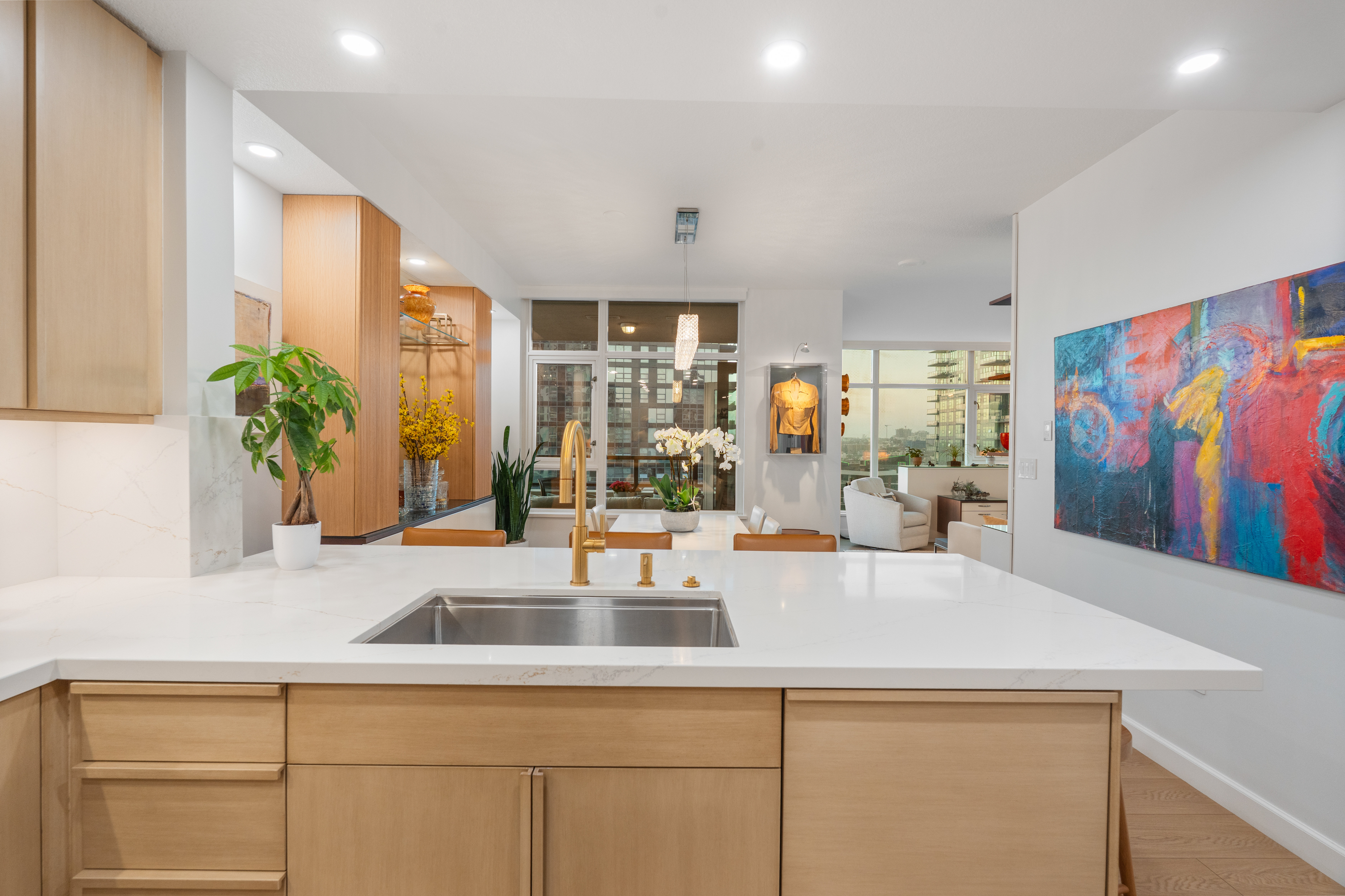Soaring high above the city on the 31st floor of the distinguished Grande North, this rare corner residence commands a front-row seat to San Diego’s most breathtaking scenery. Walls of glass unveil an ever-changing canvas of San Diego Bay, the glittering skyline, distant mountains, and the vast Pacific beyond. From sunrise to sailboat regattas, golden sunsets to SeaWorld’s nightly fireworks—every moment is a masterpiece, best enjoyed from your own private terrace in the sky. This fully remodeled and professionally designed 2-bedroom, 2-bath home has been reimagined with a focus on luxury, comfort, and functionality. Both bathrooms have been completely renovated with designer finishes and thoughtful details. The chef-inspired kitchen is equipped with new Sub-Zero and Wolf appliances, quartz countertops, and sleek custom cabinetry. Enhancing the experience throughout the home is a state-of-the-art Bang & Olufsen surround sound system, delivering rich, immersive audio. Motorized window shades, custom closets, and built-in storage offer refined ease, while every design detail has been meticulously curated. This is more than a home—it’s a lifestyle inspired by The Art of Living. Whether you’re entertaining against a sunset backdrop or enjoying a quiet morning above the bay, this residence delivers a daily experience of beauty, style, and sophistication. Welcome home!