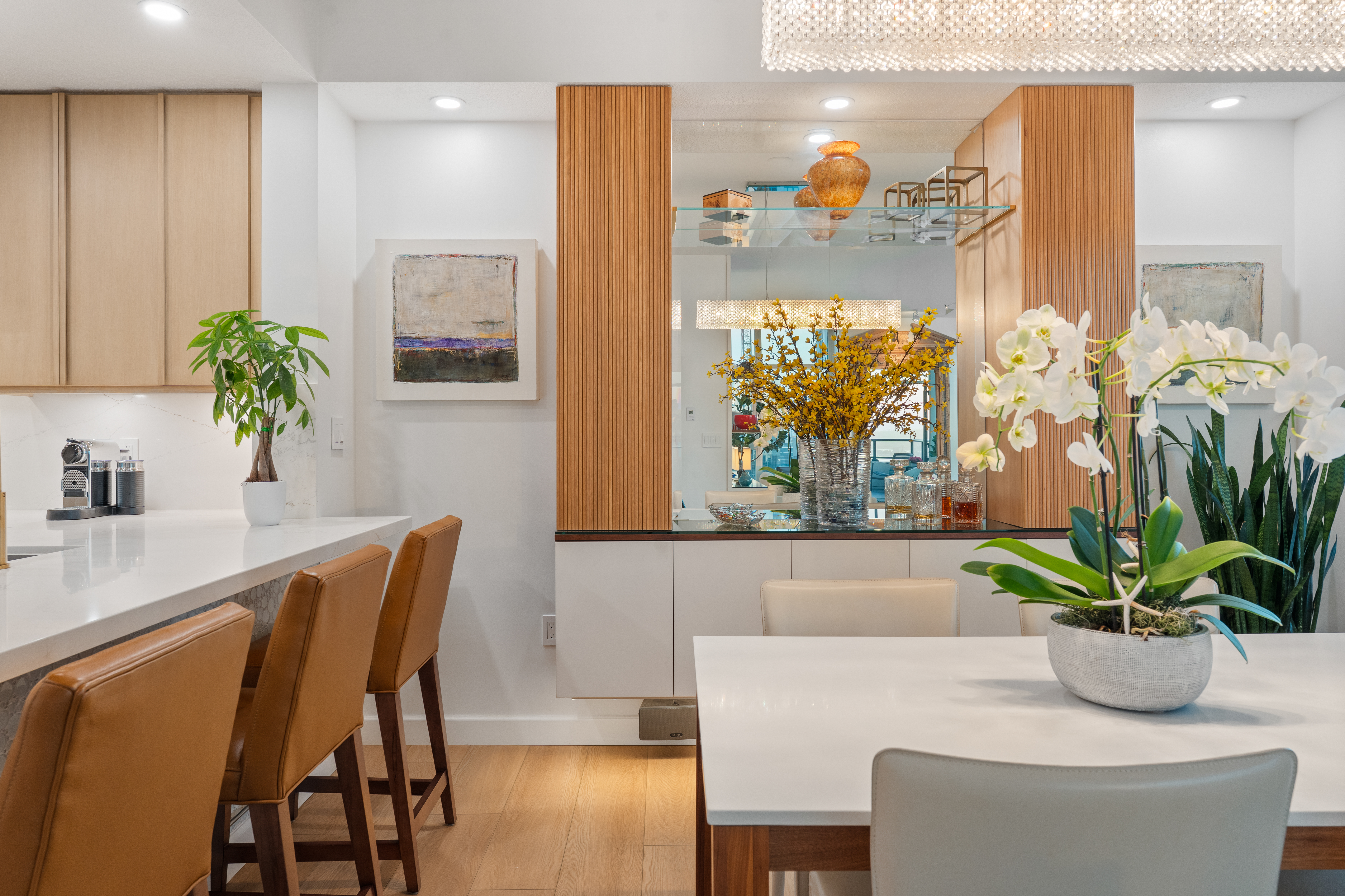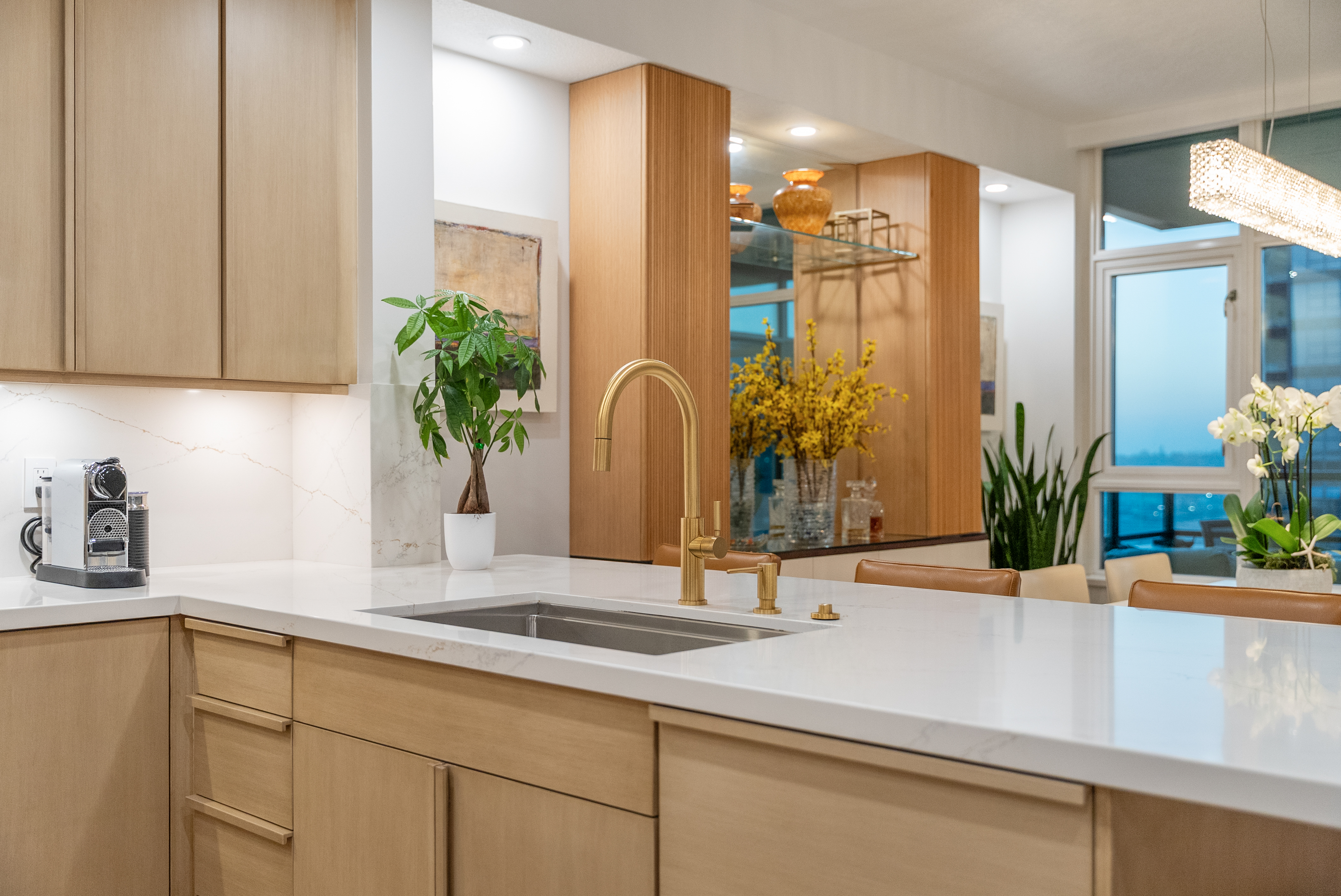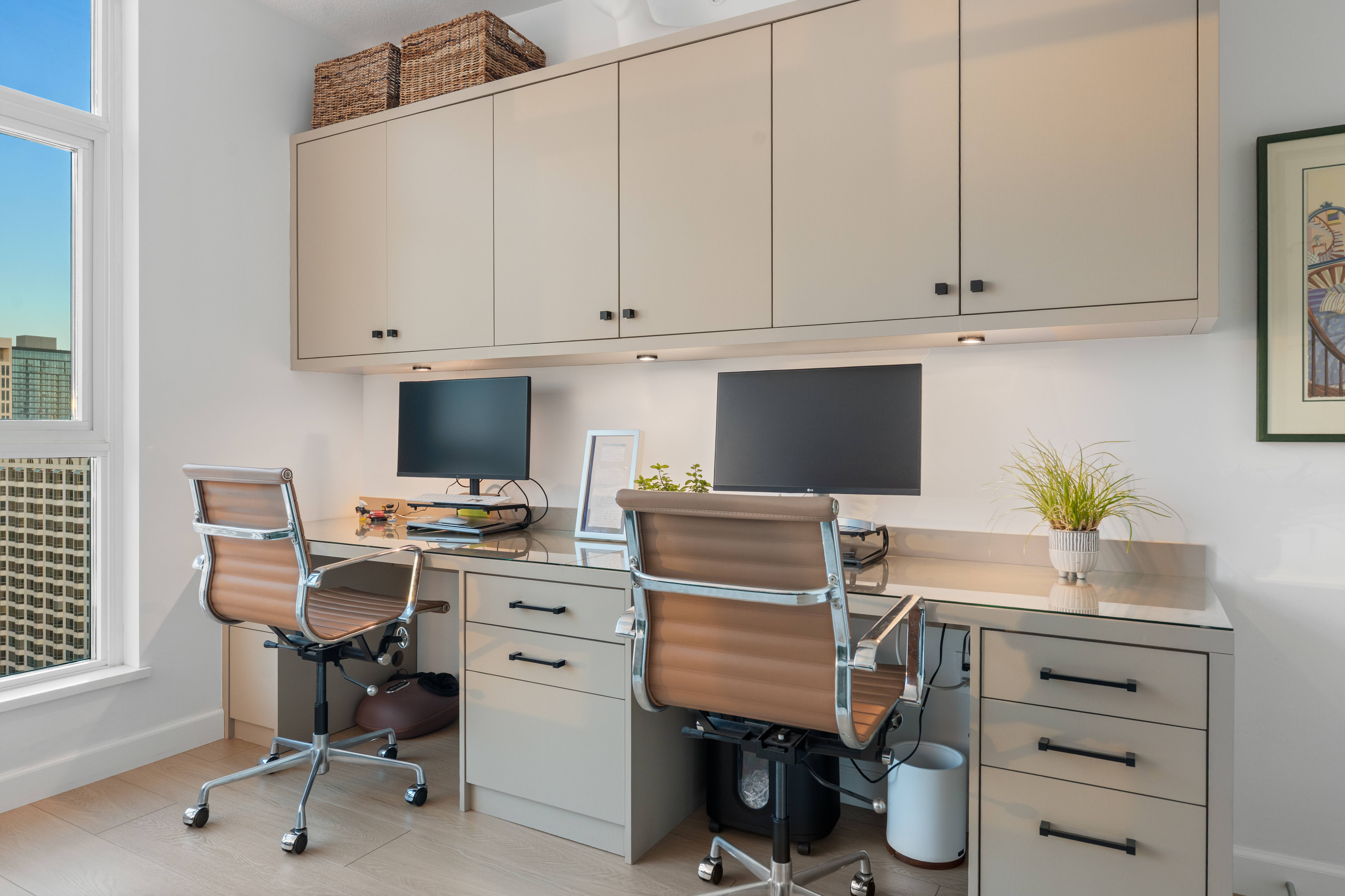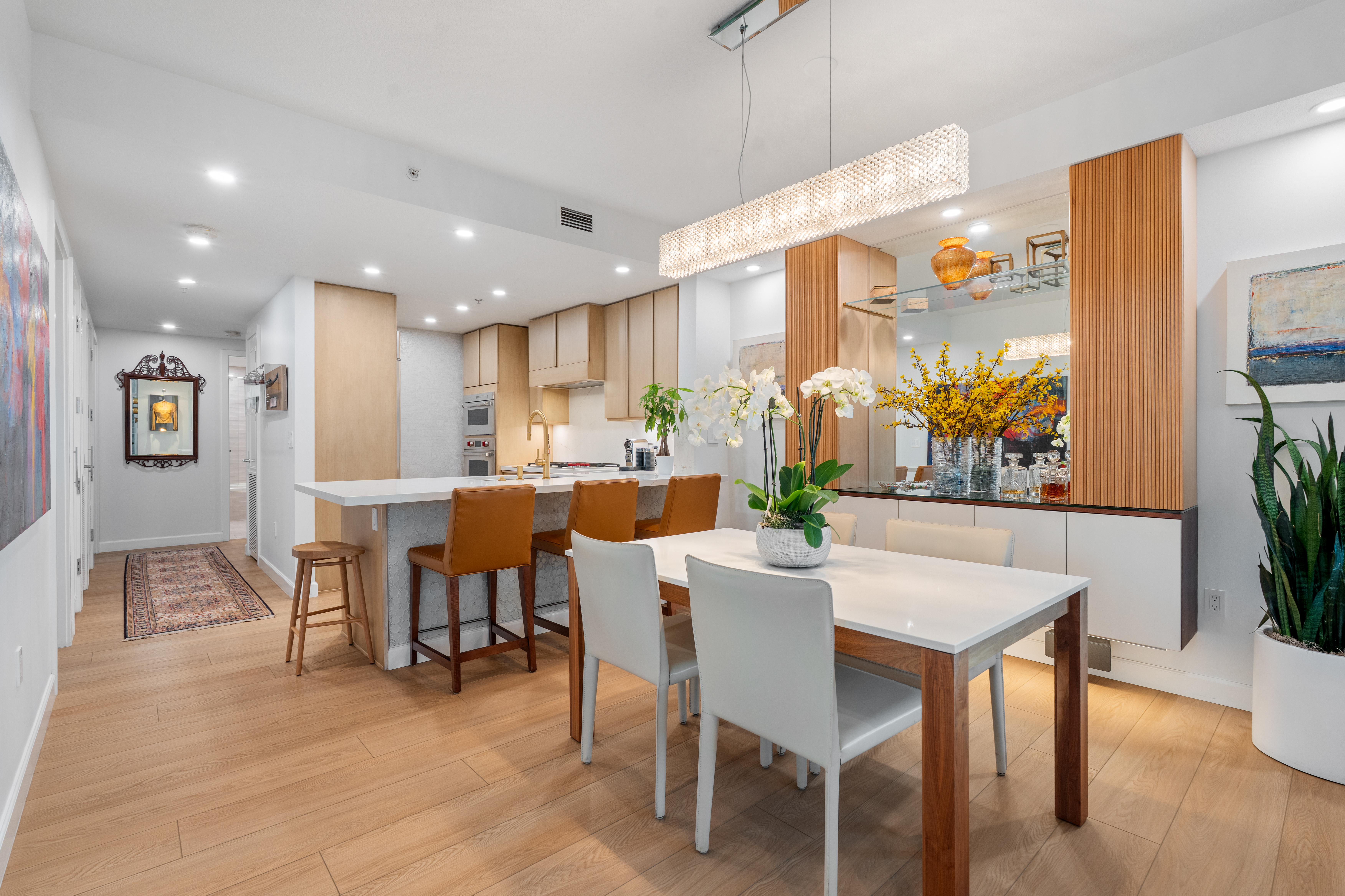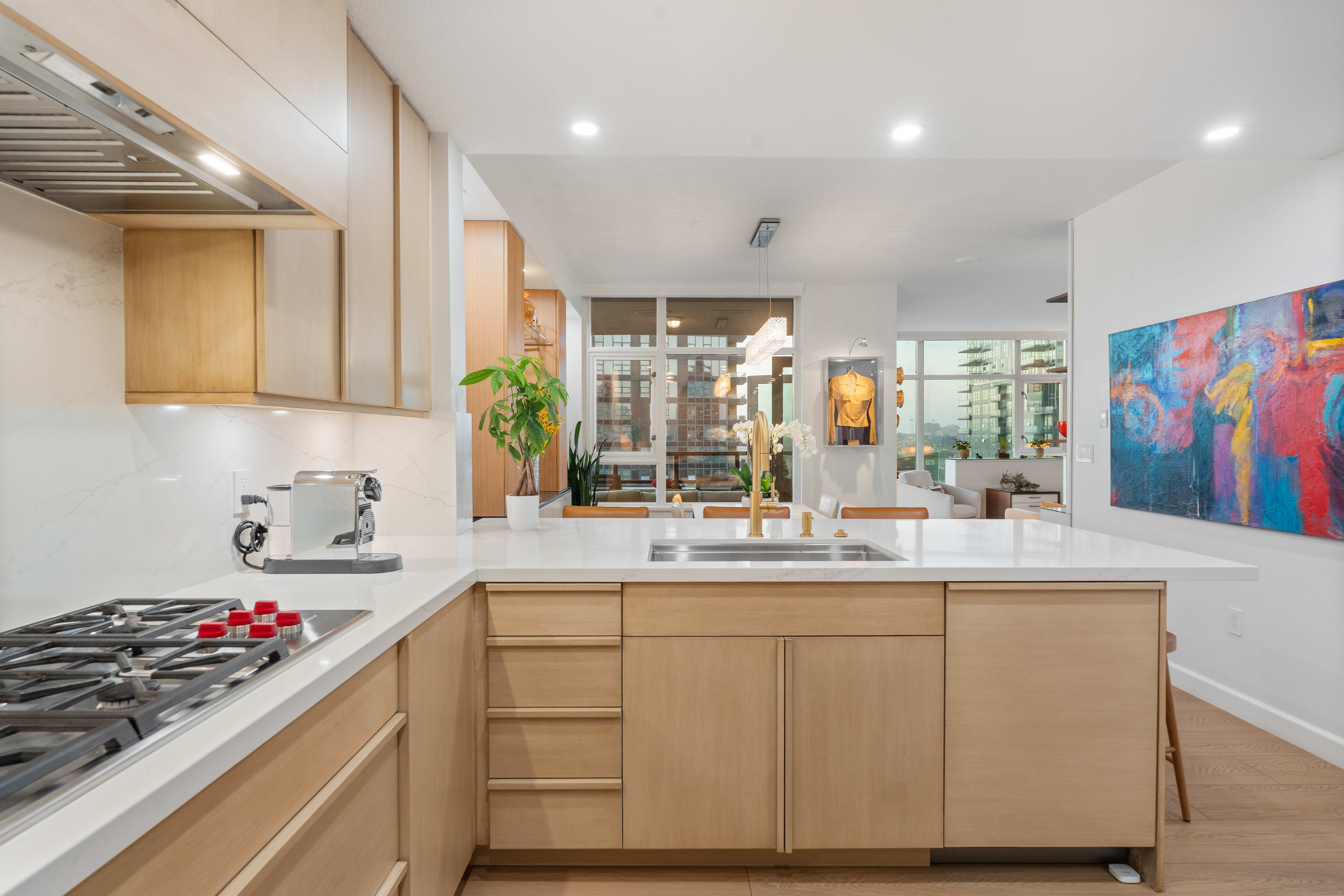 Soaring high above the city on the 31st floor of the distinguished Grande North, this rare corner residence commands a front-row seat to San Diego’s most breathtaking scenery. Walls of glass unveil an ever-changing canvas of San Diego Bay, the glittering skyline, distant mountains, and the vast Pacific beyond. From sunrise to sailboat regattas, golden sunsets to SeaWorld’s nightly fireworks—every moment is a masterpiece, best enjoyed from your own private terrace in the sky. This fully remodeled and professionally designed 2-bedroom, 2-bath home has been reimagined with a focus on luxury, comfort, and functionality. Both bathrooms have been completely renovated with designer finishes and thoughtful details. The chef-inspired kitchen is equipped with new Sub-Zero and Wolf appliances, quartz countertops, and sleek custom cabinetry. Enhancing the experience throughout the home is a state-of-the-art Bang & Olufsen surround sound system, delivering rich, immersive audio. Motorized window shades, custom closets, and built-in storage offer refined ease, while every design detail has been meticulously curated. This is more than a home—it’s a lifestyle inspired by The Art of Living. Whether you’re entertaining against a sunset backdrop or enjoying a quiet morning above the bay, this residence delivers a daily experience of beauty, style, and sophistication. Welcome home!