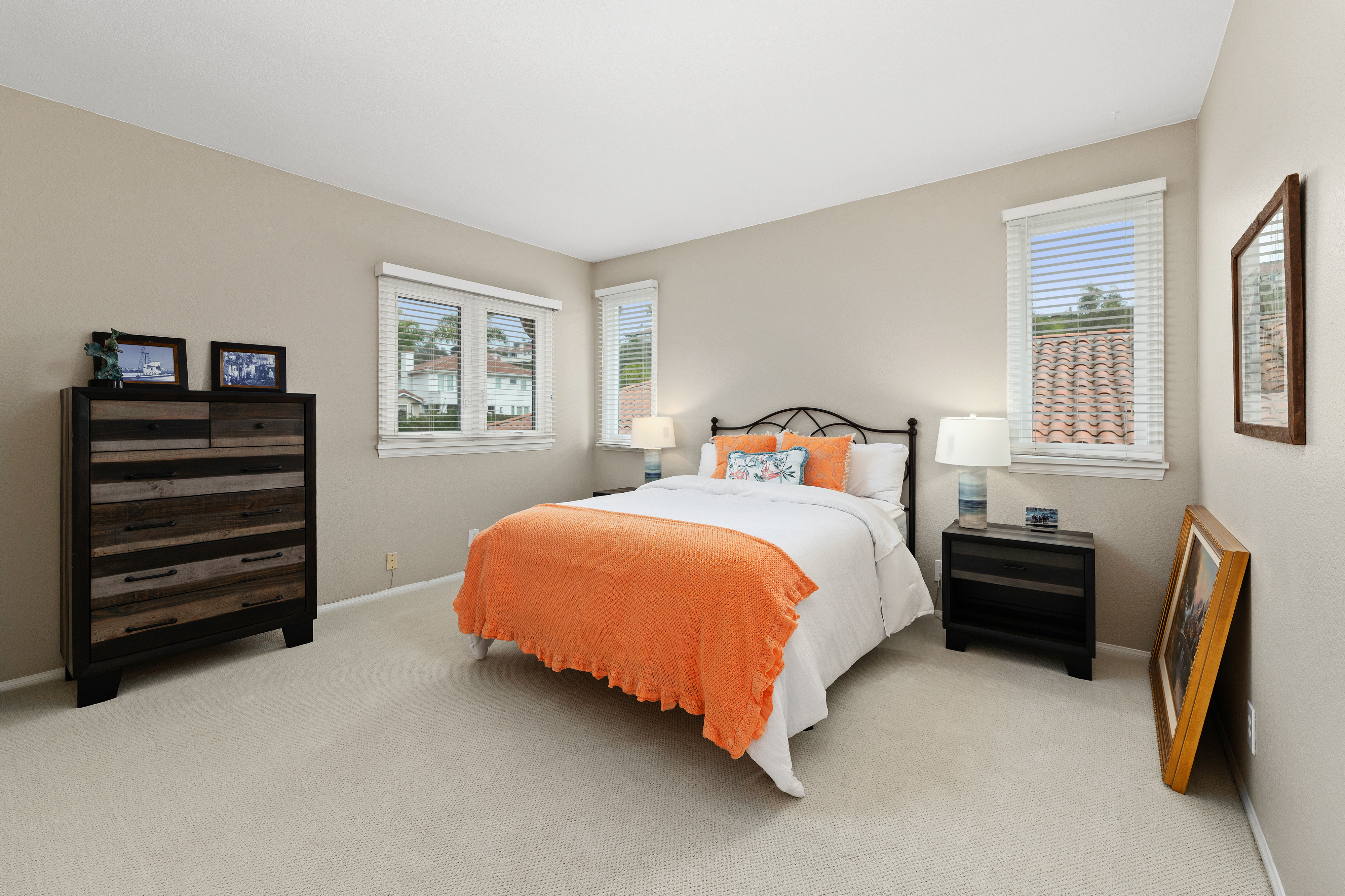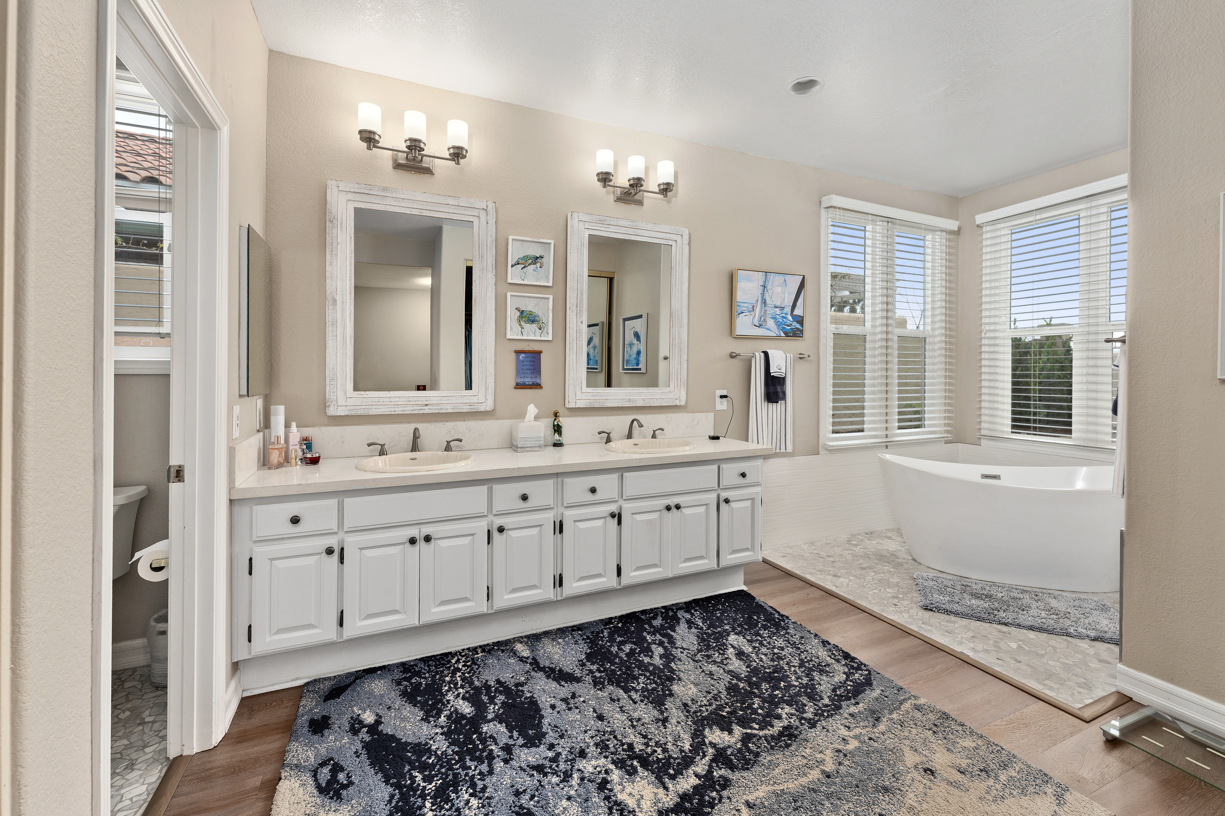 Welcome to Brisas Del Mar! Walk to shopping, grocery, restaurants, nursery & banking. Only 1.7 mi to Del Mar's Dog Beach, & World Famous Del Mar Beaches! Most popular 2 story floor plan w/ Primary Bed. (w/ gorgeous freestanding tub) downstairs along with office/4th Bed. 2 bed up w/ lagoon views! Updated w/ gated flagstone patio entry, hrd wd floors & travertine flooring, charming wine room, stone countertops, custom window coverings, low maint yard w/ flagstone patio. Cul de sac location.
