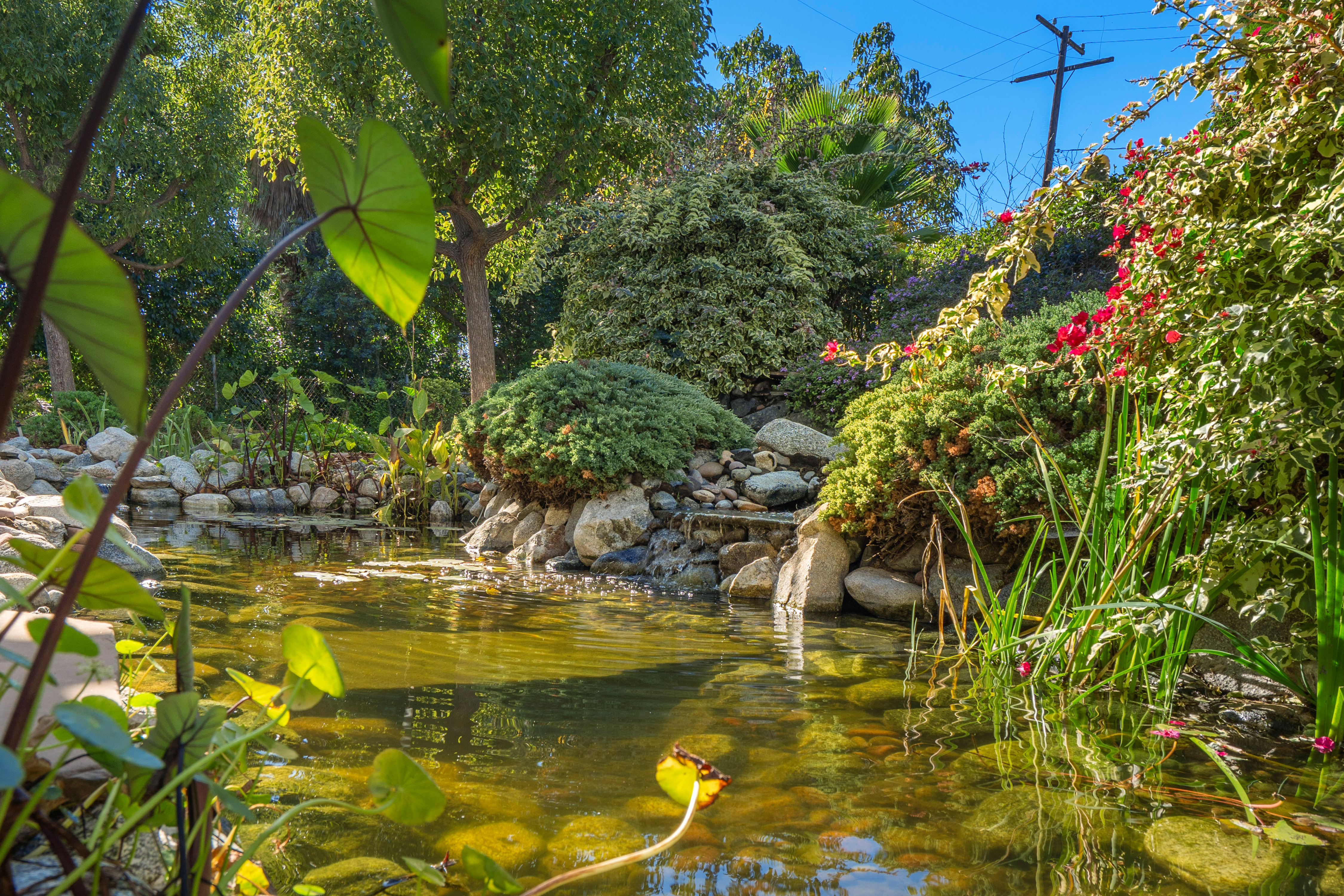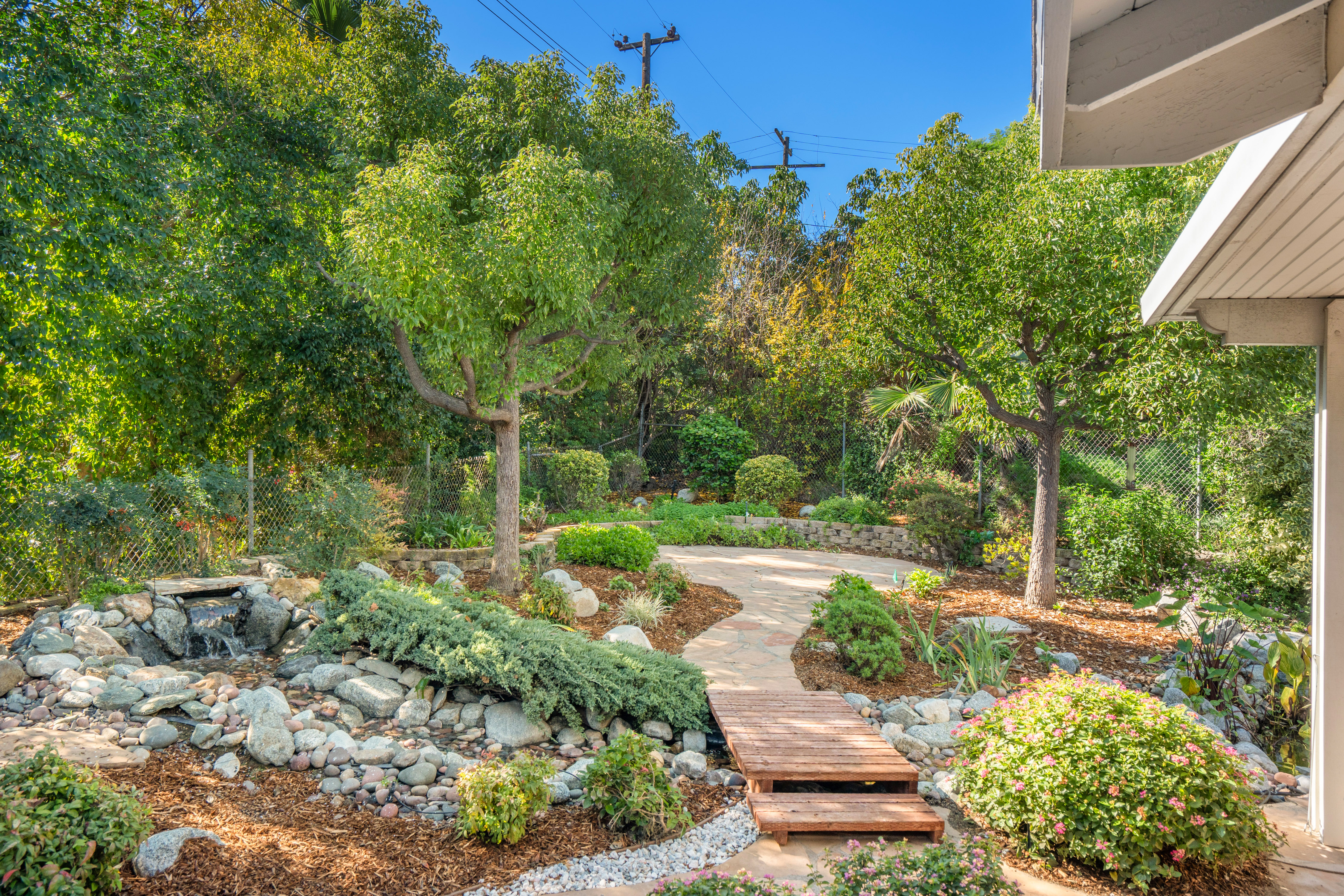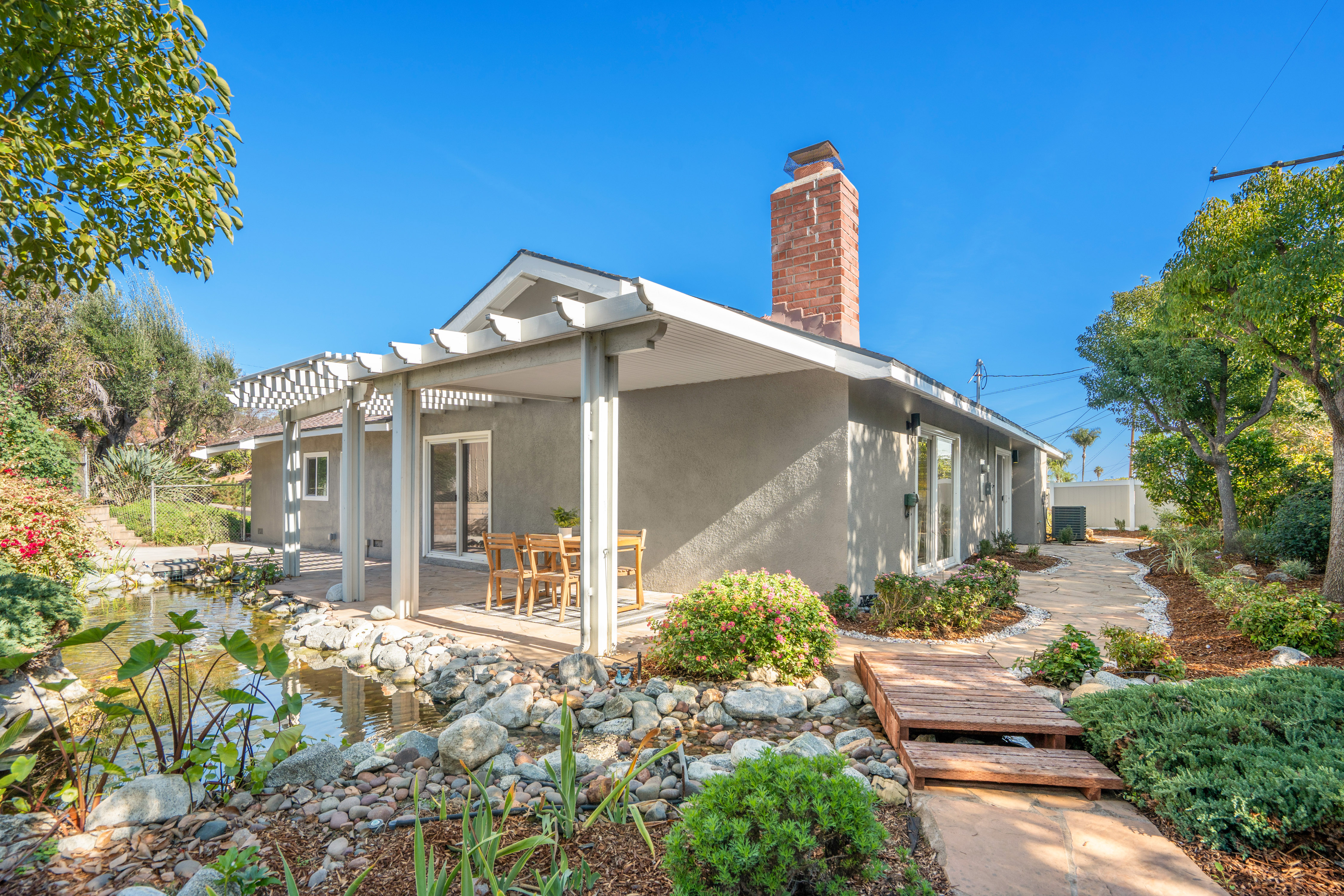 Beautifully remodeled, this luxurious single-story home features soaring ceilings, warm wide-plank flooring, and landscaped surroundings—including a tranquil pond—that reflect the area’s quiet suburban character. The open layout flows from the bright living room with a fireplace and expansive sliders to an elegant dining area with vaulted, beamed ceilings. The stunning kitchen offers shaker cabinetry, quartz countertops, stainless steel appliances, and a generous peninsula for casual seating. The serene primary suite includes soft natural light and a spa-like ensuite bath with dual vanities and an oversized shower. Three additional bedrooms are spacious and airy, while the updated hall bath showcases designer tile, warm wood cabinetry, and modern fixtures. Outdoors, the property transforms into a captivating sanctuary. The expansive backyard showcases lush greenery, meandering flagstone pathways, and mature landscaping. A tranquil pond with a waterfall feature provides a soothing backdrop to the covered patio—an inviting setting for outdoor dining, morning coffee, or evening relaxation. Surrounded by mature plantings, shade trees, and thoughtfully curated beds, the space offers exceptional privacy and year-round enjoyment. With fully owned solar for added efficiency and a location moments from parks, scenic trails, shopping, dining, and commuter routes, this exceptional Walnut residence beautifully captures the appeal of its natural, suburban setting—where comfort, nature, and modern living come together in one unforgettable home.