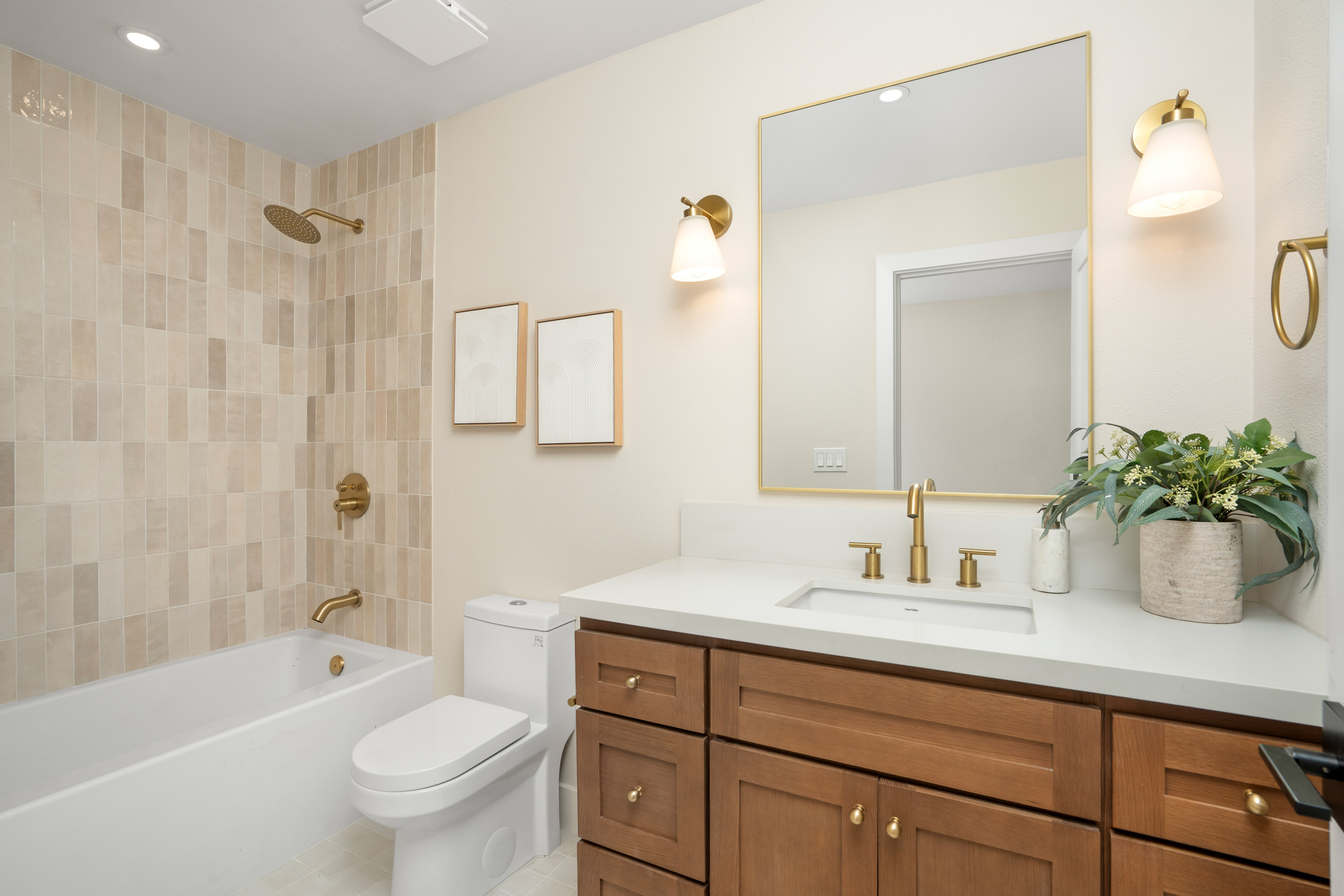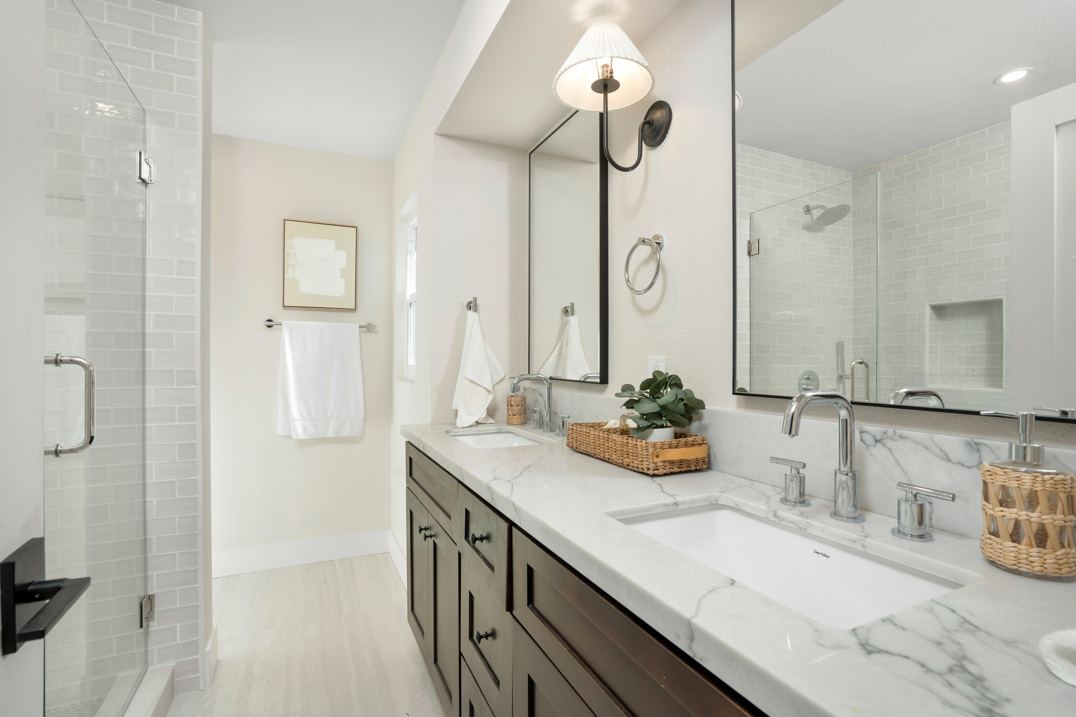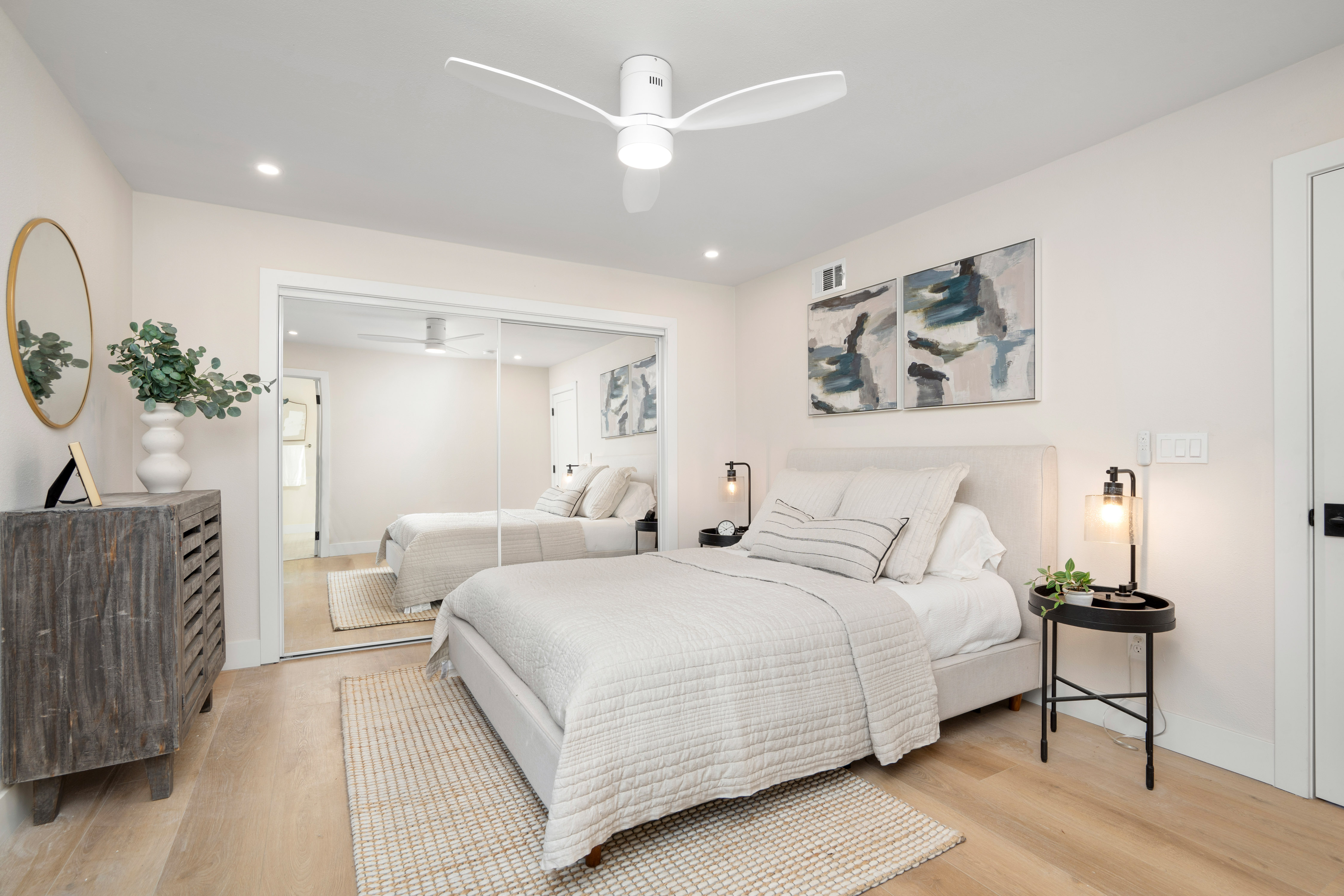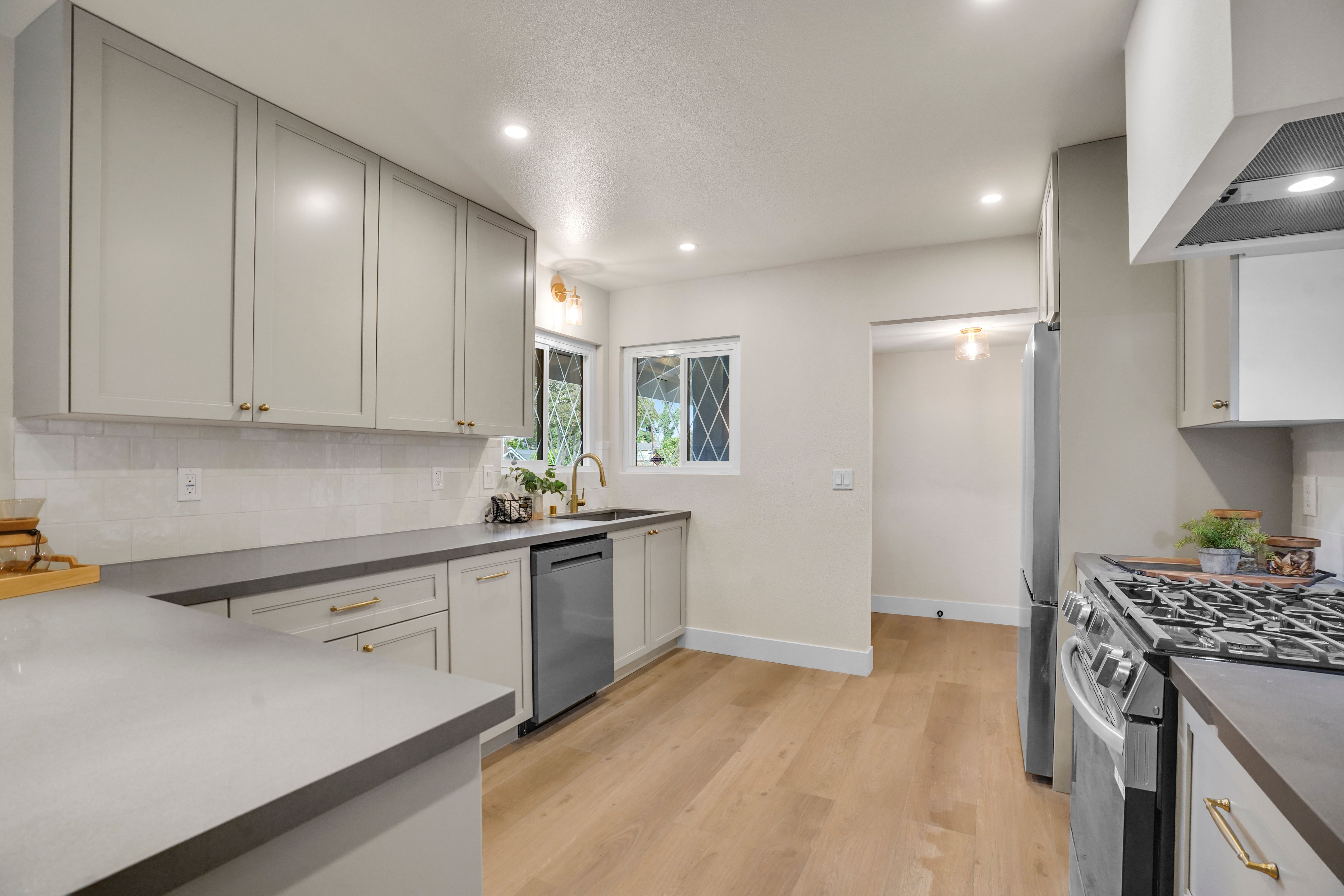 Beautifully remodeled, this luxurious single-story home features soaring ceilings, warm wide-plank flooring, and landscaped surroundings—including a tranquil pond—that reflect the area’s quiet suburban character. The open layout flows from the bright living room with a fireplace and expansive sliders to an elegant dining area with vaulted, beamed ceilings. The stunning kitchen offers shaker cabinetry, quartz countertops, stainless steel appliances, and a generous peninsula for casual seating. The serene primary suite includes soft natural light and a spa-like ensuite bath with dual vanities and an oversized shower. Three additional bedrooms are spacious and airy, while the updated hall bath showcases designer tile, warm wood cabinetry, and modern fixtures. Outdoors, the property transforms into a captivating sanctuary. The expansive backyard showcases lush greenery, meandering flagstone pathways, and mature landscaping. A tranquil pond with a waterfall feature provides a soothing backdrop to the covered patio—an inviting setting for outdoor dining, morning coffee, or evening relaxation. Surrounded by mature plantings, shade trees, and thoughtfully curated beds, the space offers exceptional privacy and year-round enjoyment. With fully owned solar for added efficiency and a location moments from parks, scenic trails, shopping, dining, and commuter routes, this exceptional Walnut residence beautifully captures the appeal of its natural, suburban setting—where comfort, nature, and modern living come together in one unforgettable home.