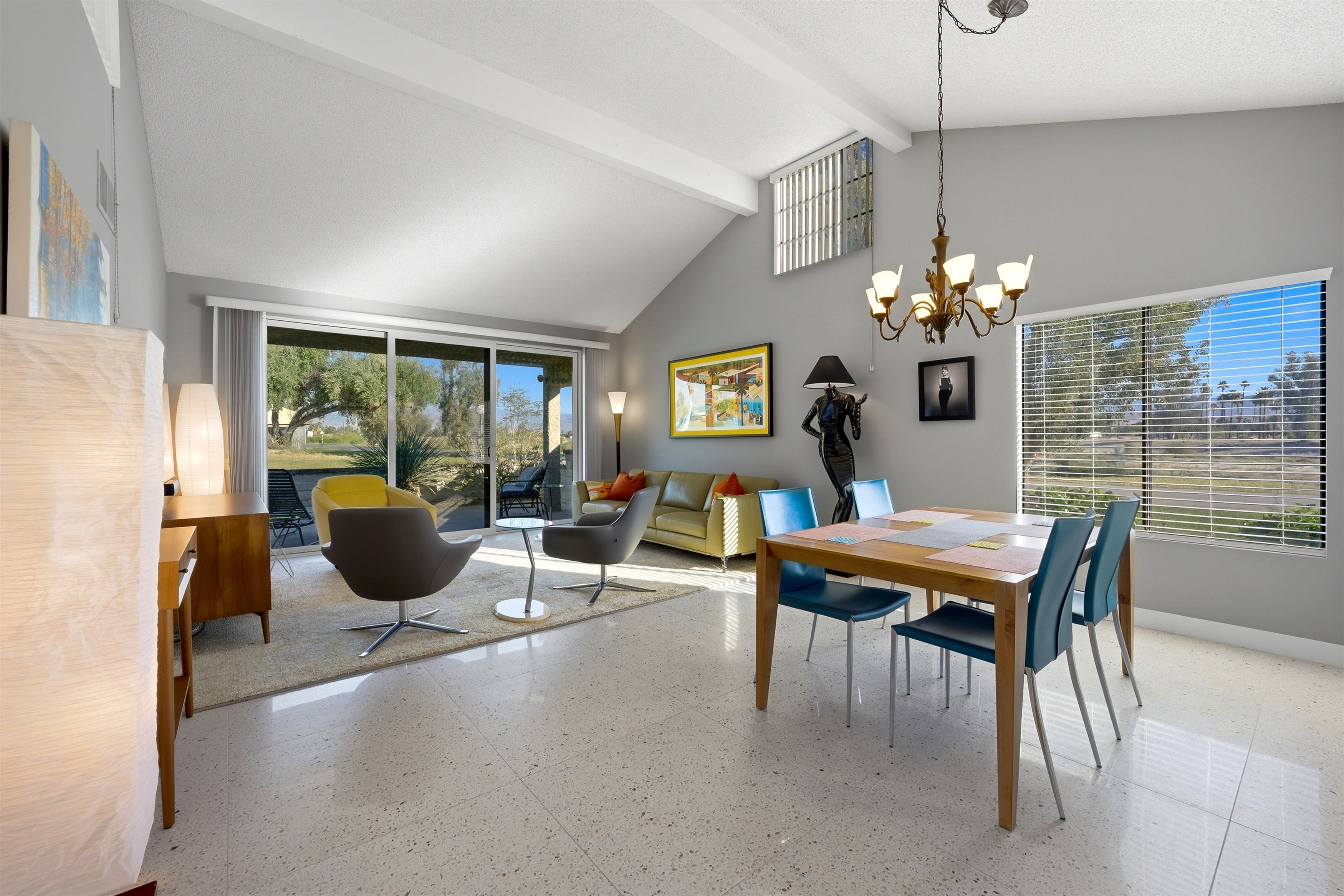 Welcome to 2821 Calle Arandas, located in the prestigious West Gate community of Cathedral Canyon Country Club. Offering 1,452 square feet of sleek, modern living space and a coveted Palm Springs address, this home balances resort-style luxury with the comforts of a private retreat. Perfectly situated at the Northern tip of Calle Arandas, this property enjoys a trifecta of captivating views - golf course, mountain, and surrounding natural landscape.Elegant new tile flooring flows seamlessly throughout the entire home. You'll love the vaulted ceilings, natural light, and open floor plan. An updated kitchen features quartz countertops, new cabinetry, and new appliances including oven/stove, dishwasher, and microwave. Beyond, a large outdoor patio offers the perfect location to soak in the morning sunshine or evening entertaining and al fresco dining.Enjoy the luxury of a spacious primary bedroom with ensuite and custom closets. Direct patio access offers views of the adjacent golf course and San Jacinto Mountains. A second bedroom, also with ensuite and custom closets, offers privacy and serenity. In the center of the home is an atrium, open to the sky, acting as a natural light well and creating an environment of tranquility.An attached 2-car garage offers storage and convenience. Additional upgrades include a new HVAC system (2024), new Milgard sliders in living room and bedrooms, and new blinds.Cathedral Canyon Country Club features 450 acres of park-like environment including an 18-hole golf course and 10 tennis courts. Proximity to shopping, restaurants, Community Amphitheater, and the Agua Caliente Casino Cathedral City. The PSP International Airport and downtown Palm Springs are just minutes away.Perfect for your full-time residence, weekend getaways or seasonal living! HOA fee includes cable TV, internet, trash/recycling, exterior maintenance, and landscaping.
