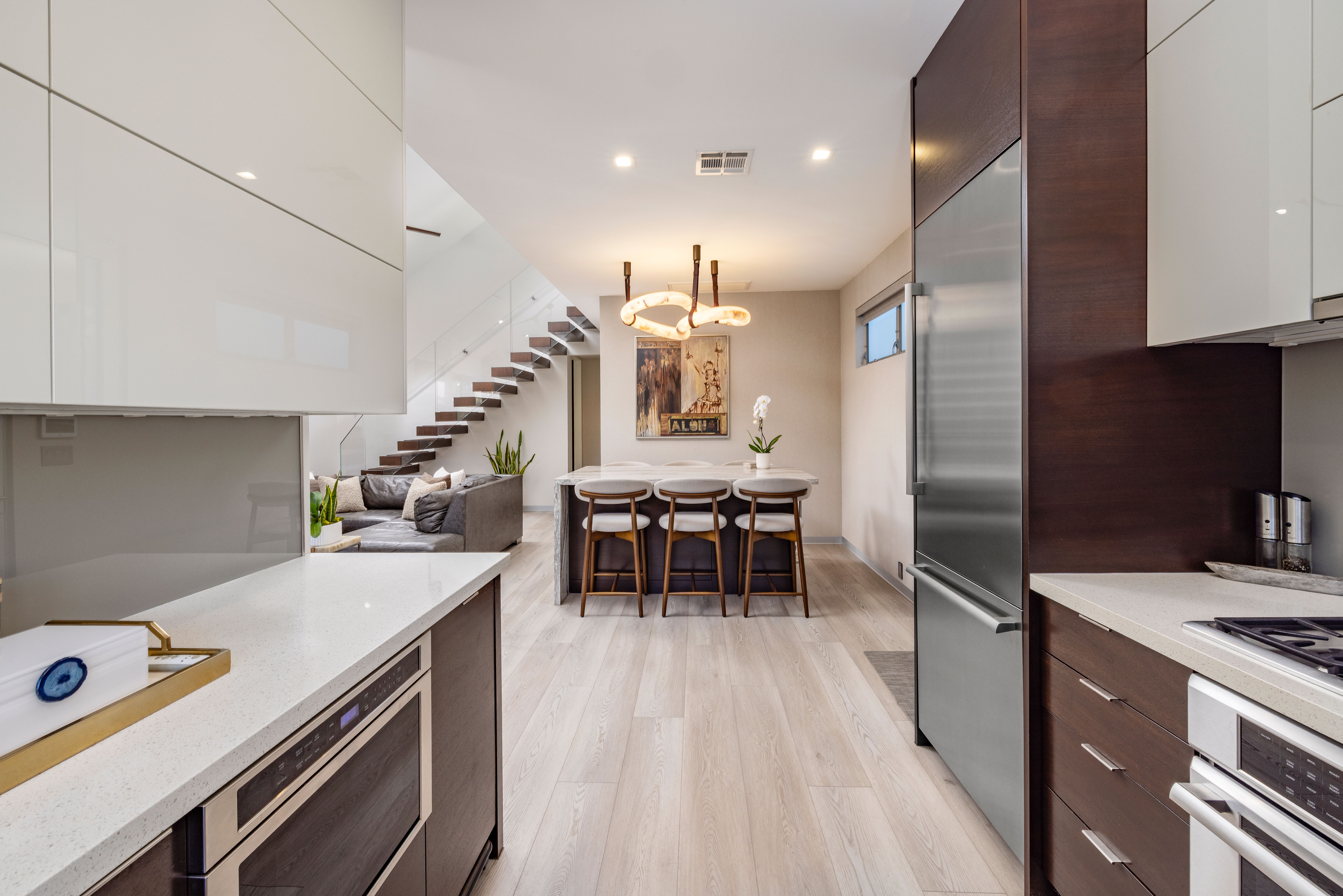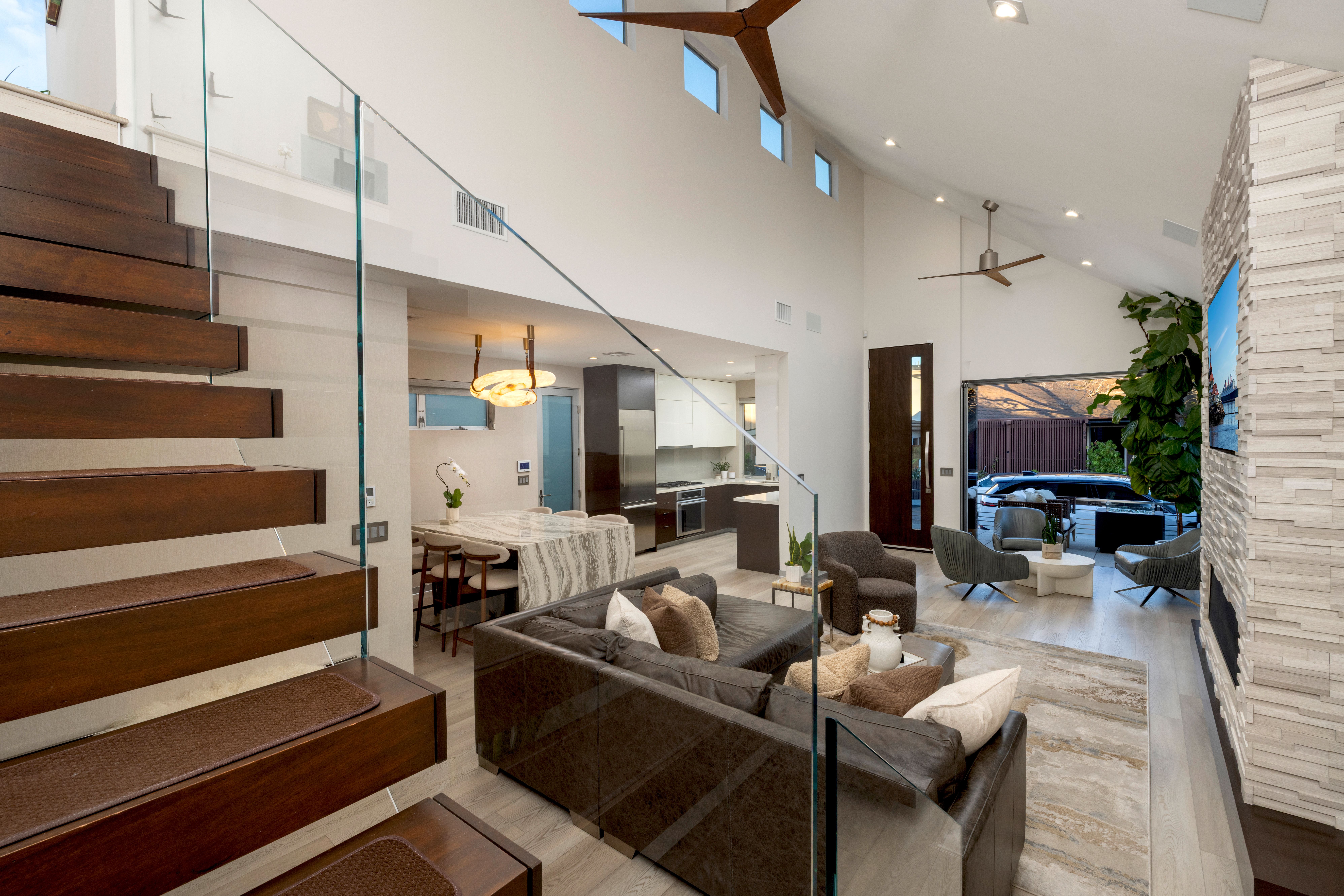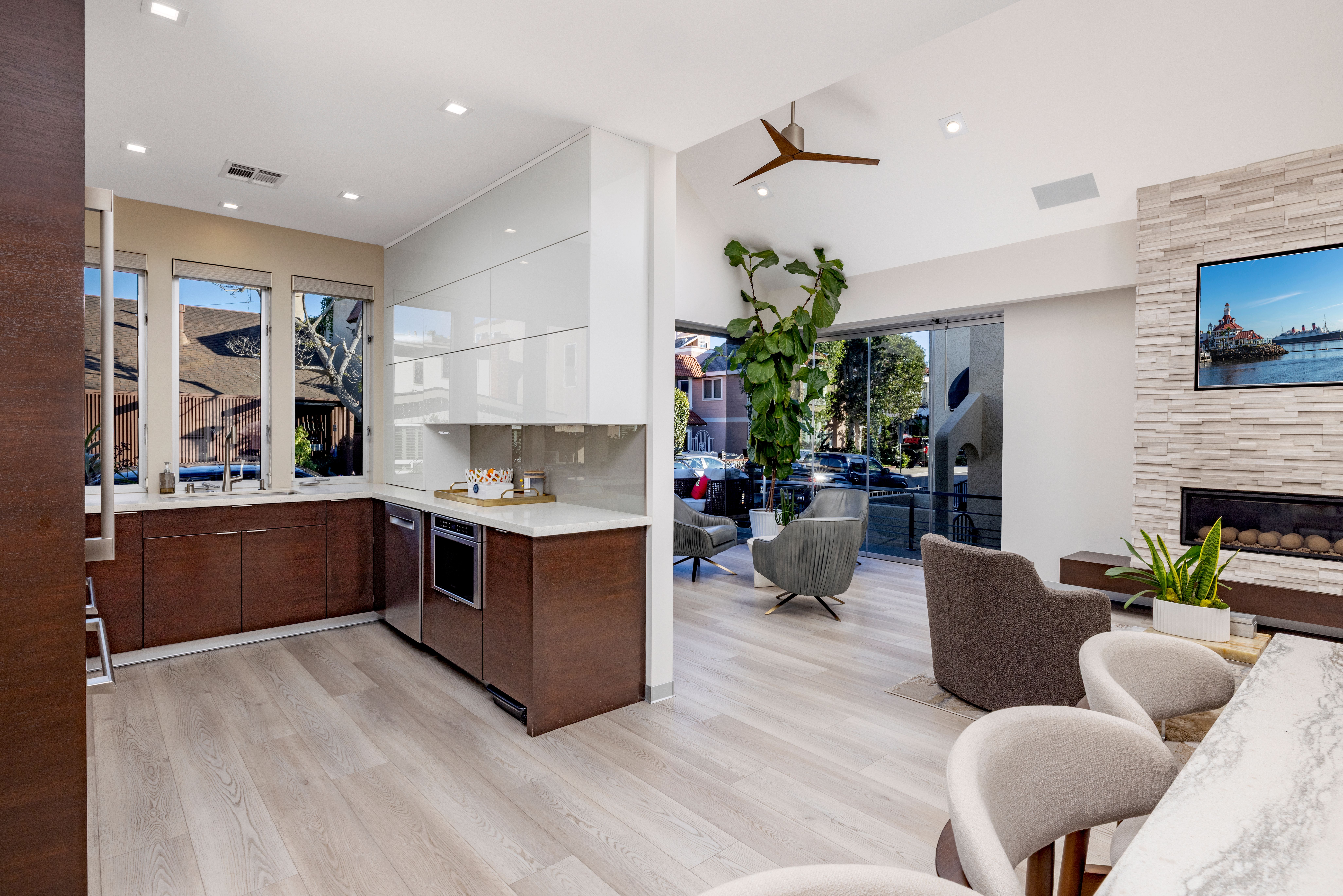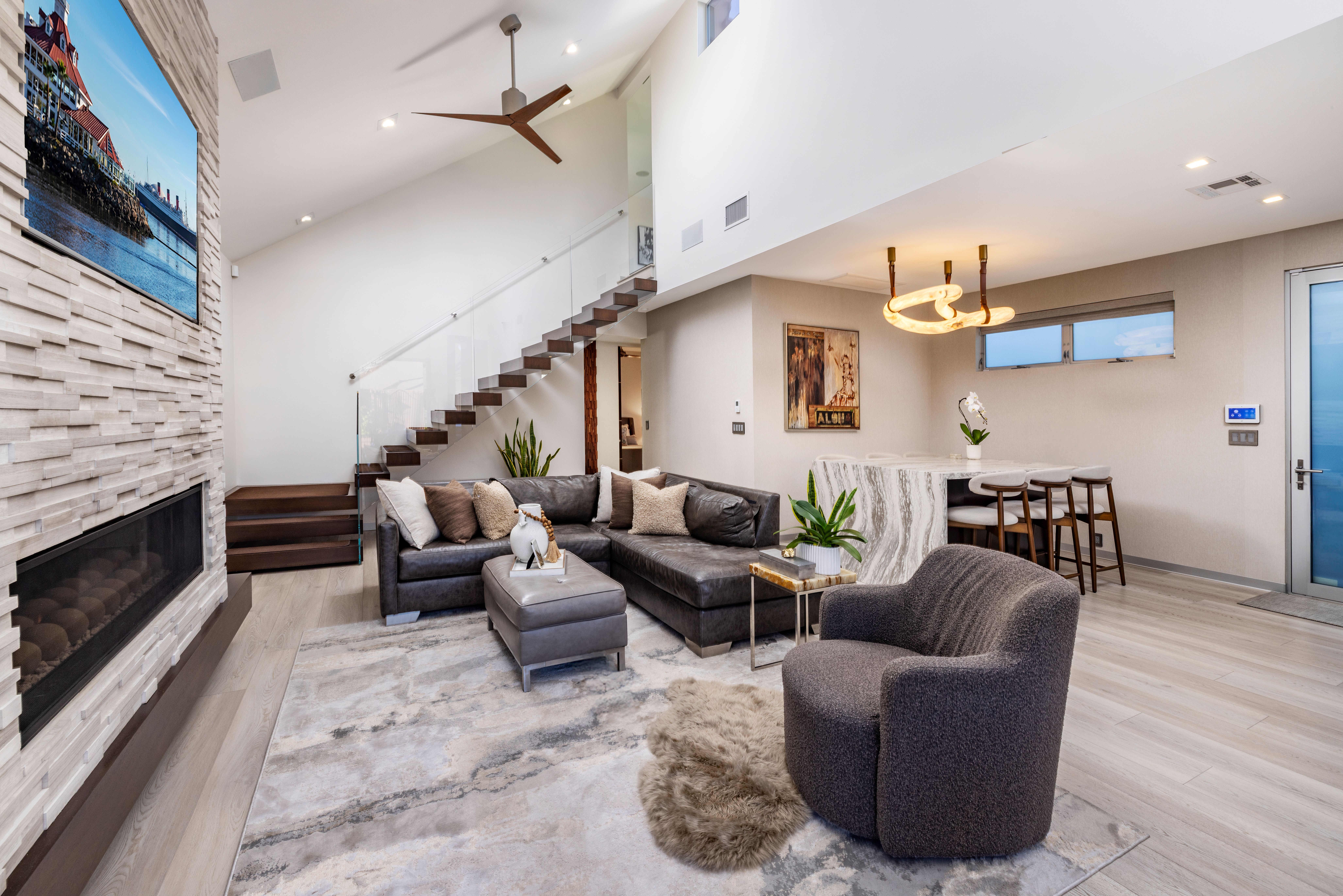 A fresh, accommodating collection of spaces reflecting a refined aesthetic and quality craftsmanship set in one of the region’s most sought-after enclaves – Naples Island. With thoughtful material and technological enhancements, this stylish property recently underwent a complete rebuild and reimagination – taken down to one pre-existing wall. Three bedrooms, two baths, and a delightful assemblage of living areas now present a bright and sophisticated environment that embodies the elements of a modern lifestyle. The carefully selected appointments and amenities are suited to discerning taste, with resilient finishes appropriate for living near the water. A small selection of details include – an oversized 10’ entry; elevated ceiling heights in the interior and the garage; barn- style doors throughout; a floating glass stair; custom millwork and built-in kitchen accoutrement hidden housings; Thermador appliances; Luxury Vinyl Plank flooring set over white porcelain tile; custom aluminum detail baseboards; designer fixtures and lighting; motorized window coverings with valances; a Sonos sound system; privacy windows on neighboring sides and engineered framing for Coverglass, optimizing the rare corner view windows; all-LED conversion interior and exterior; new electrical paneling, switches, outlets, and wiring; dual split HVAC; new PEX efficient plumbing; heavy insulation for efficiency and sound; and an installed security system. A further complement, improving the exterior experience, is a private deck – raised and modified with stainless steel railings; an outdoor shower; a 12’-height garage making it high enough to enable a car lift, along with 220V power. An extraordinary opportunity to enjoy the benefits of a sophisticated domain with ideal proximity to the highly desirable local recreation, dining, shopping, and resources.