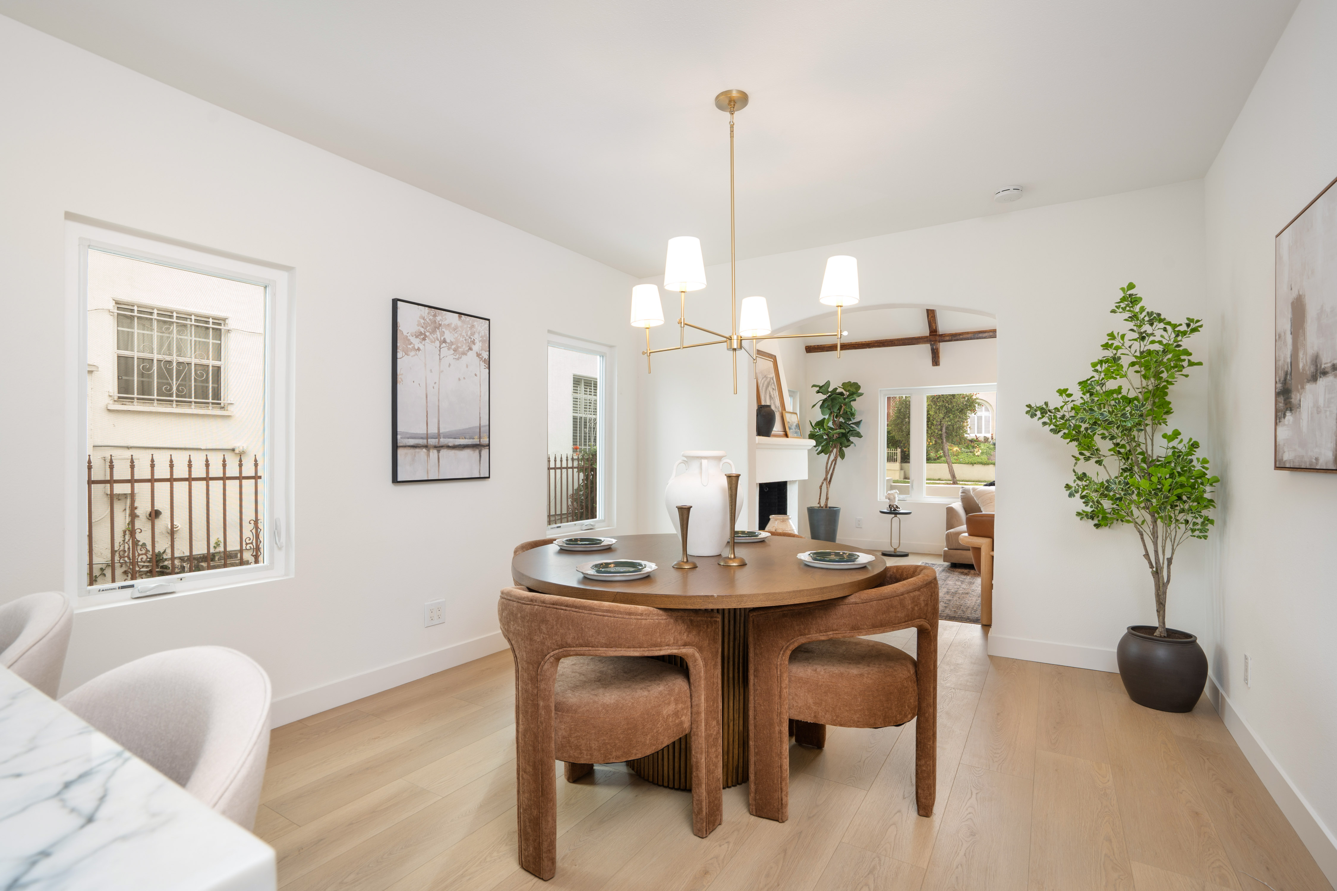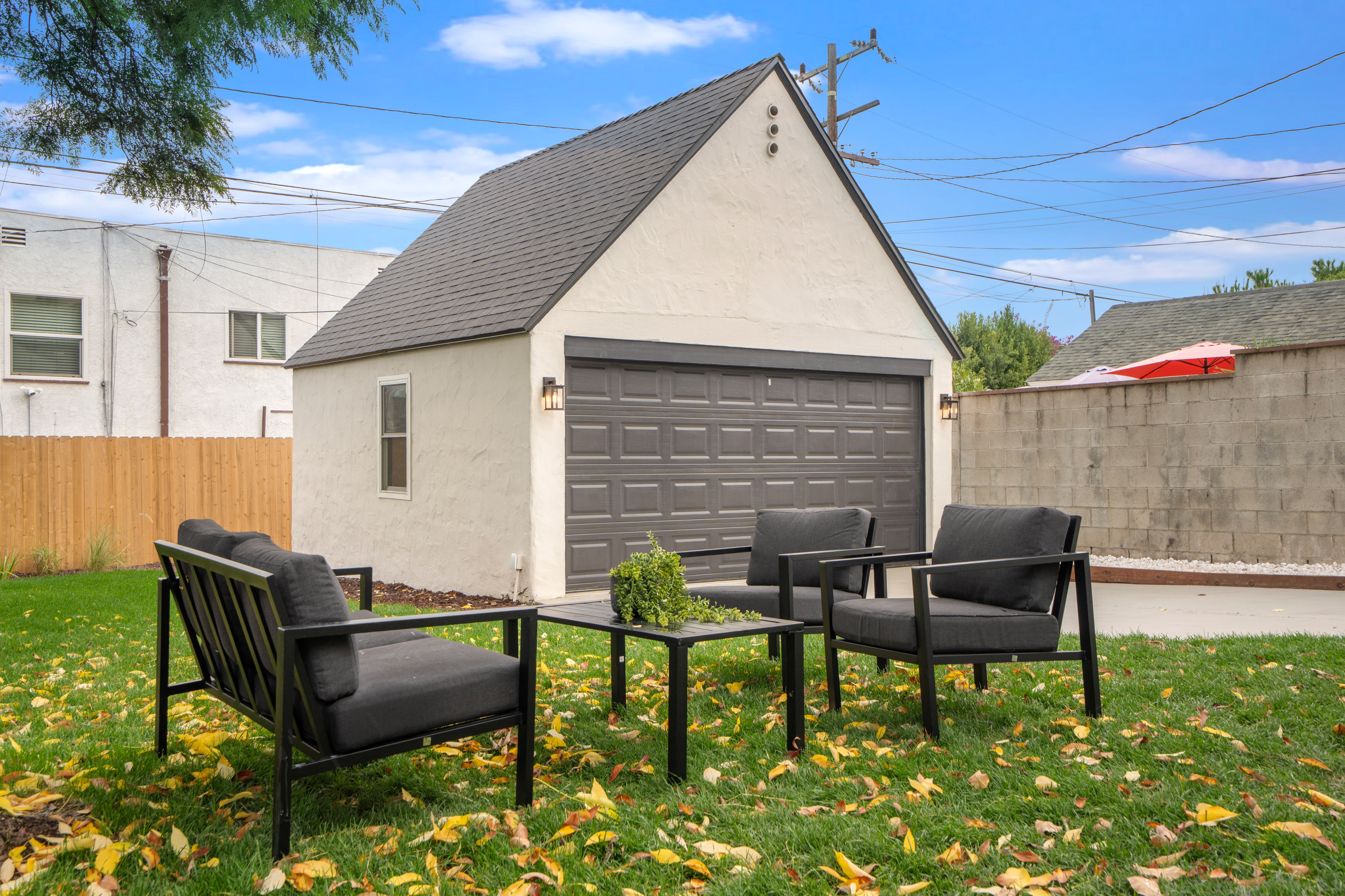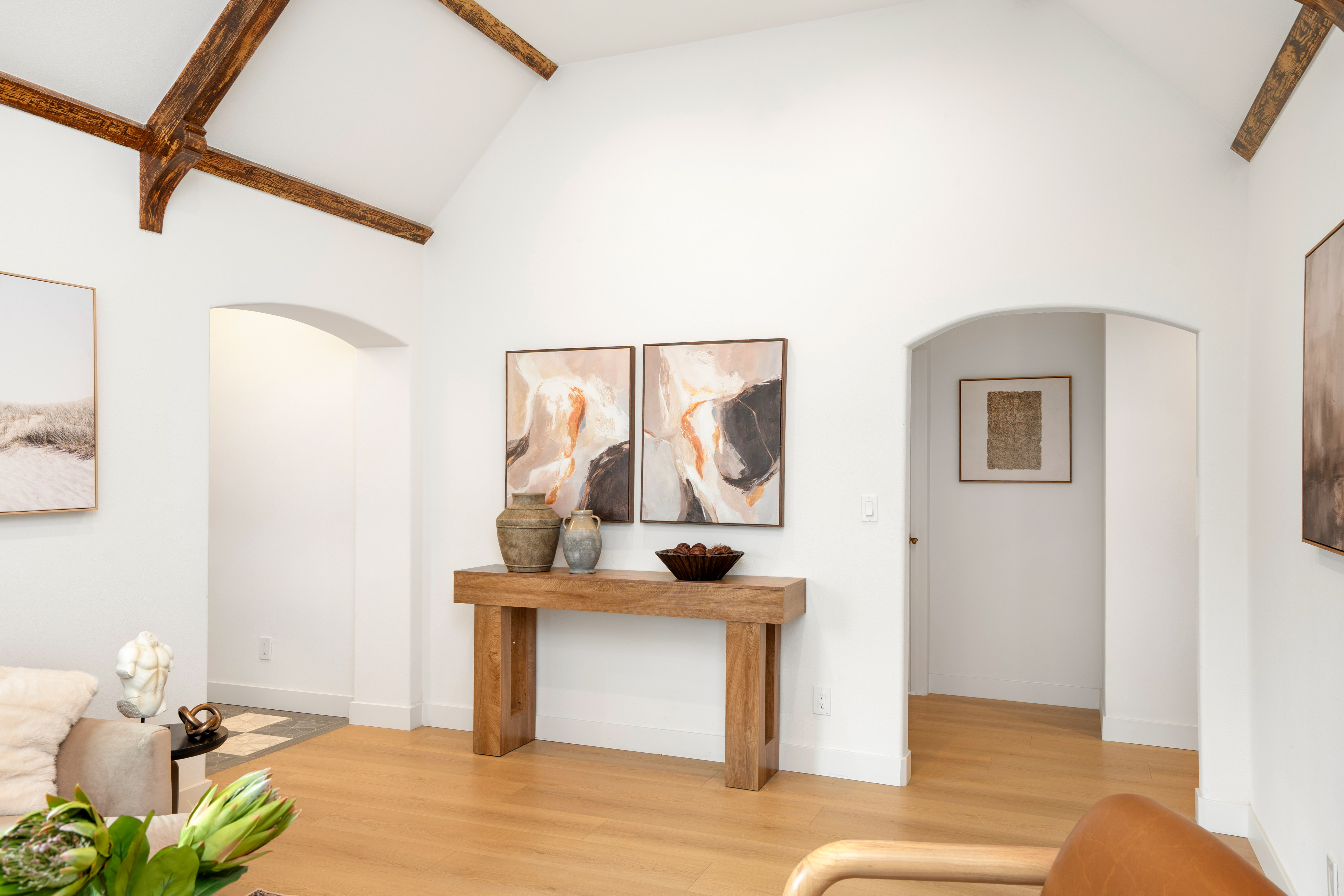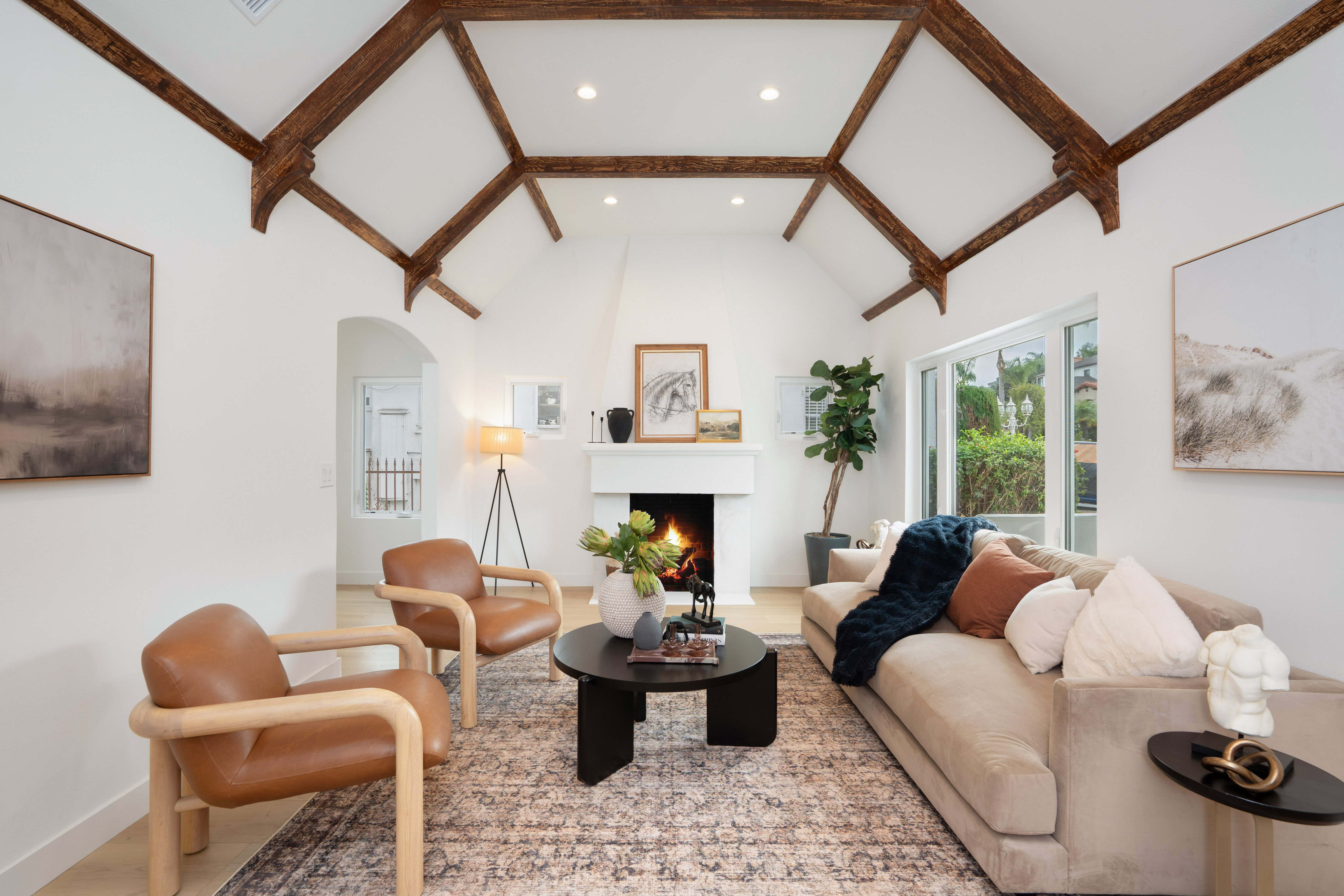 This luxurious, fully remodeled home delivers impeccable design, modern comforts, and cottage character throughout. Entering through an arched wood door, warm natural light fills the living room, where vaulted ceilings with striking exposed beams and a handsome fireplace create an unforgettable first impression, evoking the charm of a Tudor-inspired storybook home. The flow continues into a bright dining area that opens to a beautifully reimagined kitchen featuring custom cabinetry, sleek surfaces, wood-accented walls, and gleaming appliances, perfect for both everyday cooking and elevated entertaining. A peaceful primary suite and additional well-appointed bedrooms offer flexibility for guests, work, or creative spaces. Spa-inspired bathrooms showcase refined finishes, while a dedicated office nook and a spacious laundry room add everyday convenience. An inviting deck is ideal for morning coffee or evening unwinding. Beyond it stretches a generous landscaped backyard shaded by mature trees, an effortless extension of the living space. A large detached garage offers storage, parking, or potential creative use.