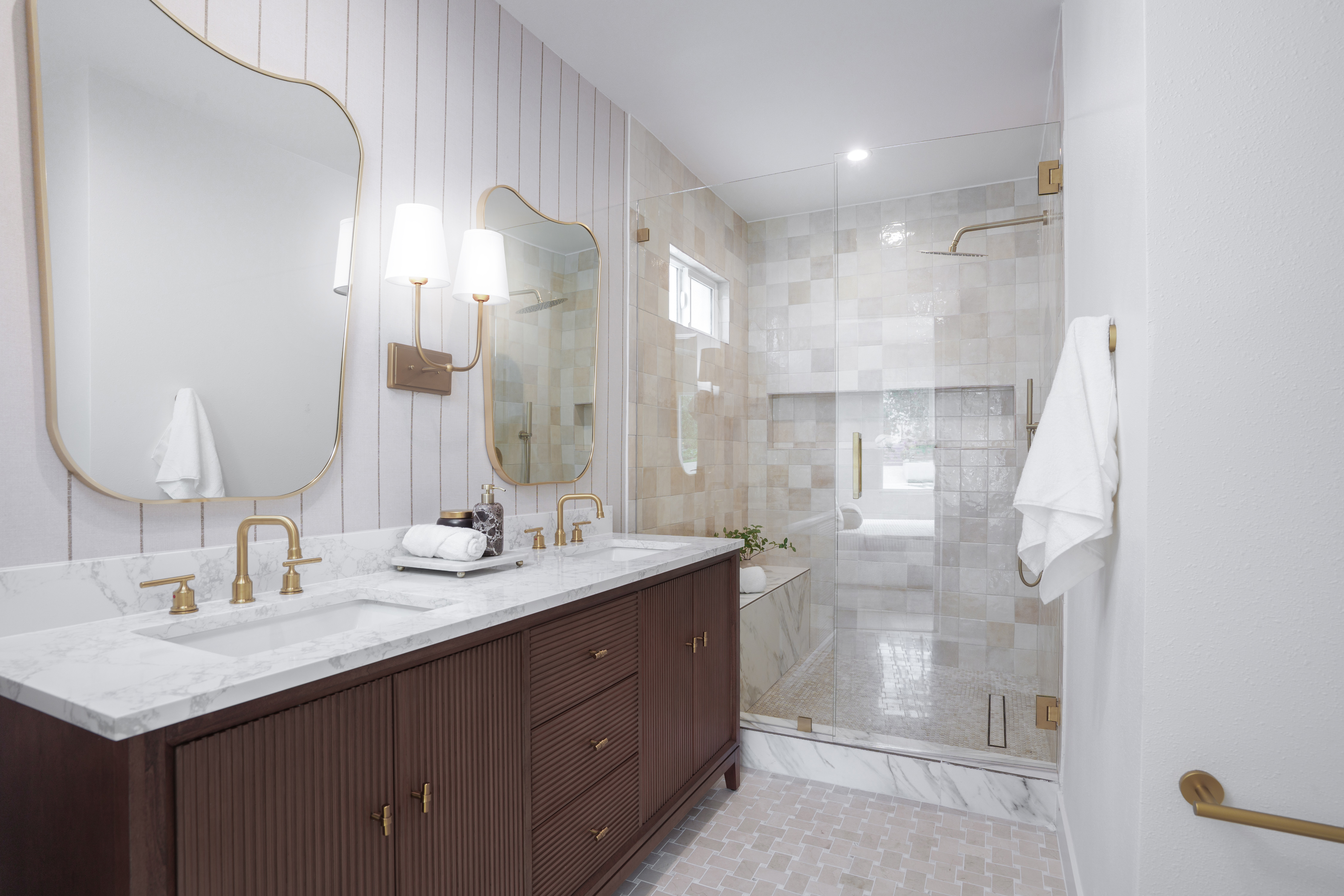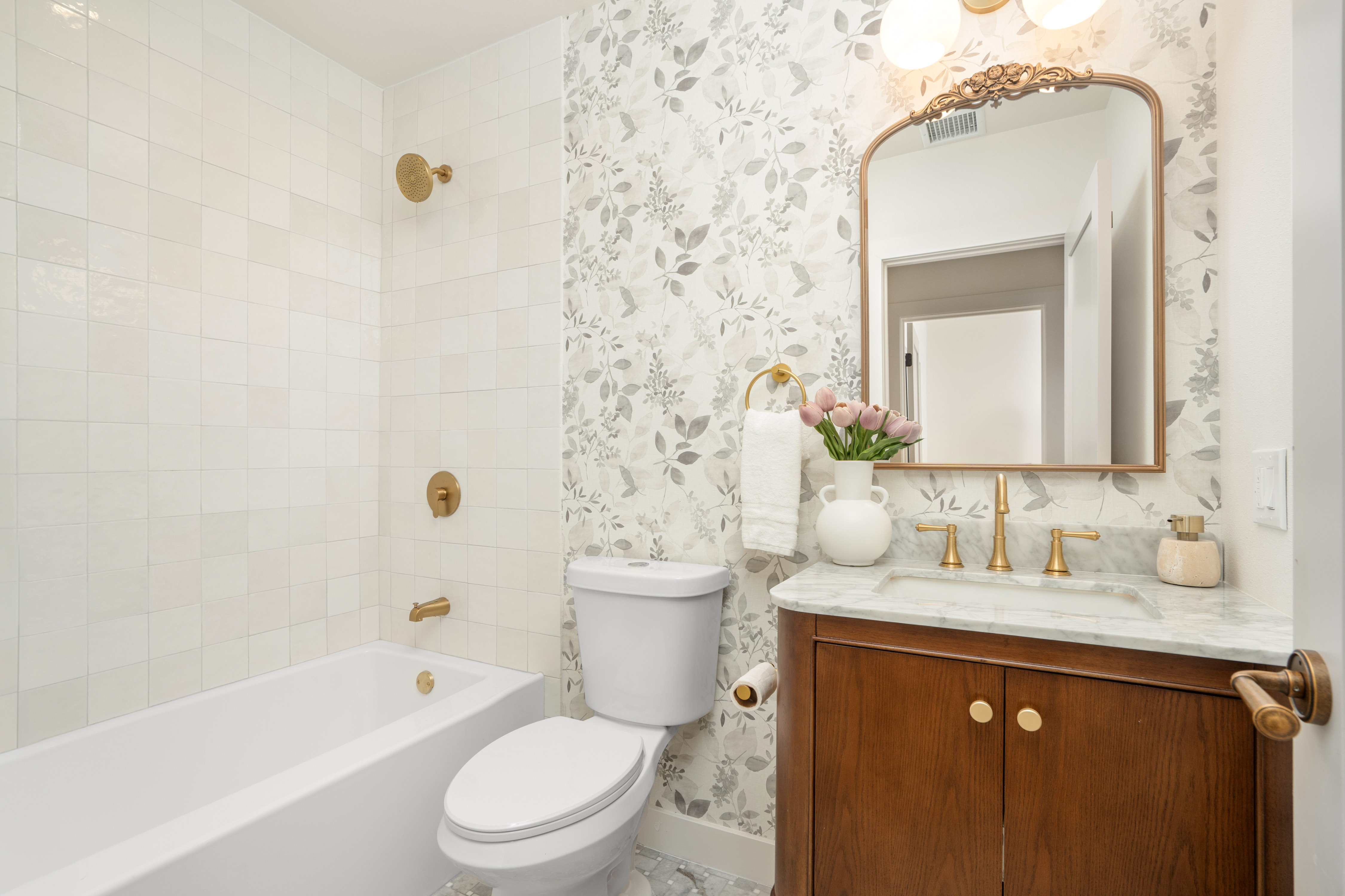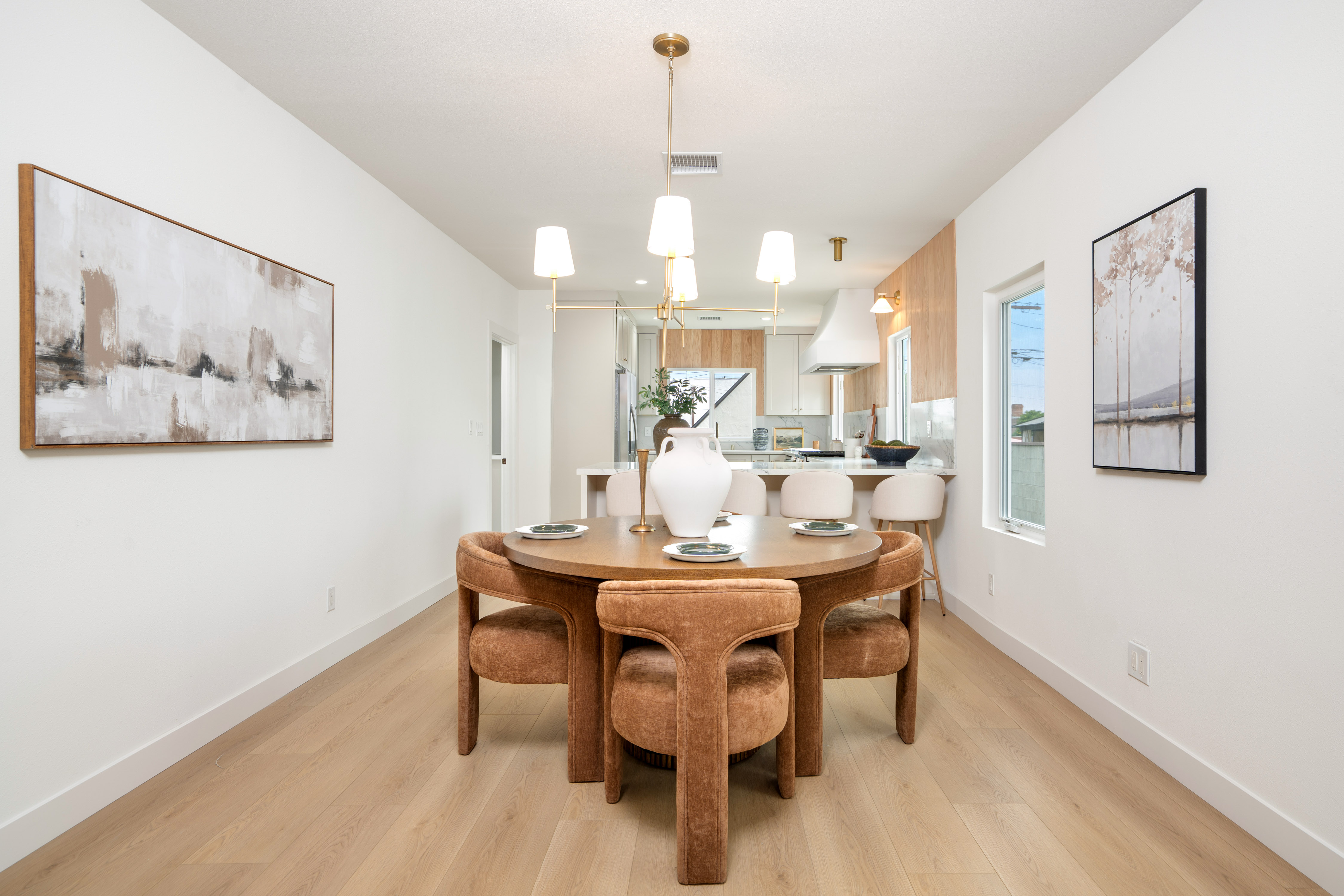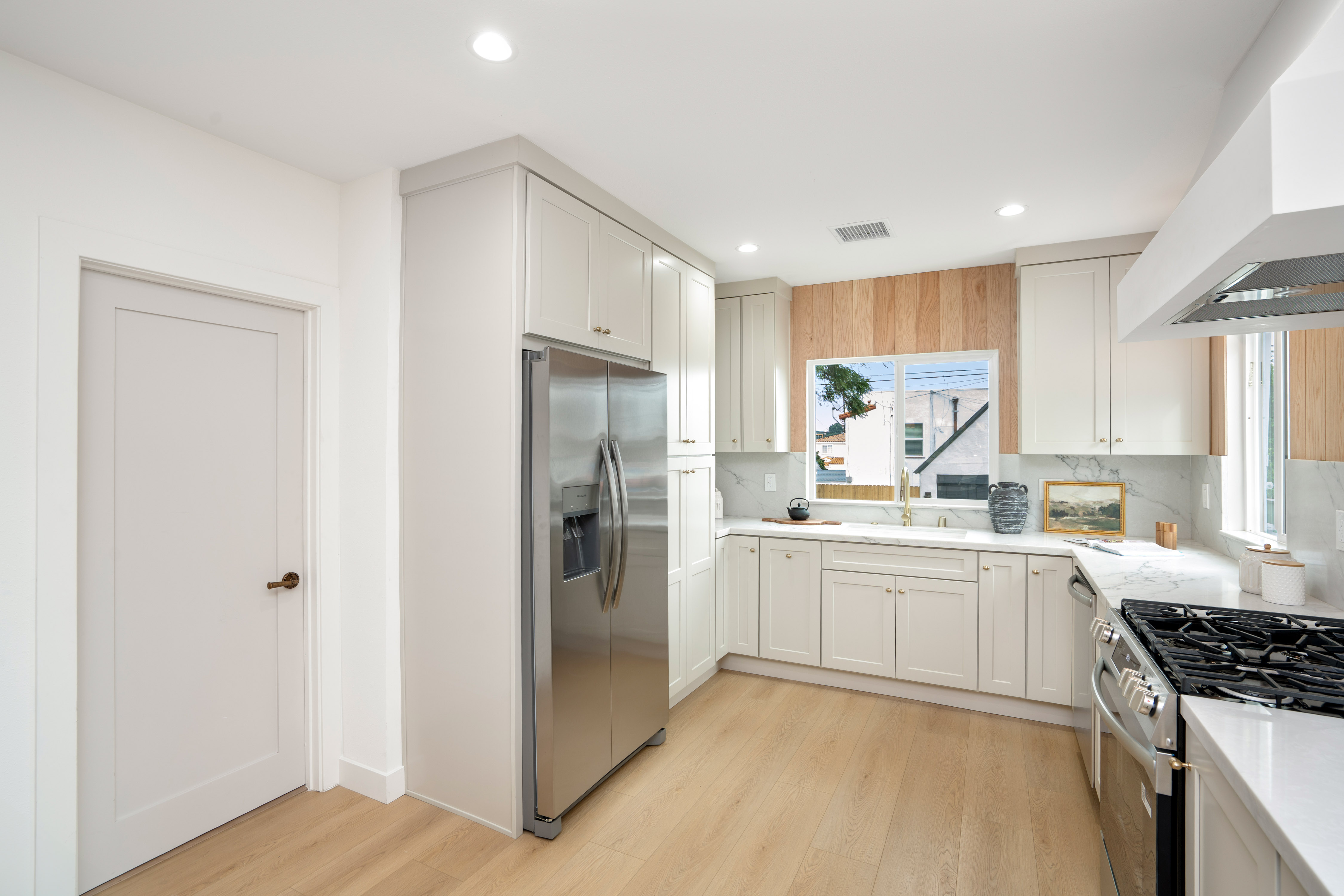 This luxurious, fully remodeled home delivers impeccable design, modern comforts, and cottage character throughout. Entering through an arched wood door, warm natural light fills the living room, where vaulted ceilings with striking exposed beams and a handsome fireplace create an unforgettable first impression, evoking the charm of a Tudor-inspired storybook home. The flow continues into a bright dining area that opens to a beautifully reimagined kitchen featuring custom cabinetry, sleek surfaces, wood-accented walls, and gleaming appliances, perfect for both everyday cooking and elevated entertaining. A peaceful primary suite and additional well-appointed bedrooms offer flexibility for guests, work, or creative spaces. Spa-inspired bathrooms showcase refined finishes, while a dedicated office nook and a spacious laundry room add everyday convenience. An inviting deck is ideal for morning coffee or evening unwinding. Beyond it stretches a generous landscaped backyard shaded by mature trees, an effortless extension of the living space. A large detached garage offers storage, parking, or potential creative use.
