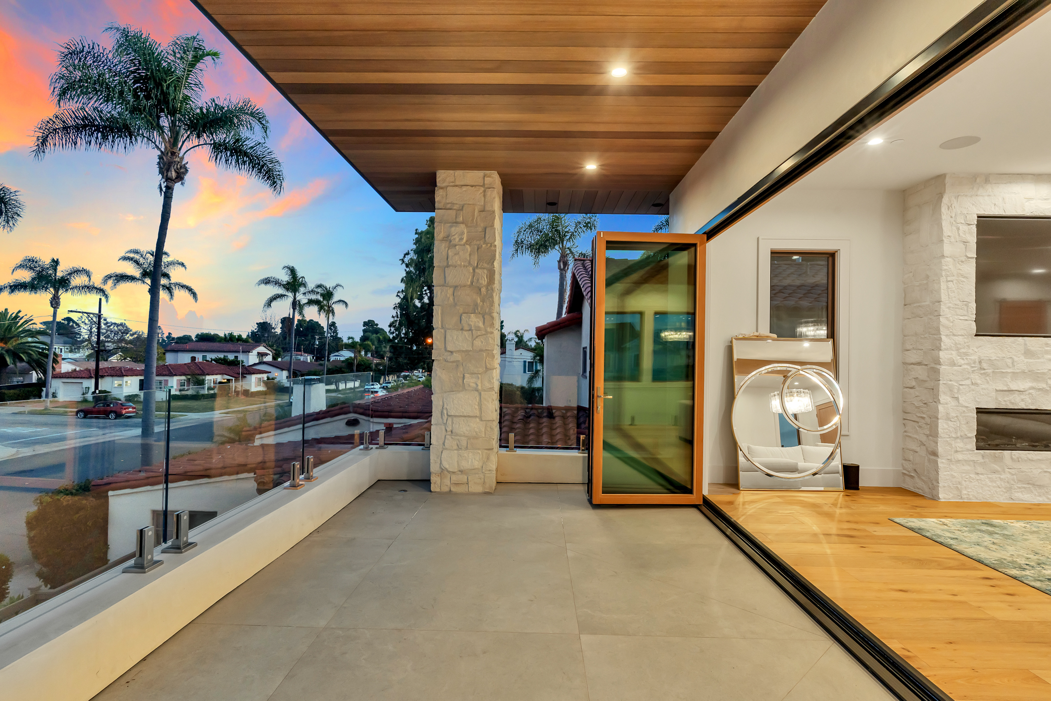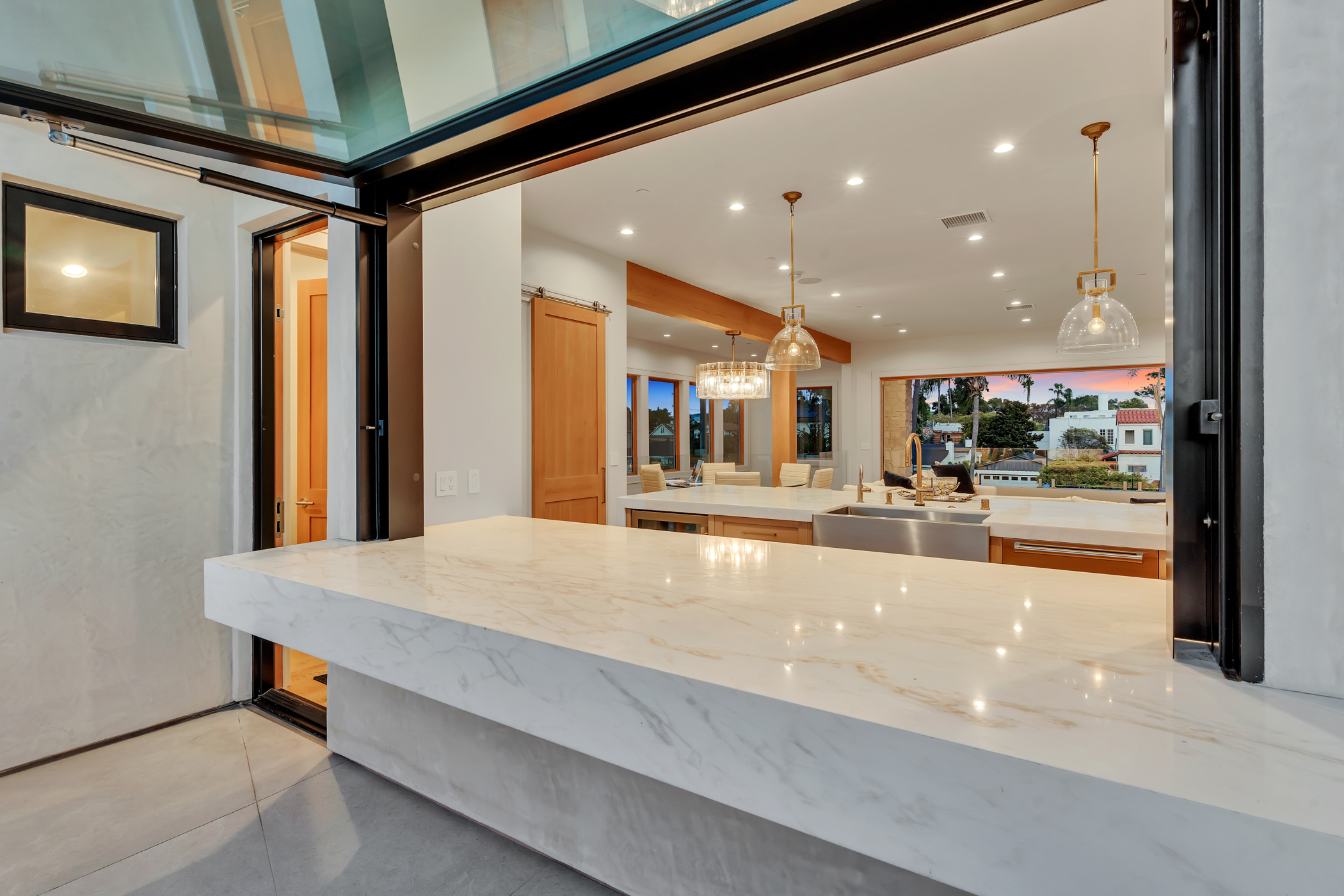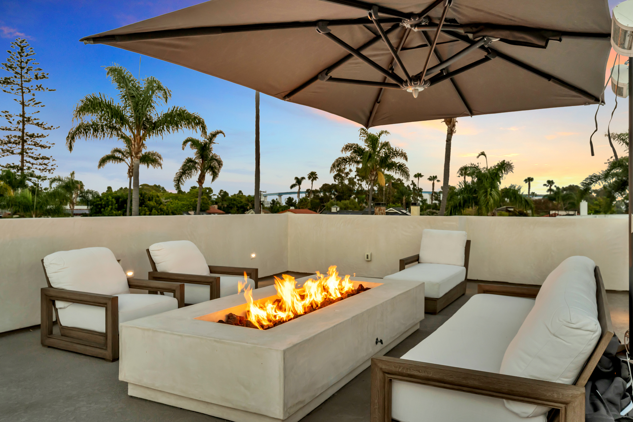Exceptional Coastal Living Near the Coronado Golf Course! This 5-bedroom, 3.5-bath residence, completed in 2024, offers approximately 3,977 square feet of thoughtfully planned interiors just moments from the Coronado Golf Course, bayfront paths, and convenient access on and off the island. Positioned to capture sweeping views of the Coronado Bay Bridge and the San Diego skyline, the home embraces indoor-outdoor living to the fullest extent. Multiple balconies and a spacious rooftop deck ideal for sunset entertaining capture breathtaking 360 degree views. The main level features an open-concept design centered around a chef’s kitchen with oversized island, Wolf appliances, custom cabinetry, and an oversized pass-through window connecting directly to outdoor dining and grilling space. Living and dining areas open to the front balcony, creating a bright and inviting gathering environment. One of 5 large bedrooms, the primary suite offers a private retreat with vaulted ceilings, skylights, fireplace, spa-inspired bath with soaking tub and multi-head shower, and custom wardrobe storage. A secondary suite and additional bedrooms provide flexibility for guests, remote work, or extended stays. Additional highlights include elevator access to all three levels, a light-filled lower level with bedrooms and media space, and carefully curated architectural finishes throughout, including a masterfully engineered floating staircase. A compelling opportunity to own a top of the line contemporary Coronado home with impressive scale, views, and modern amenities in a prime location.