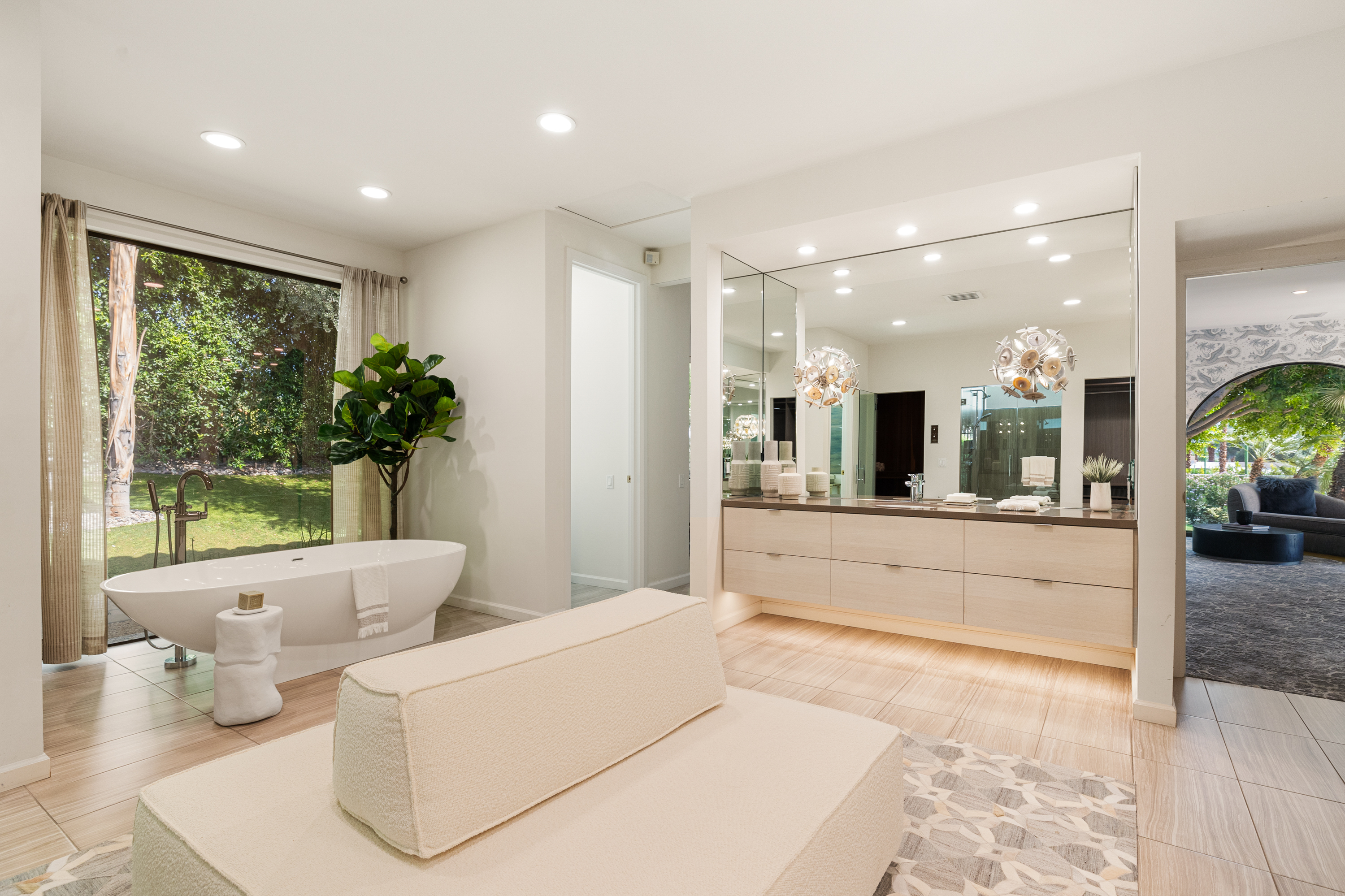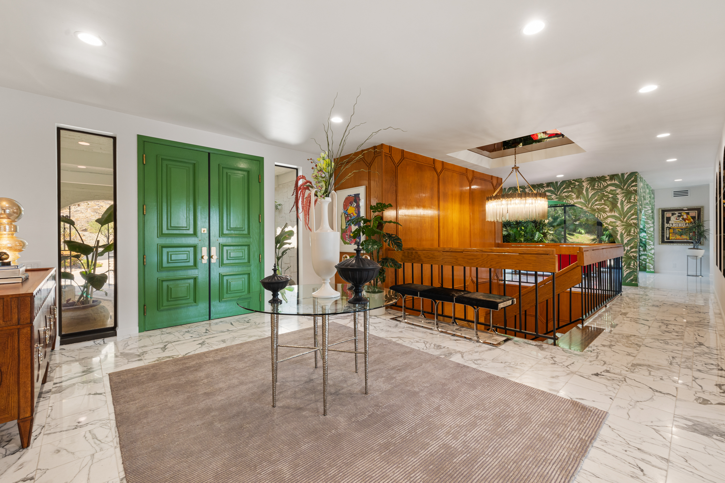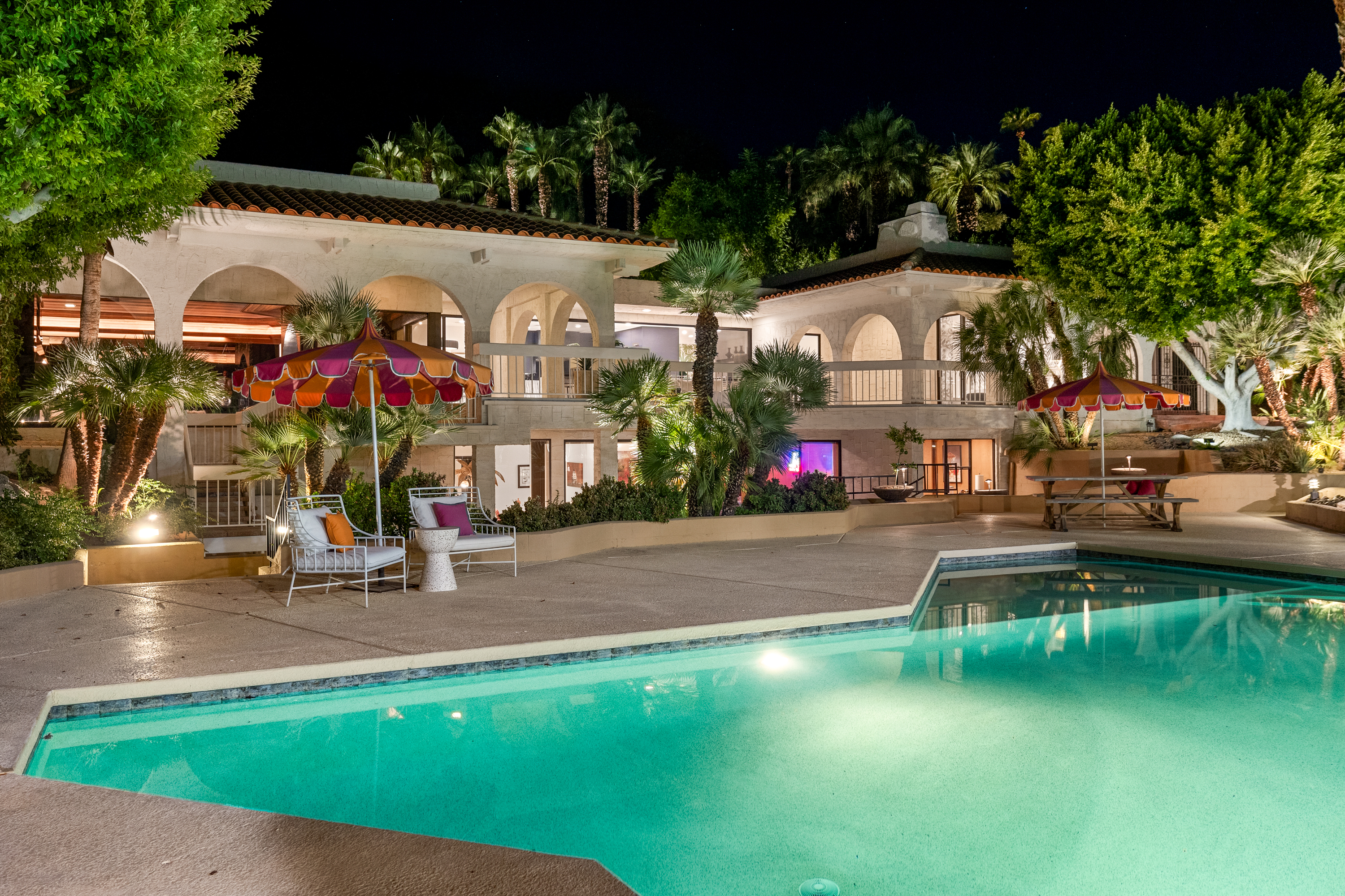 Offered TURNKEY with designer furnishings, decor, and sundries included! Opportunity for a move-in ready desert retreat. Perched at the top of a private cul-de-sac in the guard-gated enclave of Thunderbird Heights lies an expansive oasis that combines timeless architecture with artful design and modern luxury. This sprawling 6-bedroom, 5-bath estate a sanctuary created to inspire, entertain, and indulge. Reimagined by designer Leslie Bock and formerly owned by celebrated songwriter and music producer Michael Masser (and visited by Diana Ross, Barbara Streisand, Neil Diamond, and Whitney Houston) this home carries a legacy of creativity that resonates throughout. Every detail and space is designed to spark connection and wonder. The expansive living area is centered by a dramatic fireplace and retro-chic sunken conversation pit, flowing seamlessly into a sleek wet bar and dining area for lingering evenings with friends. The chef's kitchen is a showpiece boasting terrazzo flooring, floor-to-ceiling custom cabinetry, top-of-the-line appliances, and a large pass-through window to the upper terrace for effortless indoor-outdoor entertaining. Take a moment to relax in the glamorous Versace-wrapped atrium lounge, which feels like a modern-day salon in the French Riviera perfect for morning coffee or afternoon tea. The primary suite is an indulgent hideaway overlooking lush landscaping. It features a spa-inspired bath with a soaking tub, steam shower, sauna, dual vanities, a walk-through custom closet, and a private yoga room. Each ensuite guest room offers a curated, yet easily reimagined escape, and direct outdoor access through its floor-to-ceiling glass sliders. The lower level offers a massive rumpus room with kitchenette, poolside lounge and shower room, additional guest/staff room, laundry, and wine storage. Outdoors, experience a tropical wonderland. Multiple terraces with graceful arches provide both grand entertaining spaces and quiet corners. The resort-style backyard is a private paradise complete with a shimmering pool and spa, a sunken and fully lit tennis court, lounging and dining areas, fragrant fruit trees, irreplaceable Ficus, and more than 50 soaring palms swaying over your sun-soaked desert escape. 70663 Oroville Circle isn't just a residence it's a bold statement in luxury, lifestyle, and design, carrying forward a decades-long legacy of inspiration and creativity.
