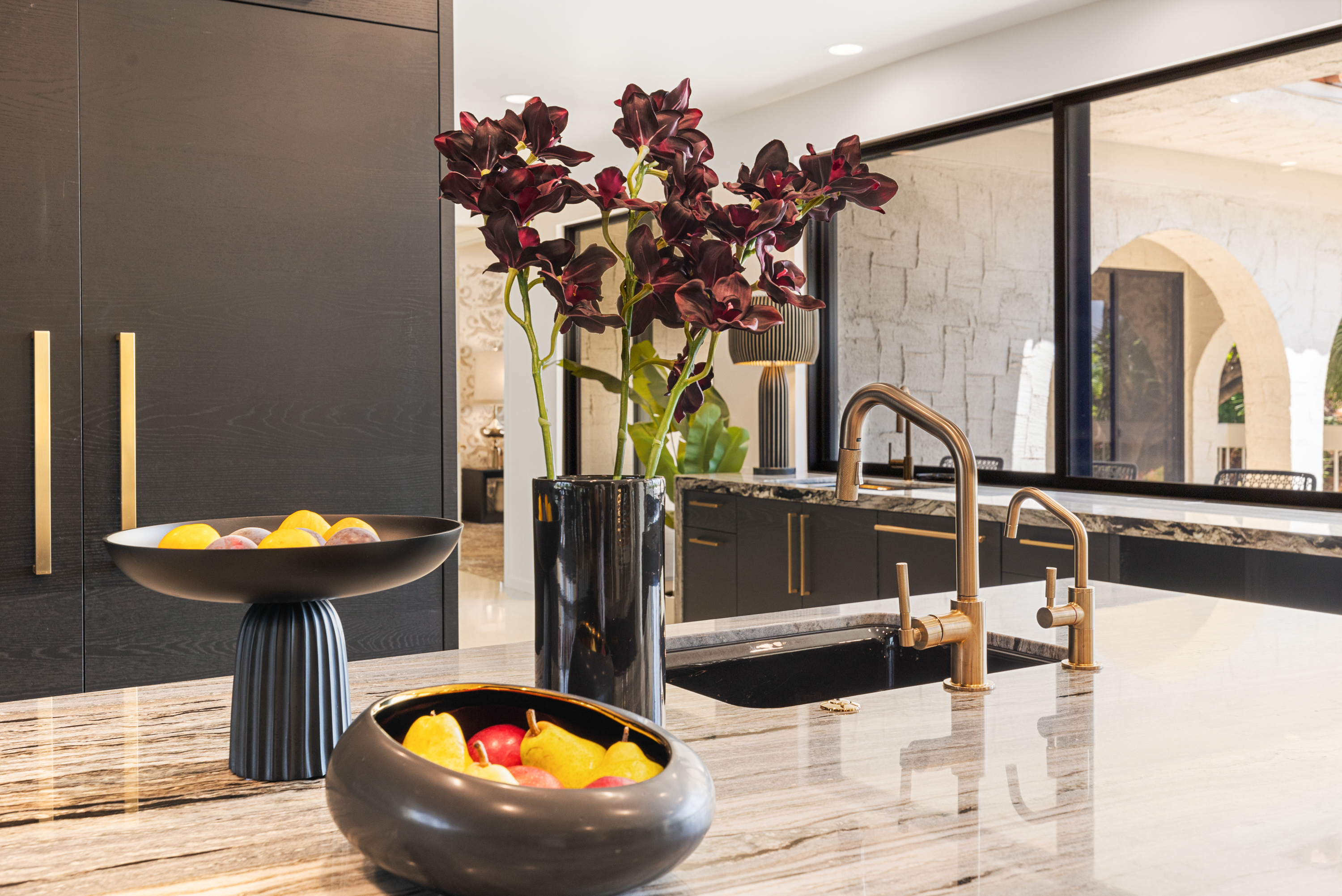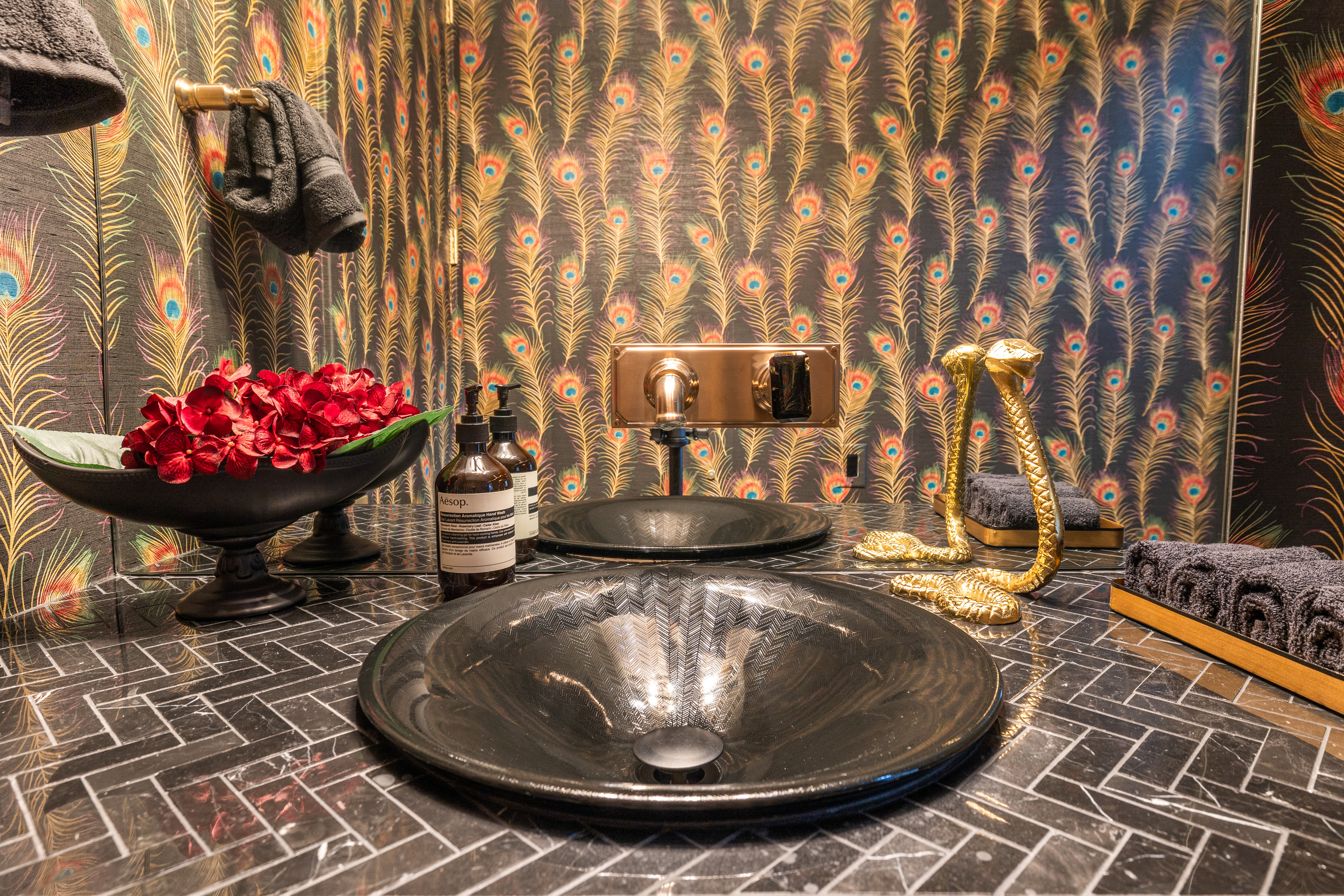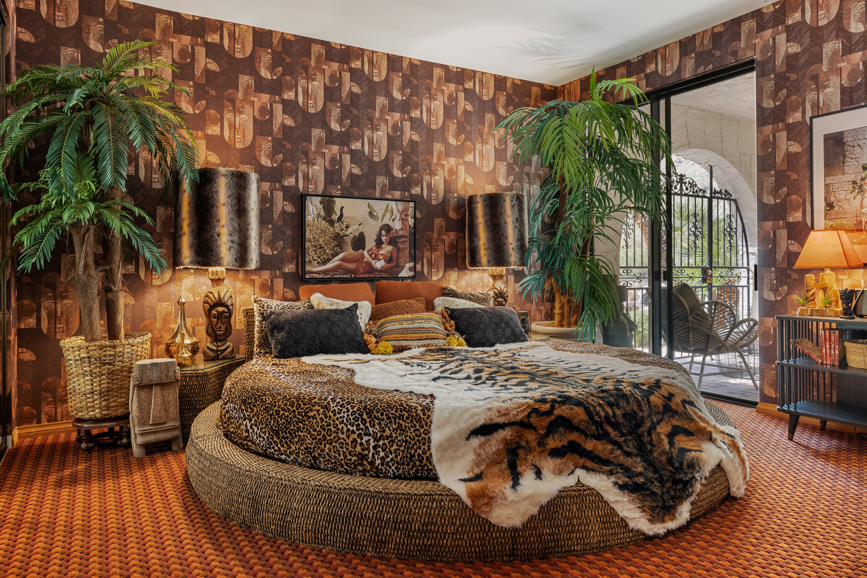 Offered TURNKEY with designer furnishings, decor, and sundries included! Opportunity for a move-in ready desert retreat. Perched at the top of a private cul-de-sac in the guard-gated enclave of Thunderbird Heights lies an expansive oasis that combines timeless architecture with artful design and modern luxury. This sprawling 6-bedroom, 5-bath estate a sanctuary created to inspire, entertain, and indulge. Reimagined by designer Leslie Bock and formerly owned by celebrated songwriter and music producer Michael Masser (and visited by Diana Ross, Barbara Streisand, Neil Diamond, and Whitney Houston) this home carries a legacy of creativity that resonates throughout. Every detail and space is designed to spark connection and wonder. The expansive living area is centered by a dramatic fireplace and retro-chic sunken conversation pit, flowing seamlessly into a sleek wet bar and dining area for lingering evenings with friends. The chef's kitchen is a showpiece boasting terrazzo flooring, floor-to-ceiling custom cabinetry, top-of-the-line appliances, and a large pass-through window to the upper terrace for effortless indoor-outdoor entertaining. Take a moment to relax in the glamorous Versace-wrapped atrium lounge, which feels like a modern-day salon in the French Riviera perfect for morning coffee or afternoon tea. The primary suite is an indulgent hideaway overlooking lush landscaping. It features a spa-inspired bath with a soaking tub, steam shower, sauna, dual vanities, a walk-through custom closet, and a private yoga room. Each ensuite guest room offers a curated, yet easily reimagined escape, and direct outdoor access through its floor-to-ceiling glass sliders. The lower level offers a massive rumpus room with kitchenette, poolside lounge and shower room, additional guest/staff room, laundry, and wine storage. Outdoors, experience a tropical wonderland. Multiple terraces with graceful arches provide both grand entertaining spaces and quiet corners. The resort-style backyard is a private paradise complete with a shimmering pool and spa, a sunken and fully lit tennis court, lounging and dining areas, fragrant fruit trees, irreplaceable Ficus, and more than 50 soaring palms swaying over your sun-soaked desert escape. 70663 Oroville Circle isn't just a residence it's a bold statement in luxury, lifestyle, and design, carrying forward a decades-long legacy of inspiration and creativity.