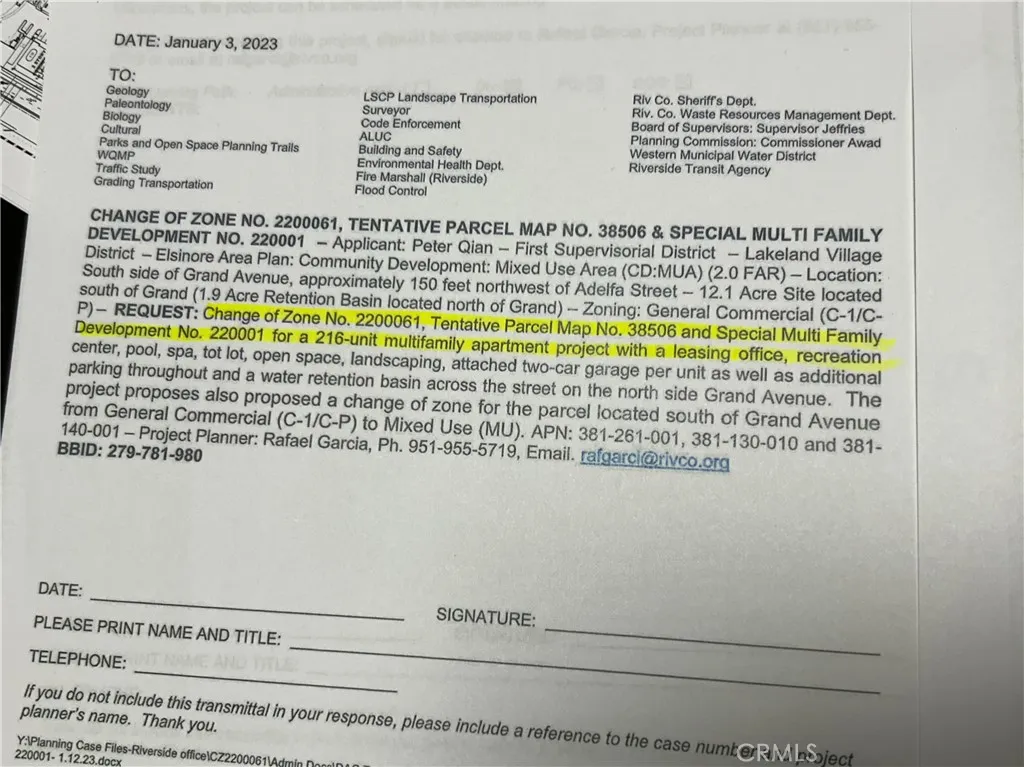 Here is an Opportunity to own a commercial land with lake view. Land is Located in Lake Elsinore on the Grand Ave and Adelfa Street with easy access to orange county. Four lot adjacent to other with around 140 feet frontage on the Grand avenue. This land is a 100% usable flat lot with C1 Zoning on a major street. Listing price includes 4 lots each with 7840 sqft, 871 sq ft., 6969 Sq. Ft and 6534sqft and ait use to have a water well permit. Parcels number for lots and well are; 381-261-002, 381-261-003, 381-261-004 and 381-261-005. Grand avenue is four lanes paved street with street curb and sidewalk. The land has access to city sewer electricity and water lines. Next door parcel nymber 1 has a proposed 216 unit multifamily apartment project which will be built soon. Hurry and pick up this lot for investment.Please see supplements for more information.