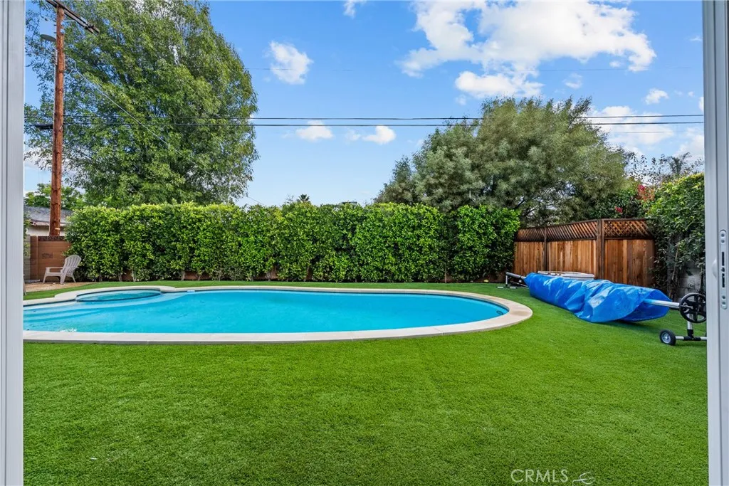 Stunning Modern Remodel with Pool, Spa & Flexible Studio Space Beautifully remodeled contemporary home in North Hills with designer upgrades throughout. Featuring smooth-coated walls, fresh interior/exterior paint, and brand-new light-colored laminate flooring, this home offers modern comfort and style. The open-concept kitchen includes white shaker cabinets, quartz countertops, stainless steel appliances, and a large island that anchors the space. All bathrooms have been fully renovated with premium finishes, custom tile work, and modern fixtures. Washer and dryer included. The backyard is a private resort-style retreat with new turf landscaping, a sparkling swimming pool, spa, and a newly finished patio ideal for outdoor dining and relaxation. A standout feature is the ADU-style bonus studio with its own newly remodeled bathroom showcasing marble-style tile and brass fixtures, plus a kitchenette with shaker cabinetry, cooktop, microwave, and refrigerator. This versatile space is perfect for an office, studio, etc. Conveniently located near Granada Hills and Porter Ranch to the North, Encino and Sherman Oaks to the south with easy access to the 405 and 118 freeways, this turn-key property delivers contemporary living, functional versatility, and exceptional outdoor amenities.