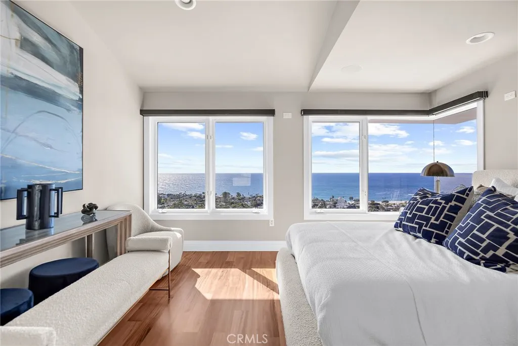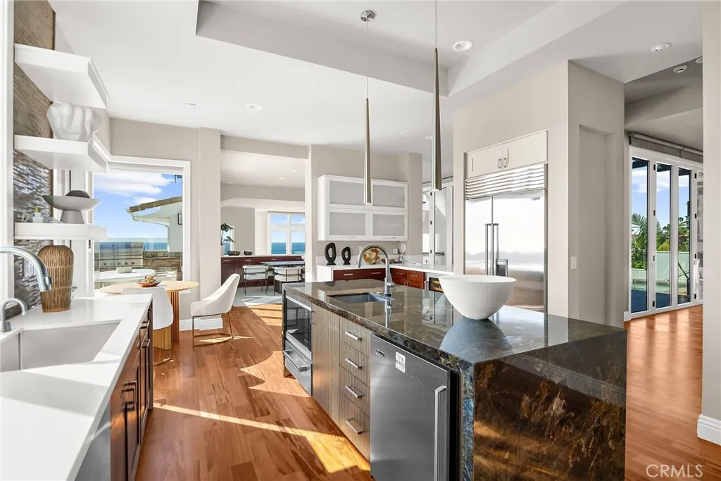 Set above one of Laguna Beachs most iconic stretches of coastline, this rare estate offers sweeping, unobstructed panoramic views of Catalina Island and Main Beach. Positioned on a gated one-third-acre lot, the residence stands with commanding presence and spans more than 6,200 square feet of refined living space, thoughtfully designed to frame the Pacific at every turn. An infinity-edge pool appears to merge seamlessly with the ocean, complemented by sculpted hardscape, curated coastal landscaping, a beautifully appointed patio with a built-in BBQ grill overlooking the ocean and South Laguna Beach, a generously sized and meticulously maintained backyard ideal for pets or gardening, a spacious three-car garage with EV chargers and refined ocean-view windows, and an expansive six-car motor court designed for the discerning automotive enthusiast. Inside, architectural sophistication meets custom craftsmanship. Vaulted ceilings elevate the sense of scale, while the gourmet chefs kitchen showcases premium finishes and a striking Madagascar-quarried stone island. A glass elevator delivers ocean views on every ride. Multi-fold panel doors open seamlessly to the pool area and outdoor fireplace, creating a true indoor-outdoor living experience. Brazilian cherry wood flooring, a dedicated home theater engineered for an immersive entertainment experience, and fireplaces in the living room, primary suite, and terrace enhance the homes warmth and character. Four generous bedroom suites with ensuite bathrooms provide comfort and flexibility, ideal for guests or remote work. Smart-home a