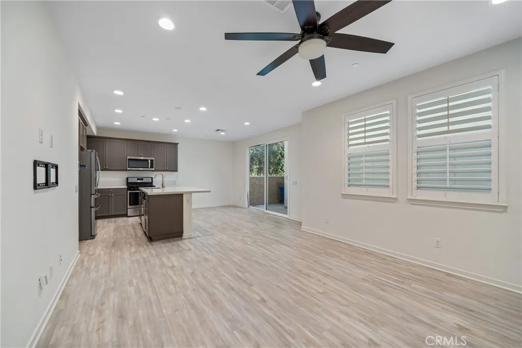 Experience luxury resort-style living in the highly sought-after community "The Resort" of Rancho Cucamonga**. This recently constructed two-story end unit residence offers a harmonious blend of comfort, functionality, and modern elegance, featuring **4 bedrooms, 3 bathrooms, and 1,528 square feet** of thoughtfully designed living space. This highly desired home is located in the most quiet area of the community giving you ultimate privacy. Upon entry, you are welcomed into a bright and airy interior highlighted by **vinyl wood flooring, recessed lighting**, and an open-concept layout ideal for both everyday living and entertaining. The spacious family room flows seamlessly into the beautifully upgraded kitchen, showcasing **quartz countertops, contemporary gray cabinetry, a large center island with bar seating, and stainless steel appliances**. Sliding doors extend the living space to an enclosed backyard patio, creating a perfect indoor-outdoor entertaining environment. The main level includes a well-appointed bedroom and full bathroomideal for guests, multigenerational living, or a private home office. Upstairs, three additional bedrooms and two bathrooms await, including a luxurious primary suite complete with **dual vanities, a walk-in shower, and an expansive walk-in closet**. Each bedroom features high ceilings, generous closet space, and an abundance of natural light. Residents enjoy access to **The Resorts exceptional amenities**, including a clubhouse, **24-hour state-of-the-art fitness center**, resort-style pool and spa, outdoor kitchen and dining areas, a dog p