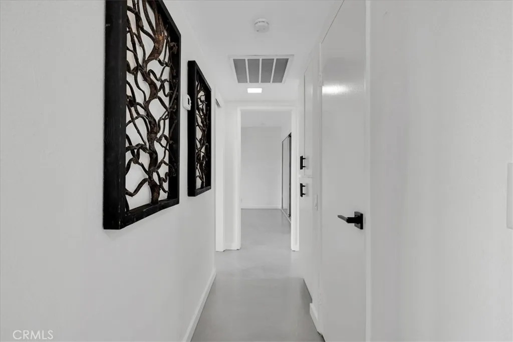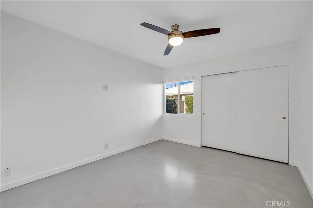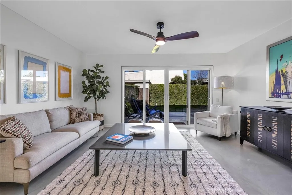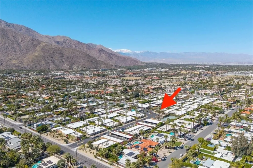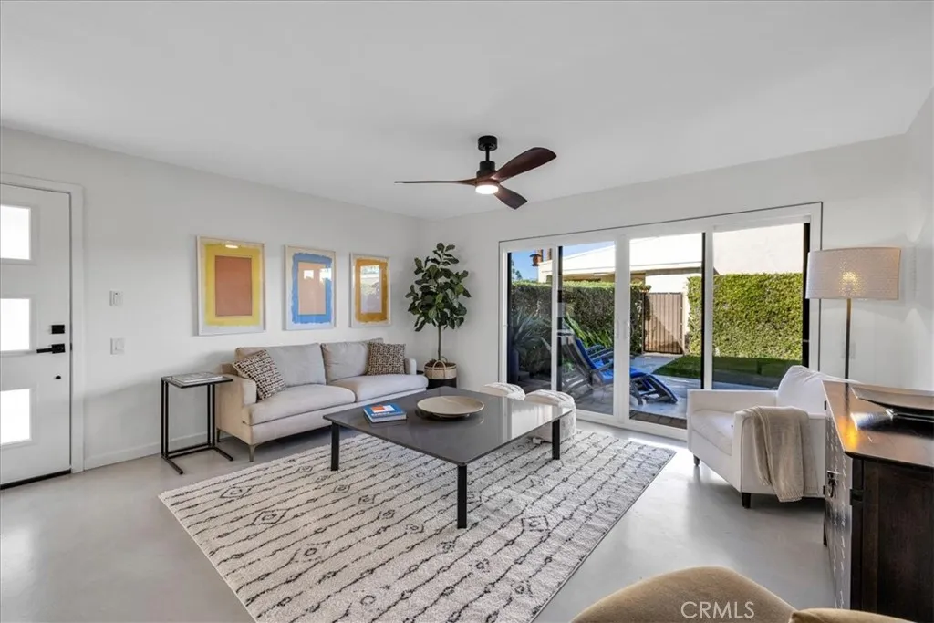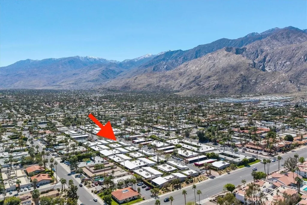Welcome to Ramona Villas, a gated community designed by renowned architect Richard Harrison. This single-level end unit is situated on Fee Land and offers only one shared wall, no neighbors above or below, and no steps. The light-filled interior features skylights, new concrete flooring, dual-pane windows and sliders, an open-concept living area, and upgraded kitchen and baths. The spacious primary suite includes two closets, a remodeled ensuite bath, and direct patio access. A second bedroom is located across from the hall bath. Full-size stacked washer and dryer included. The private north and west facing backyard offers two covered patios, a lawn area for pets, mountain views, and the option to fence with HOA approval. A lush green lawn in front enhances the single-family-home feel. Ideally located across from the clubhouse, saltwater pool and spa, fitness room, and sauna, and just steps to EV charging stations and tennis courts. The end-space covered carport includes built-in storage cabinets plus an additional exterior storage closet. The low HOA covers roof, earthquake insurance, water, trash, and rear-yard maintenance. Secure gated community minutes from downtown Palm Springs dining, shopping, and entertainment.