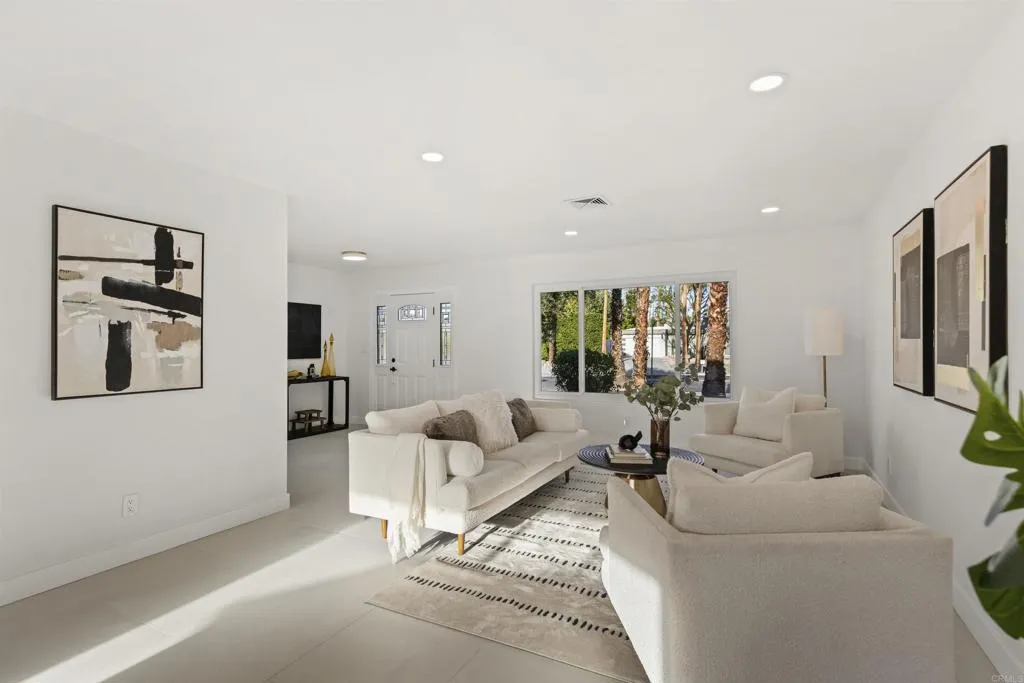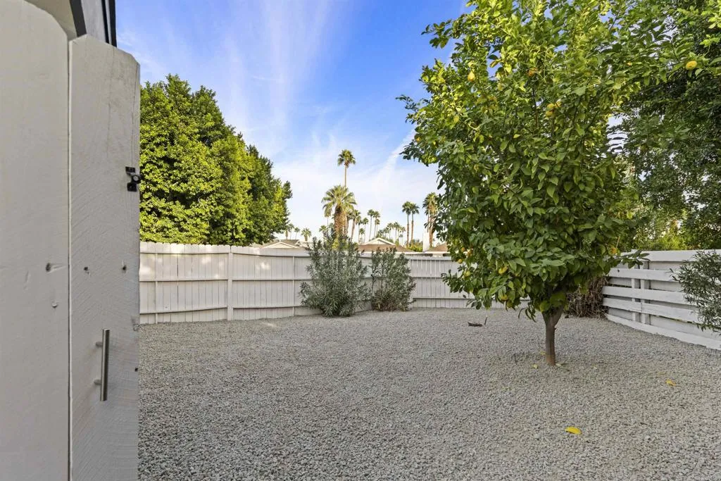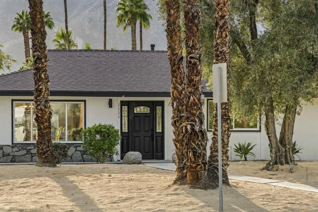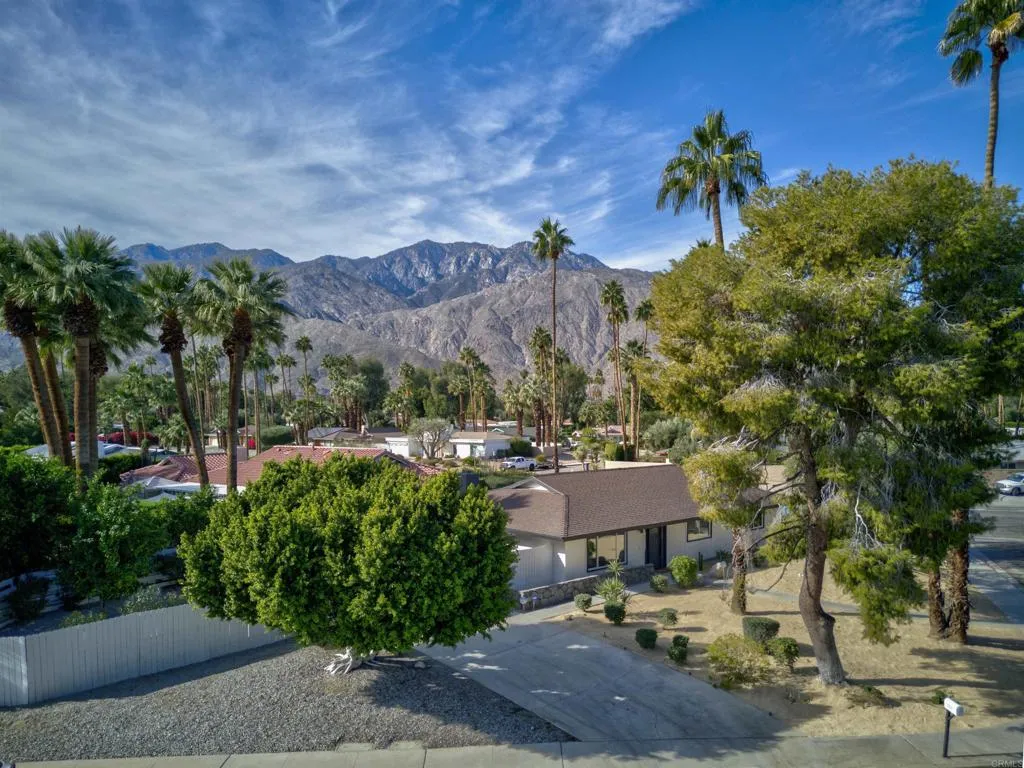WELCOME HOME! Nestled in the heart of South Palm Springs desirable Los Compadres neighborhood, this beautifully reimagined mid-century modern home blends iconic desert architecture with refined contemporary design. Originally built by the Alexander Construction Company, this Los Compadres home sits on a spacious .29-acre corner lot with select San Jacinto Mountain views. Inside, a bright and open floor plan is anchored by large-format tile flooring, recessed lighting, and a sleek tile-wrapped fireplace that creates a warm modern focal point. The thoughtfully designed kitchen features warm cabinetry, a quartz waterfall peninsula, globe pendant lighting, and updated appliances with a 6 burner stove. Glass slider opens from the main living area to the backyard, where mountain views, a refreshed pool, and sun-filled patios create an inviting indoor-outdoor Palm Springs setting. Just beyond the main yard, a gated side area with a mature lemon tree offers a quaint bonus space, perfect for a quiet sitting area, garden nook, or dog run. Both bathrooms have been updated with floor-to-ceiling tile, modern vanities, custom niches, and spa-inspired finishes. Additional features include new A/C, fresh interior and exterior paint, and curated lighting throughout. This home presents an exceptional opportunity for full-time living, a weekend escape, or a refined desert retreat.