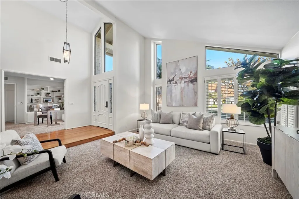 Rarely does a home offer the perfect combination of size, style, and setting; this exceptional 4-bedroom, 2-bath single-level residence delivers it all with an impressive 2,080 square feet of open-concept living accented by soaring ceilings, ideally nestled on a quiet cul-de-sac just a short stroll to Mile Square Park. This truly special home features central A/C, dual-pane windows, plantation shutters, chair railing, brand-new carpet and interior paint, recessed lighting, and an abundance of custom built-ins throughout, while outstanding curb appeal welcomes you with pristine landscaping and brick-accented hardscape. Step through the custom beveled-glass entry door with matching sidelights and oversized transom window into a hardwood foyer that flows seamlessly into the elegant formal living room and adjacent formal dining room, perfect for gatherings both large and small. The inviting family room showcases a fireplace, a beautifully crafted built-in entertainment center with glass cabinetry and shelving, and real wood French doors with opening sidelights that lead to a serene backyard retreat offering a spacious patio with an electronic retractable shade, lush velvet lawn, tropical landscaping, and fruit treesideal for entertaining or relaxing in total privacy. The charming kitchen features new wood-vinyl flooring, white shaker cabinetry, a coffered ceiling, tile countertops, and a breakfast bar, and opens to a sunlit breakfast room overlooking the backyard and flowing naturally into the family room. The impressive primary suite is a true sanctuary with a vaulted ceiling,