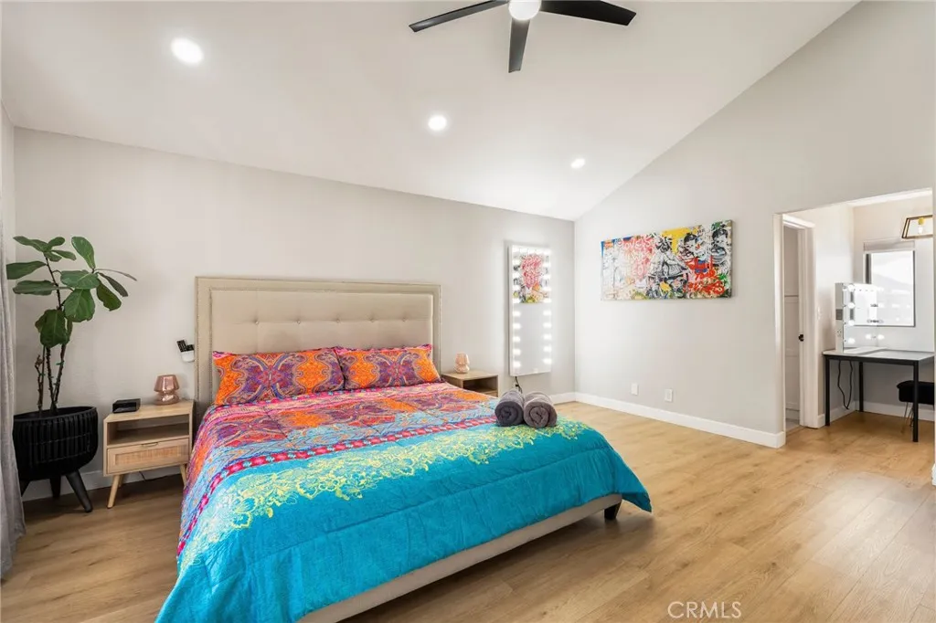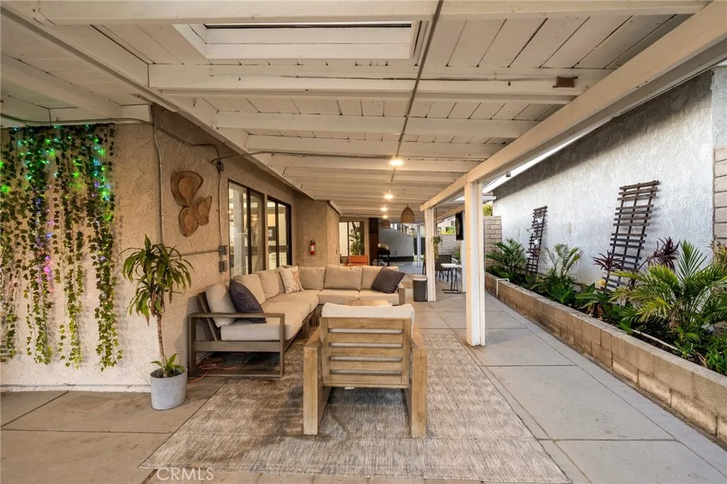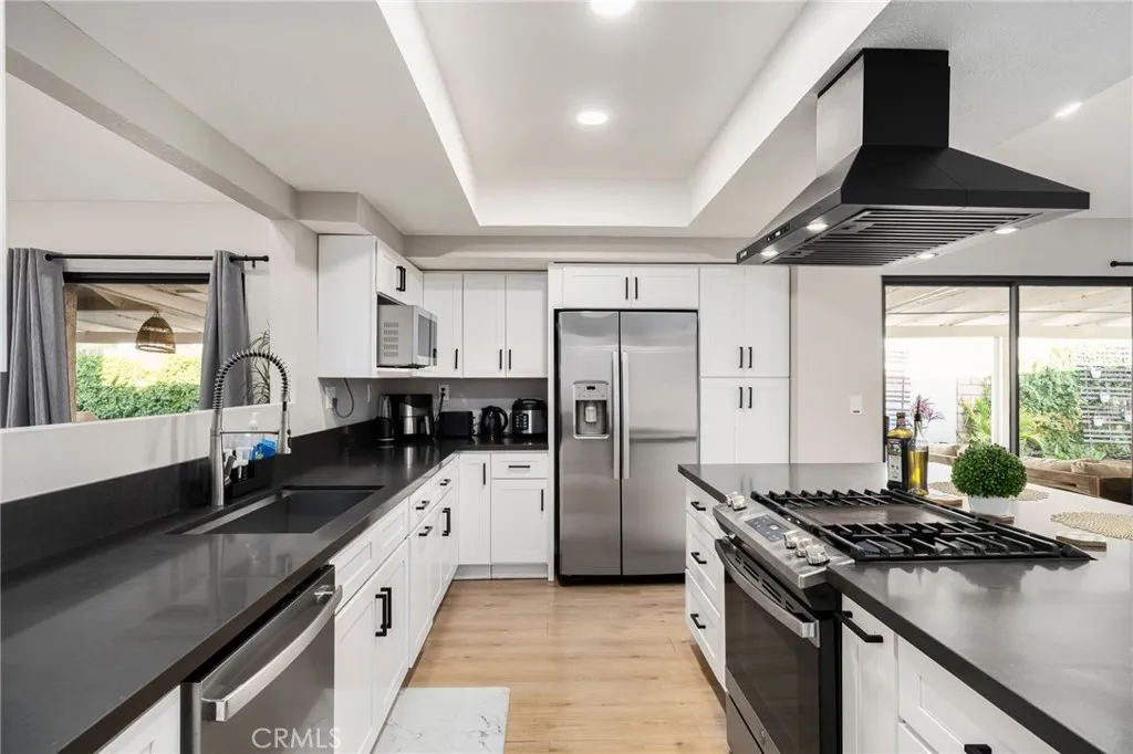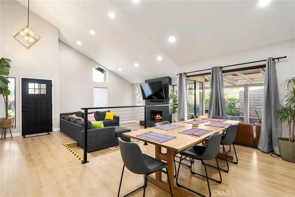 Welcome to this stunning modern single-story home tucked away on a peaceful cul-de-sac in Covina. Thoughtfully updated, and beautifully maintained, this residence offers an exceptional blend of comfort, style, and functionality. As you arrive, you are greeted by impressive curb appeal featuring landscaped grounds, a tiled walkway with step accents, a concrete driveway, and a covered front entryway that sets the tone for what awaits inside. Step through the modern front door into an open concept living space filled with natural light. The living room showcases high ceilings, a contemporary chandelier, recessed lighting, a sleek modern fireplace, and a window overlooking the front yard. This warm, and inviting space flows effortlessly into the dining area, creating an ideal layout for daily living and entertaining. Just off the dining area, the first room offers versatility which is perfect as a bedroom, or home office. Sliding glass doors open to a private patio, allowing for fresh air, or quiet moments outdoors. Continue down the hallway, and discover the remodeled kitchen, seamlessly connected to the game room. The kitchen is a standout feature, offering a large center island with black granite countertops, a gas stovetop with built-in range, white cabinetry with black modern fixtures, stainless steel appliances, ideal for meals and conversation. From the kitchen, the game room opens effortlessly, creating the perfect gathering space for friends, family, and sports lovers. Complete with a modern pool table, this vibrant area elevates the home's entertainment appeal. As you