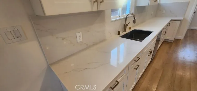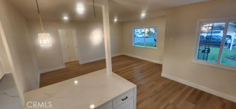 Garden Grove Remodeled Detached Single Level 3 Bedrooms / 1.5 Bath Home close to Disneyland . Remodeled Throughout with ; New Hardwood Style Vinyl Plank Flooring , Freshly Painted in two tone White interior & exterior , Open kitchen has New Stainless Whirlpool appliances ( slide in gas range oven stove , dishwasher , microwave , double door refrigerator with ice maker & water dispenser ) / New White Quartz counters with Backsplashes up to the Upper cabinets / New solid wood White Shaker Cabinetry with Spice Rack pull out , Soft Close features / Bar Area has Pendant Lights & Wood Paneling , Dining Area has a new Ceiling Fan , Stunning Bath has a New Walk in Tiled shower with Frameless Shower Door / Wood Paneling / New LED mirror with light , Recessed lighting throughout , Vinyl windows and new French Doors , New Central ac & heat , new raised panel interior doors and moldings , detached double garage , Close to Disneyland & Convention Center . Square footage includes unpermitted rear addition that can be used as a sun room or bonus room , sun room size is aprx 430 to 520 sq ft / sq ft on legal is around 1100 , city has documents on the addition / see supplements , Laundry room has full size hook ups , New Landscaping with automatic sprinklers