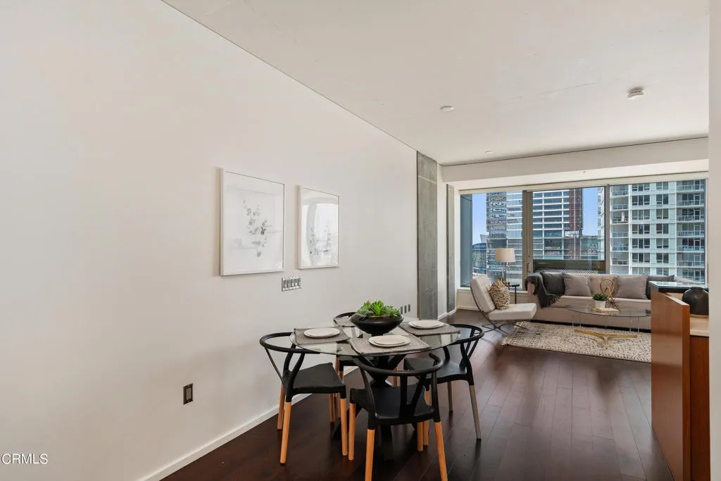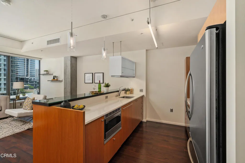 All utilities included. Welcome to the pinnacle of luxury urban living at the prestigious EVO building in DTLA's exclusive South Park neighborhood. This immaculate 1-bedroom condo offers an unparalleled blend of modern elegance and sophisticated design. Meticulously crafted, this residence features expansive floor-to-ceiling windows that flood the space with natural light, offering breathtaking west-facing views of the cityscape and stunning sunsets. Step inside to discover an open-concept floor plan adorned with rich hardwood floors and custom designer finishes. The gourmet kitchen is a culinary haven, equipped with sleek quartz countertops, stainless steel appliances, and ample storage. The spacious living area is perfect for entertaining while you soak in the panoramic views. The bedroom is complemented by an additional built-in closet. The luxurious amenities at EVO redefine high-rise living. Enjoy the state-of-the-art rooftop gym, a breathtaking infinity lap pool, and a jacuzzi deck that promises relaxation. Host gatherings in the outdoor kitchen area with premium grills, or unwind in the chic rooftop lounge offering skyline views. The property also includes an assigned parking space and boasts 24-hour concierge and security services, ensuring peace of mind and convenience. Located just steps away from world-class entertainment venues like Crypto.com Arena and LA Live, as well as upscale dining, shopping, and cultural experiences, EVO offers a vibrant urban lifestyle. This LEED Silver certified building exemplifies sustainable living with its advanced architectural des