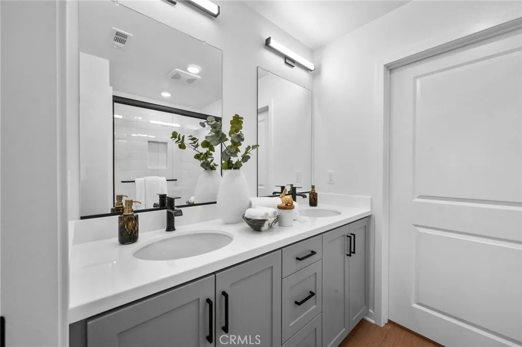 Welcome to this Brand new highly upgraded gorgeous 4 Bedroom 3.5 Bath home that has never been lived it. Upon arrival, you are greeted by a spacious two-car garage with Tesla Solar batteries and EV hookup, and built-in storage racks, accompanied by a full two-car driveway, providing ample parking accommodations. Entering the front door, you will find a full bedroom and full bathroomwhich can also be used for a home office, gym, or additional lounge area. This level also offers direct access to your private yard (one of the largest yards in the community). Upstairs features an inviting, naturally illuminated open-concept layout with beautifully upgraded Luxury Vinyl Flooring throughout. A well-appointed kitchen with an oversized island with beautiful upgraded white countertops anchors the space and flows seamlessly into the dining and living areas, supporting both daily living and effortless entertaining. The third level includes Three additional bedrooms --- two well-proportioned secondary bedrooms along with a generously sized primary suite designed for comfort and privacy. There are too many upgrades to list but here are a few. Whole House Black Fixtures Moen Genta plumbing fixtures Schlage Solstice lever door hardware Moen Genta bath accessories, Opti Gray Cabinet Upgrade - Shaker Panel Doors, Soft close drawers throughout, beautiful della terra sonata quartz countertops with mitered edge details, and full backsplash, ring elite video doorbell, upgraded electrical fixtures and controls throughout, Wi-Fi garage and thermostat controls, Solar with Tesla Solar batteries, br