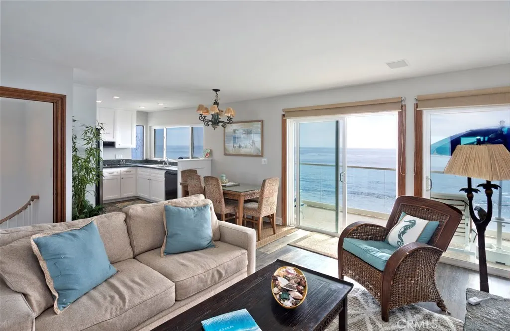 Enjoy a beautifully furnished oceanfront rental available starting April 1, 2026. This lovely and spacious three-bedroom, two-bath unit is located beach front on Brooks Beach in Laguna. Relax on the expansive balcony just steps from the beach, offering stunning 180-degree panoramic ocean views. Watch surfers at Brooks Street, spot dolphins, and take in breathtaking sunsets. The home is tastefully decorated with a calming, beach-inspired style. It features smart TVs in the living room and all bedrooms, along with high-speed wireless internet. The prime location is within walking or trolley distance to numerous restaurants, art galleries, and Main Beach. Were situated on Brooks Street Beach (a popular surfing spot), with Cress Beach (a great family beach) just to the left. The property boasts beautiful ocean views, sliding windows that lead to a large balcony over the ocean, and a cozy living room with a fireplace and large flat-screen TV. The master bedroom has a Cal King bed, a spacious lofted closet, and a large TV. The second bedroom also features a Cal King, while the third bedroom offers a Queen-sized bed. The space is bright and airy, with plenty of windows and mirrors to maximize the ocean views. Private stairs lead down to the beach. Parking in the garage with EV charger is included, and utilities are covered. Available for monthly rentals. Current availability begins April 1, 2026. Summer rates: June ($18,000), July/August ($25,000).