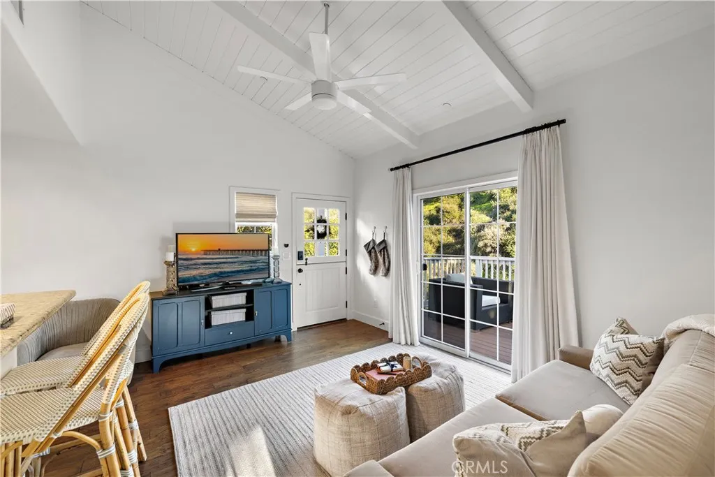 Available January and February 2026! Experience the quintessential Laguna Beach lifestyle in this stunningly remodeled, fully furnished 1-bedroom, 1-bathroom retreat. Tucked away on a quiet street in lower Temple Hills, this light-filled unit features a perfect blend of coastal tranquility and modern comfort making it the ideal sanctuary for your stay. Enter through the charming Dutch door to find rich hardwood-style flooring, a cozy living room with a large skylight that floods the space with natural light and sliding glass doors that open to a private balcony surrounded by lush greeneryperfect for enjoying the ocean breeze. The gourmet kitchen is fully equipped for the home chef, featuring warm wood cabinetry, granite countertops, stainless steel appliances, and a breakfast bar with woven bistro seating. Retreat to the spacious bedroom which continues the airy feel with high ceilings and a ceiling fan. This relaxing haven is tastefully decorated with a tropical botanical accent wall, a plush blue velvet upholstered bed, and a chic sitting bench. The bathroom offers a spa-like atmosphere with floor-to-ceiling travertine tile and a walk-in shower. With mirrored wardrobe doors, ample storage, and laundry access, this beautiful unit offers everything you need to live like a local in one of Southern California's most desirable coastal enclaves.