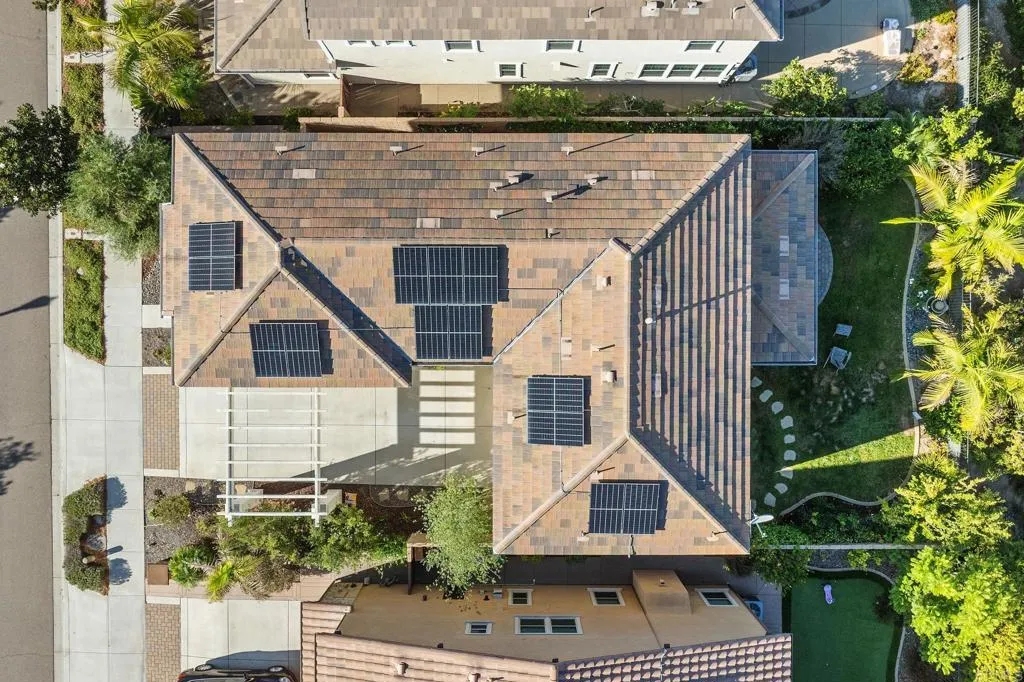 Perched for privacy, this beautifully upgraded Verana residence offers an enhanced sense of privacy in the highly sought after Pacific Highlands Ranch community. Striking curb appeal begins with a low maintenance, water wise front yard featuring sculptural succulents, native plantings, and decorative riverbed stone, while a spacious driveway, elegant porte cochere, and set back garage create a welcoming and refined first impression. Inside, Italian wood look porcelain tile flooring spans the main level and leads into the expansive kitchen and family room, the true heart of the home. Abundant natural light fills the space thanks to the extended driveway and large picture windows overlooking the backyard while premium upgraded light fixtures throughout add warmth and a cohesive designer touch. The kitchen showcases rich dark wood cabinetry, granite countertops, and a stunning iridescent blue backsplash, complemented by stainless steel appliances including a GE Monogram four burner range with center griddle, double wall oven, professional hood vent, and a dedicated coffee bar. From the generous center island, you can see across the living area, past the gas fireplace with built in shelving, and through the dramatic sliding glass wall that opens to the covered loggia, creating seamless indoor-outdoor living. Designed as a true extension of the home, the covered loggia features a beautiful wood plank ceiling, specialized upgraded light fixtures, and a ceiling fan, elevating the outdoor space into a refined and functional living area. It overlooks a spacious grass yard framed by