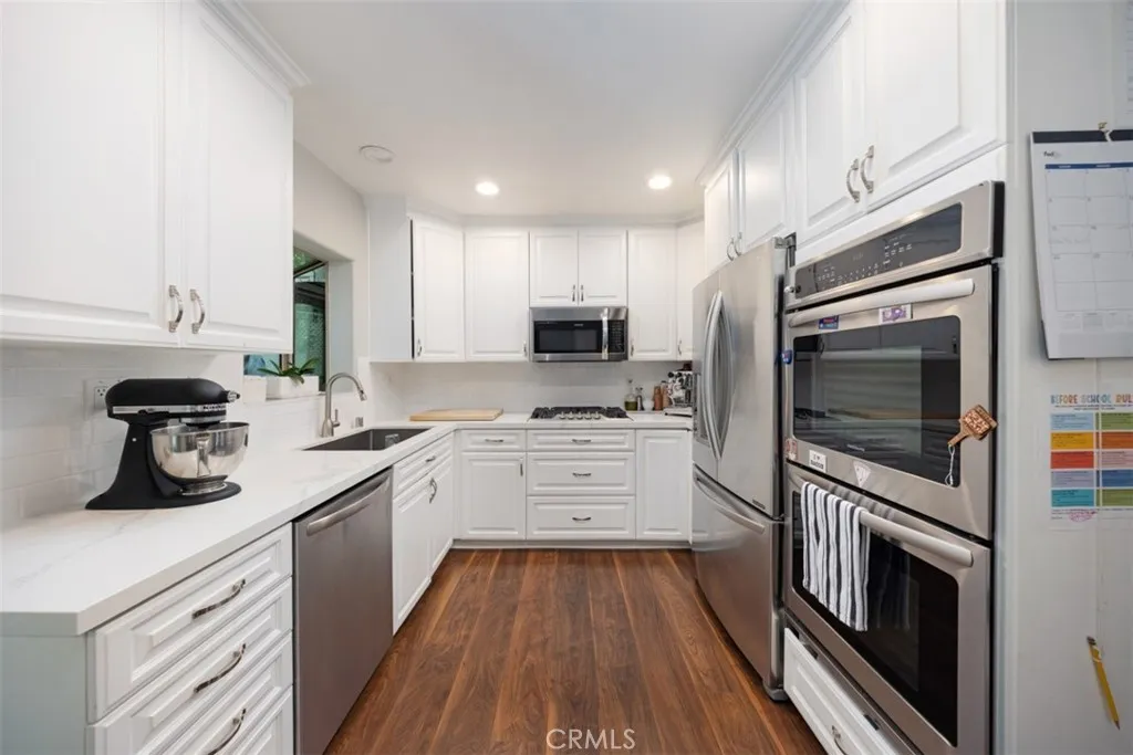 Welcome Home to 14101 Dickens St #9, this beautifully updated townhome in the heart of Sherman Oaks, offering an exceptional blend of space, style, and indoor-outdoor living. Step inside to a light-filled living area featuring recessed lighting, rich wood-style flooring throughout, and a sleek fireplace that anchors the space. The open layout flows seamlessly to a private front patio, creating an inviting extension of the main living area. The newly renovated kitchen is crisp and modern with quartz countertops, stainless steel appliances, a gas cooktop, double wall oven, built-in microwave, and ample cabinetry. Clean lines and thoughtful finishes make it both functional and visually striking. Just beyond, a second patio provides additional outdoor space ideal for dining, relaxing, or entertaining. Upstairs, the spacious bedrooms offer comfort and scale rarely found in similar units. The primary suite features soaring vaulted wood-beamed ceilings, an airy retreat feel, and its own private balcony. The home includes two full bathrooms upstairs and a convenient powder room on the main level. With in-unit laundry, central heating and air conditioning, two parking spaces, and additional storage, this home delivers both convenience and thoughtful design. Ideally located just moments from Ventura Boulevards shopping, dining, and entertainment, this is Sherman Oaks living with rare outdoor versatility.