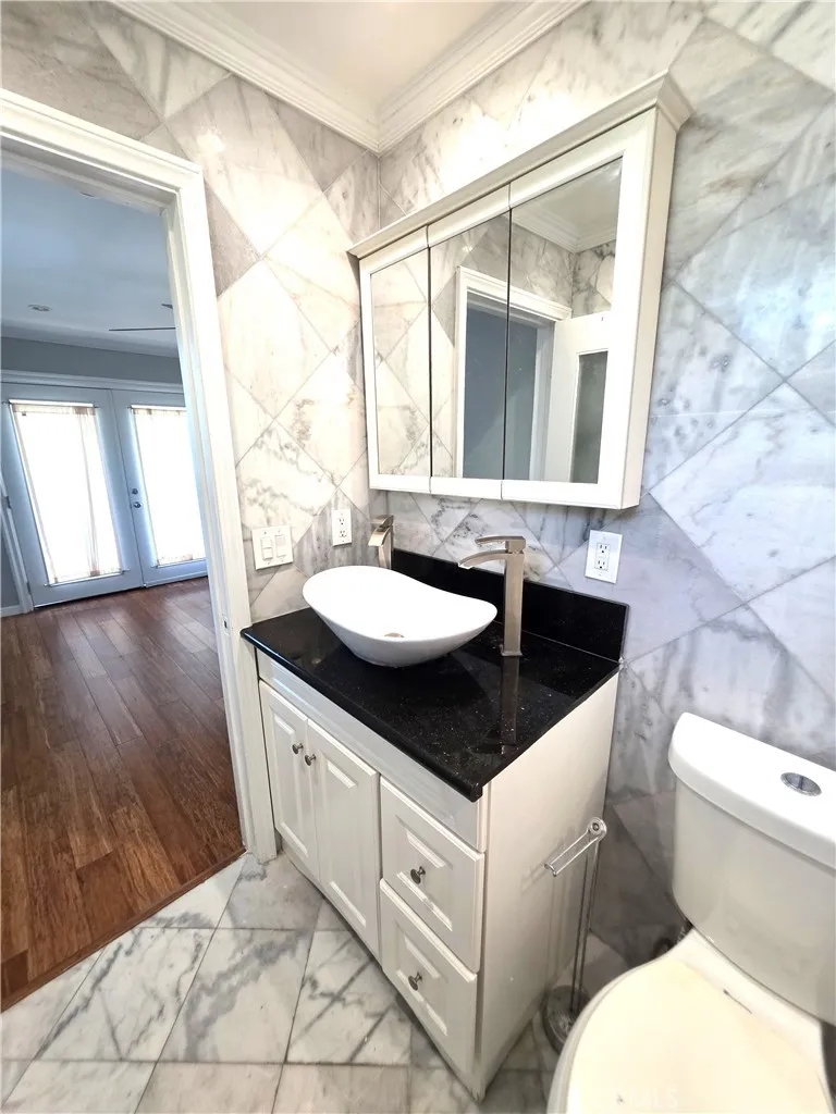 Remodeled 4 bedroom, 2 bath house one level home. It's the front house with large front yard with fruit trees. Sunny living room with Bamboo hardwood floors throughout the home. Kitchen is sunny & bright with granite counter tops, natural stone floors and room to sit at the breakfast bar, large farmhouse sink, lots of cabinets and a pantry. Big remodeled Hall bathroom, with shower & tub combination. Remote controlled ceiling fans in all 4 big bedrooms, big Master bedroom with French doors that lead out to a large deck. Master bath is newly renovated with marble floors & tub area. Central heating & air, washer, dryer connections and 2 dedicated parking spots at the rear of property.