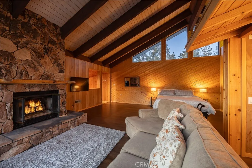 Eagle Point lakefront nearly 3,500 square feet, 4 bedrooms, 3 baths, 80' of shoreline, and big water views that hit you the moment you walk in. This custom built lakefront home was designed to make the most of its setting and lakefront location. Multiple decks wrap the home and create that classic Big Bear indoor outdoor flow morning coffee over the lake, quiet afternoons, and front row sunset views across the water. On summer nights, you have a direct view of the fireworks from your own deck. A lakeside gazebo adds another private outdoor space for relaxing or entertaining. Inside, the layout works exceptionally well for both everyday living and hosting. A spacious primary suite, generous secondary bedrooms, and flexible gathering spaces give you privacy when you want it and room to entertain when you dont. The indoor hot tub room sits facing the lake and becomes a natural gathering spot year round. Two kitchens, coupled with a kitchenette in the primary suite, add real versatility for extended stays and multi level living. Multiple driveways offer plenty of off street parking, and an electric vehicle charging setup is already in place. Offered fully furnished and equipped truly turn key and ready for immediate enjoyment. Arguably one of the best neighborhoods in Big Bear Lake. Walk to Meadow Park and Swim Beach about one mile to The Village or Snow Summit and just a few minutes to Bear Mountain and shopping centers. Note: Spiral staircase to the primary suite and a few steps down into the family room.