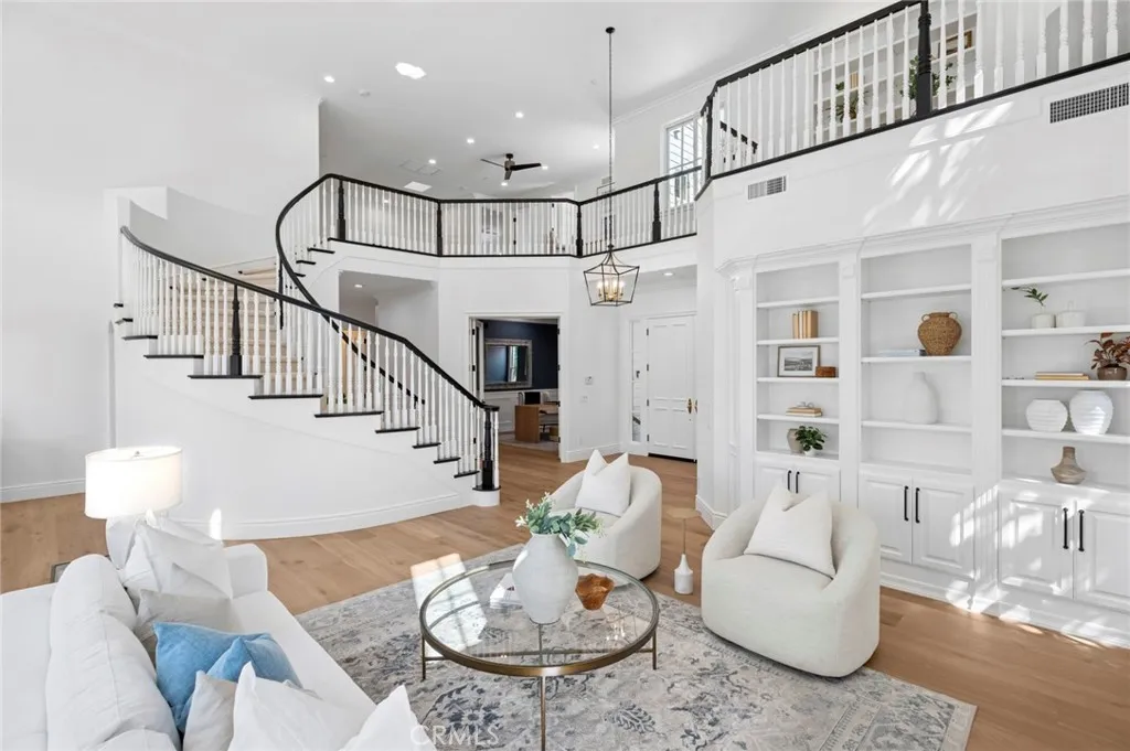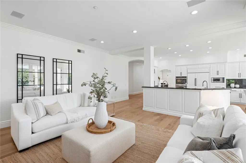 SWEEPING VIEWS And LOCATION! Amazing Sunset and Golf Course Views Overlooking the 18th Fairway of the North course at Coto de Caza. One of only 11 homes on a single loaded cul de sac street with a short walk to the Coto de Caza Golf and Racquet Club. The Simi-custom Home was designed and built by Stonefield Development with a tradition of beautiful and unique architectural design and with exceptional quality features throughout like the solid core 8 ft. wood doors, dual staircases, and walk-out view balcony off the primary bedroom. Three gas-burning fireplaces. The exquisite residence delivers the ultimate in luxury with natural elements in its open light and bright 5000+ sq ft. The residence is graced with a two-story volume ceiling in the Entry, Formal Living, and Dining Rooms. Comforts include 5 spacious bedrooms, 4.5 bathrooms, 4-car garage, Library/Office, and large open upstairs lounge area for the family or office plus A Separate area for reading/ study. Many large Picture windows (9 are new and installed by Anderson). The home has many modern upgraded features, including wide plank wood flooring throughout (except the two staircases), which has beautiful wool carpeting. All new Toto toilets, including a bidet washlet, are in the primary bathroom. Completely remodeled master bath with Newport Brass Fixtures, solid slab stone shower, and counter tops, a free-standing tub for that soothing bath while enjoying the stunning views. The open Kitchen has a large walk-in island with a Viking cook top, two new Viking dishwashers, and a spacious nook with a large picture windo