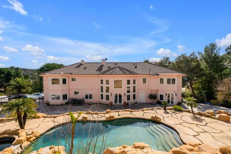 Exceptional custom Mediterranean estate in the prestigious 24-hour guard-gated community of Bell Canyon, offering privacy, elegance, and resort-style living. Ideally located on a quiet cul-de-sac with an elevated setting and private driveway, this impressive residence blends grand architecture with sophisticated comfort. Enter through dramatic iron double doors into a grand foyer that immediately sets the tone for the homes scale and craftsmanship. This beautifully designed residence offers 5 bedrooms and 5.5 bathrooms, including a main-level ensuite bedroom and private office, perfect for guests, multigenerational living, or working from home. The home features a stunning formal living room with soaring ceilings, a fireplace, and a wet bar, a warm and inviting family room, and an elegant formal dining room ideal for entertaining. The gourmet chefs kitchen is equipped with top-of-the-line appliances: Sub-Zero refrigerator, 6-burner Wolf range with convection double oven, Fisher& Paikel dishwasher, custom cabinetry, granite countertops, an oversized center island, a walk-in pantry, and a bright breakfast nook. Ascend the exquisite wrought iron staircases to the upper level and discover the luxurious primary suite, complete with a sitting area, fireplace, and a spacious spa-like bathroom. Three additional generously sized ensuite bedrooms provide comfort and privacy for family and guests. The resort-style backyard is designed for both relaxation and entertaining, featuring a sparkling pool, spa, waterfalls, and an exciting water slide, creating a true private oasis. Bell Cany