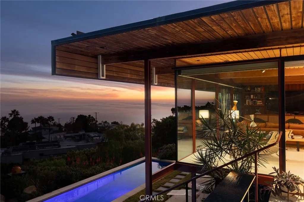 Published and recognized mid-century Case Study architect Craig Ellwood, The Byron Lamar Johnson House, 1953 is the third in the series of Ellwoods recorded steel hillside houses, located in Crestwood Hills of Brentwood, on prestigious Tigertail Road. Here is a great example of pedigree mid century architecture at the top of Crestwood Hills, an incredibly prized Ellwood, here you will find a meticulous restoration honoring the Ellwood design ethos. Conceptually pristine, once called Beauty of the House of Steel in the LA Examiner. The property consists of two separate addresses. The main residence incorporates 3 bedrooms, 2.5 baths, plus new ADU 1 bed w/full steam shower bath & kitchen direct to the pool area. Whole house automation, solar panels, Tesla power walls, EV charger, brand new roof w/rooftop sprinkler, terrazzo floors, Lutron lighting, Baldwin and Fleetwood doors/windows, new sewer and gas line, motorized shades, restored gas/wood burning fireplace, water filtration, Gaggenau, Wolf Subzero appliances, outdoor kitchen w/Lynx Barbecue & pizza oven, grass lawn w/period chaise lounges, skylights, Waterworks fixtures. Every detail has been carefully curated from the furnishings to the finishes making this a truly turnkey living experience. Tigertail trailhead steps from door, minutes to Brentwood Country Mart & Farmers Market. History preserved and restored. Offered fully furnished.