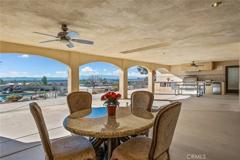 Introducing a rare opportunity in the prestigious Sycamore Rocks neighborhood of Apple Valley: A breathtaking 2.38-acre corner-lot estate with sweeping valley views and a dramatic rocky mountain backdrop. This residence offers 3,658 sq ft of refined living, enhanced by a spacious bonus room, an impressive office with built-ins and private patio, and abundant natural light from multiple large skylights. Designed for both elegance and comfort, the home features a gourmet kitchen with a large island and custom built-ins, an inviting family room with a woodstove insert, brick hearth, custom built-ins and a formal dining room with a coffered ceiling. The primary suite is a true retreat with a fireplace and a spa-inspired bath offering a soaking tub, step-in shower, private water closet, dual vanities, and two wardrobe rooms. A large laundry/utility room with extensive cabinetry and an attached 3-car garage complete the main home. Step outside to resort-style living with a sparkling pool and spa, waterfall, pool house, fire pit gathering area, and an expansive covered back patio with an outdoor kitchen/entertaining areaperfect for sunset evenings under the High Desert sky. Utility features are equally impressive, including two fully owned solar systems (home + pool/spa), plus the rare advantage of both a private well and utility water for efficiency and independence. The propertys signature differentiator is the approximately 4,000 sq ft dream shopa standout feature rarely found, offering four roll-up doors, its own bath, laundry/utility room, abundant storage, and a private stud