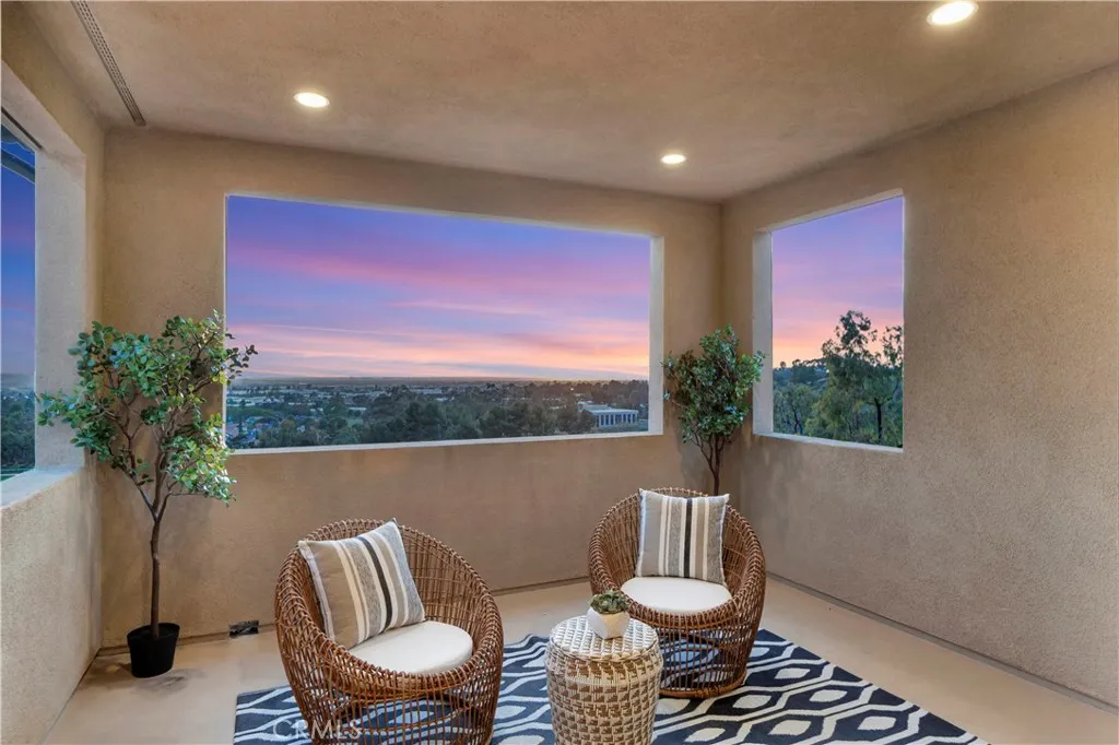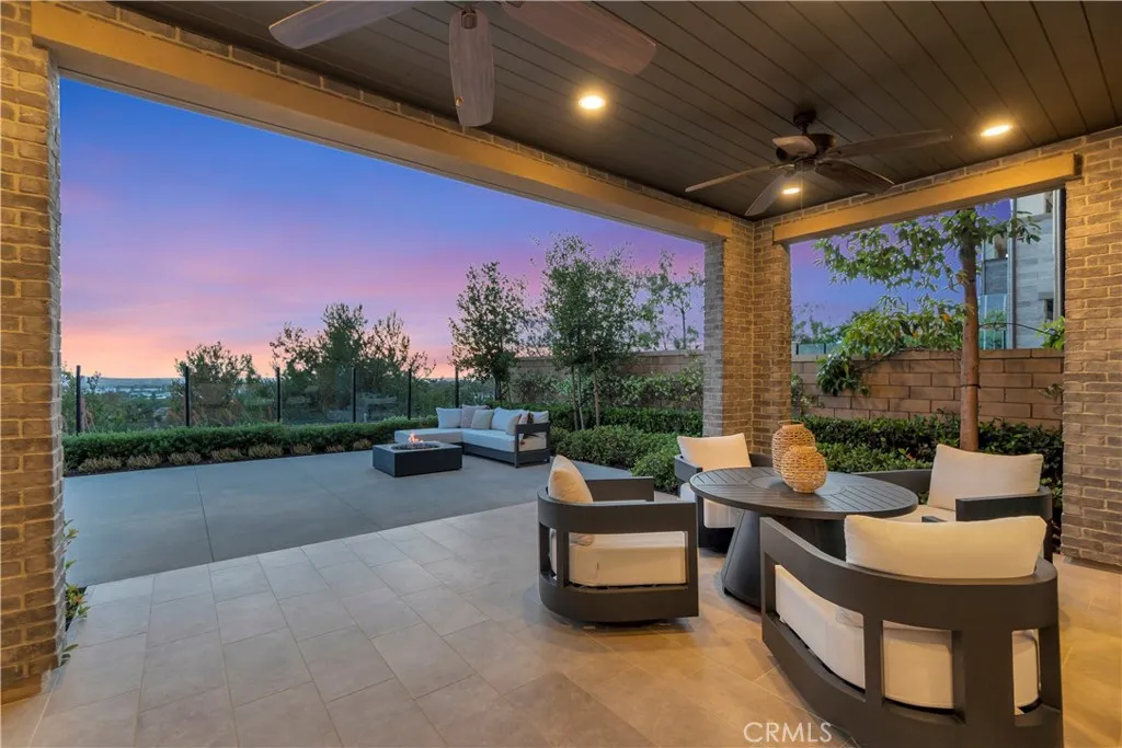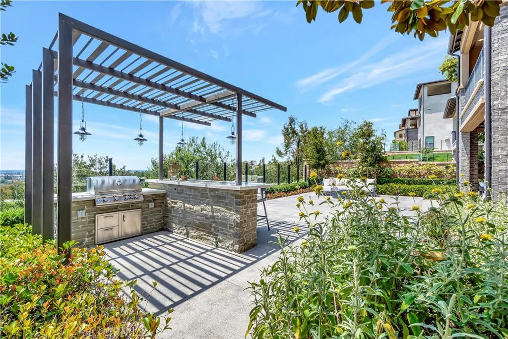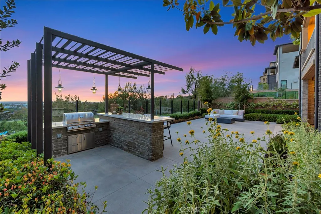 Originally built as a Teresina model home, this residence was designed as a showcase, capturing breathtaking panoramic views with luxurious upgrades throughout. Enter through the grand entryway with vaulted ceilings, setting the tone for refined, showcase-level living. Upgraded hardwood flooring and LED lighting flow seamlessly throughout the home. The gourmet kitchen features granite and quartz countertops, full-height tile backsplash, and top-of-the-line GE Monogram appliances, along with a spacious pantry featuring built-in open storage shelving. The great room showcases elegant wall paneling, a limestone fireplace, and stacking sliding doors that open to reveal sweeping views. The outdoor room, complete with ceiling fans and tongue and groove ceiling detail, is the perfect setting for outdoor dining and relaxation. The backyard features a pergola with a built-in BBQ island, perfect for hosting unforgettable gatherings. The first floor also includes an open-layout dining room, powder room with a limestone countertop, a den with built-in lighted cabinets and shelving, and a convenient bedroom with an attached bathroom featuring a quartz countertop. The second floor is home to a refined primary suite, offering expansive views and a private covered terrace with equally captivating vistas. The primary suite features a quartzite countertop, tile backsplash, and a GE Monogram wine chiller. Indulge in the primary bathroom, complete with quartzite countertops, floor-to-ceiling shower tiling, and a soothing rain can shower head. A large walk-in closet provides ample storage. The