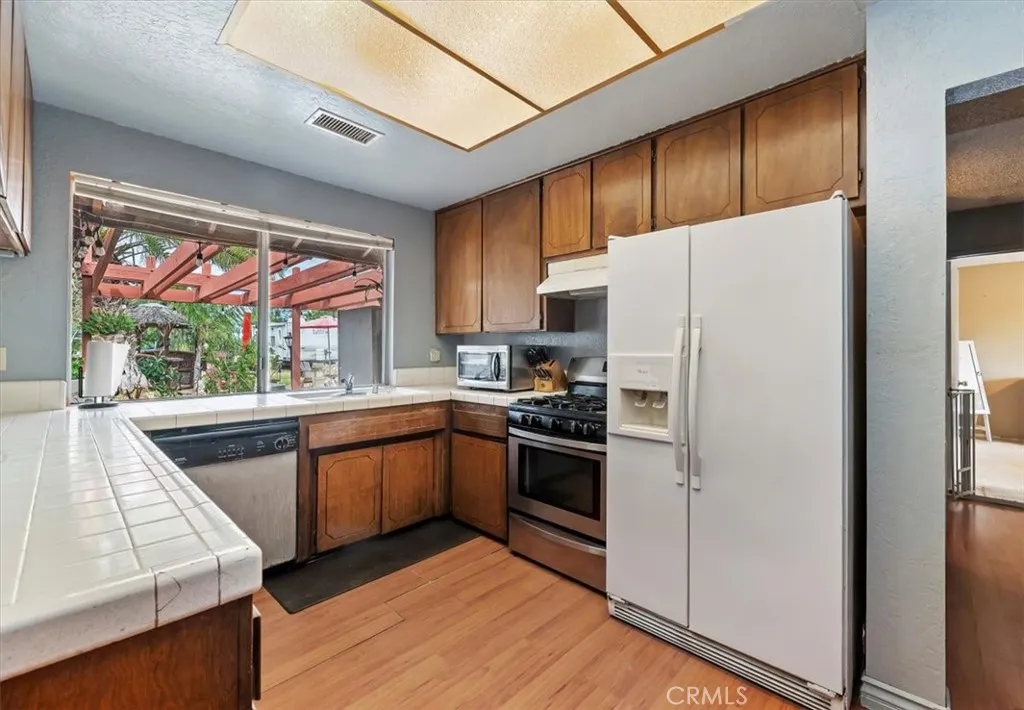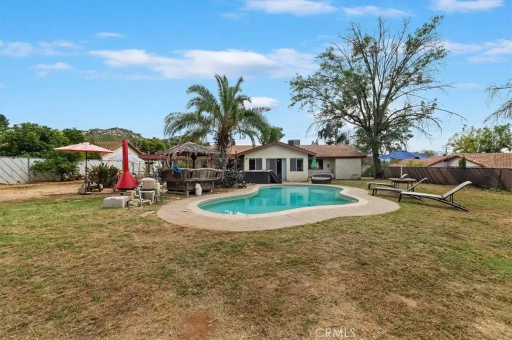 Very nice single story pool home, nestled in the desirable Woodcrest area of Riverside. This spacious home sits on nearly half an acre and offers 2,335 square feet of gracious living space. And, you can have horses! Built in 1973, the property features five bedroomsincluding two primary suitesand three bathrooms, providing flexible living options ideal for multi-generational households or guests. A large front yard creates an impressive setback from the street, enhancing privacy and offering plenty of space for future landscaping possibilities. A distinctive arched entryway provides a unique architectural focal point and welcoming transition into the home. The formal living room showcases a stacked-stone fireplace with a classic arched opening, creating a warm space for gatherings. A large picture window fills the room with natural light while offering views of the surrounding neighborhood and hills. The main living area features a contemporary open-concept layout with laminate wood flooring throughout the primary spaces. The family room is bright and inviting with vaulted ceilings, large windows that bring in abundant natural light, and an open connection to the dining and kitchen areas. A sliding glass door leads directly to the backyard, creating seamless indoor-outdoor flow. Perfect for year-round entertaining, the backyard offers multiple outdoor living areas. A spacious patio provides plenty of room for gatherings, complemented by an above-ground jacuzzi and a uniquely shaped pool with paved edging. A beautifully scored concrete patio anchors the space, while a freest