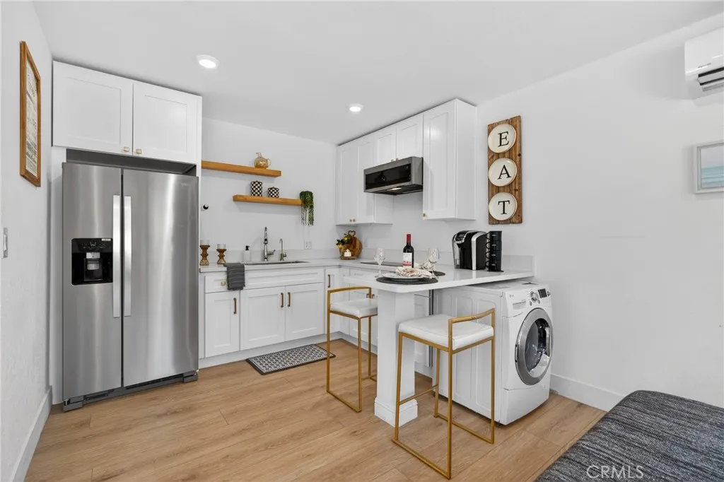 Newly constructed and thoughtfully designed, this fully furnished Junior ADU offers a turnkey living experience with style, comfort, and efficiency in mind. The space features a bright open layout with wide-plank flooring, recessed lighting, and a clean contemporary aesthetic throughout. The modern kitchenette is equipped with sleek cabinetry, stainless appliances, open shelving, and a breakfast bar, while the living/sleeping area provides a comfortable, functional layout ideal for everyday living. A beautifully appointed bathroom with a glass-enclosed shower and designer fixtures adds a touch of luxury. Additional highlights include an in-unit washer and dryer, split-system heating and air conditioning, and all utilities included even cable and Wi-Fi making this an exceptionally convenient and hassle-free residence. Located near Cal State Northridge, this property has previously accommodated visiting faculty and is well suited for anyone seeking a quiet, well-maintained living environment. Standard lease term is 12 months, with shorter terms available at adjusted pricing.