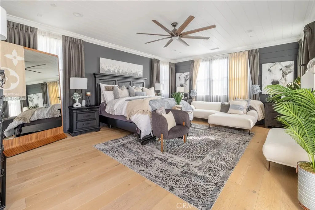 Built in 2021, this beautifully upgraded Modern Farmhouse is located in a GATED hillside community on a quiet cul-de-sac, offering privacy, scenic views, and a thoughtfully designed open-concept floor plan. Featuring 4 bedrooms plus a main floor office (or optional 5th bedroom) and 4 full bathrooms, this home blends modern elegance with everyday comfort. Rich hardwood flooring, designer chandeliers, and custom wainscoting create warmth and sophistication throughout. The chefs kitchen is the centerpiece of the home, showcasing a massive quartz island, modern wood cabinetry, black appliances, and statement accent lighting. It flows seamlessly into the family room and opens to a spacious entertaining patio with hillside views ideal for indoor-outdoor California living. The main level includes a flexible office/bedroom and an additional bedroom with full bath, perfect for guests or multi-generational living. Upstairs youll find: A large bonus room with breathtaking views and private deck A dedicated luxury movie theater room designed for immersive cinematic experiences perfect for private screenings, game nights, or hosting unforgettable gatherings Two secondary ensuite bedrooms Laundry room with an expansive linen closet Elongated driveway Large front and back yard The impressive primary suite offers dual vanities, a soaking tub, oversized walk-in shower, TWO PRIMARY WALK-IN CLOSETS, and direct access to a private viewing deck to enjoy peaceful hilltop sunsets. Built to the latest building codes. A rare opportunity to own a newer construction home in an exclusive gated
