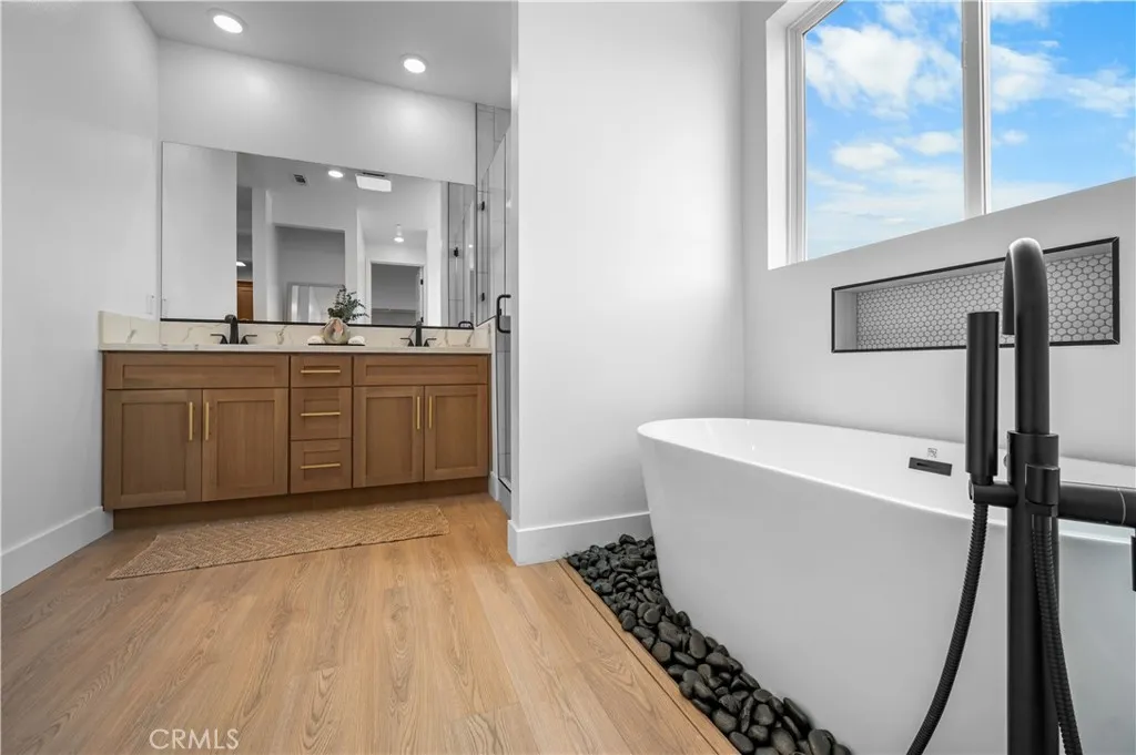 Discover your dream home in Desert Hot Springs, CAa stunning oasis with breathtaking mountain views and modern features that elevate your lifestyle. Step inside to an open floor plan with 9-foot ceilings and recessed lighting, creating an airy atmosphere perfect for relaxation and entertainment. The spectacular kitchen is a culinary enthusiast's dream, featuring white oak cabinets, quartz countertops, and a spacious island, all equipped with Samsung appliances. The luxurious master suite boasts a modern soaking tub with chic black stone detail, offering a spa-like experience. Stay comfortable with a 4-ton, 16 SEER central heat pump HVAC system, energy-efficient windows, and PAID OFF SOLAR for sustainability. Enjoy a spacious lot with RV parking, just minutes from Palm Springs. Perfect as a primary residence or vacation rental, this modern haven awaits your arrival!