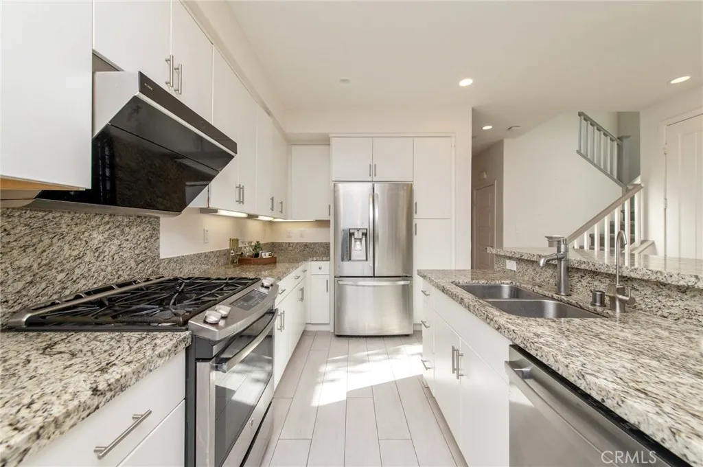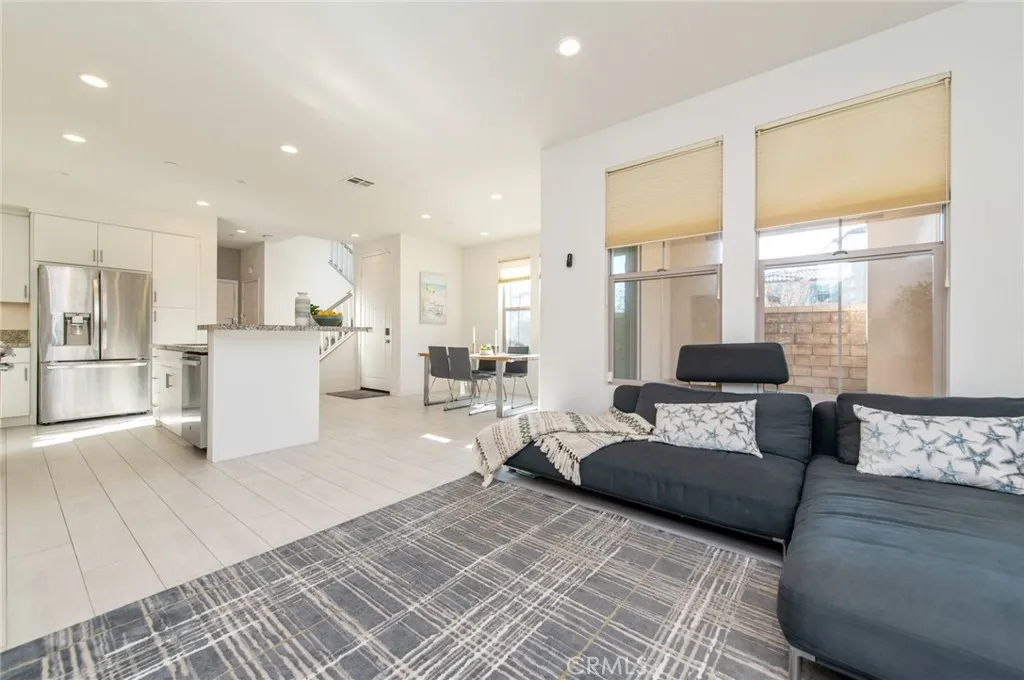 This well-located end-unit residence is situated within the Baker Ranch community and offers a functional floor plan with a desirable corner location that provides added privacy and abundant natural light. The main level features an open-concept layout with neutral tile flooring throughout the primary living areas. The kitchen includes granite countertops, a center island with seating, stainless steel appliances, and ample cabinetry, and opens seamlessly to the living and dining areasideal for everyday living and entertaining. Sliding doors extend the living space outdoors to a private patio area designed for indoor-outdoor enjoyment, featuring a covered outdoor section, hardscape surfaces, and low-maintenance landscaping. The second level includes a versatile loft space, a conveniently located laundry area, and three bedrooms. The primary suite offers a comfortable retreat with a walk-in closet and an ensuite bathroom featuring dual vanities and a walk-in shower. An additional upper-level flexible space provides further versatility and may be used as a media room, office, exercise area, or other functional living space, depending on buyer needs. The home benefits from thoughtful layout planning and functional features, which may include multi-zone climate control, electric vehicle charging capability, garage functionality enhancements, and smart or security-related components. All features, systems, and equipment are subject to verification and are offered as-is, with details to be confirmed by the buyer through inspections and seller disclosures. Residents of Baker Ranch
