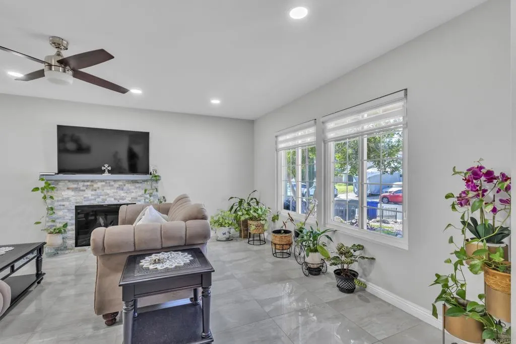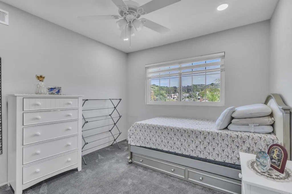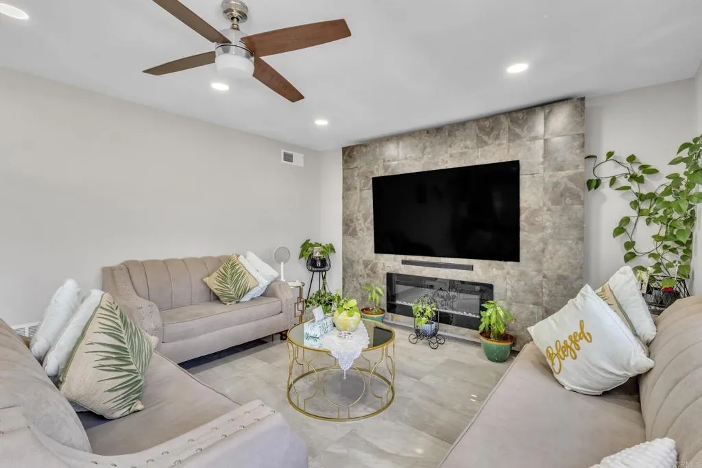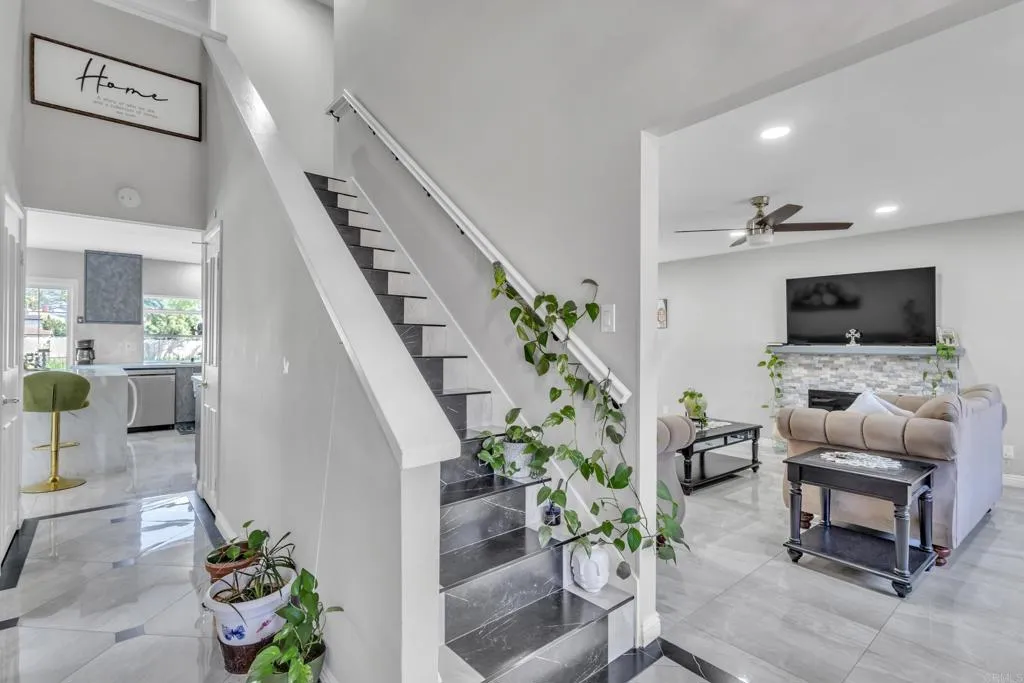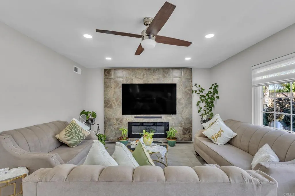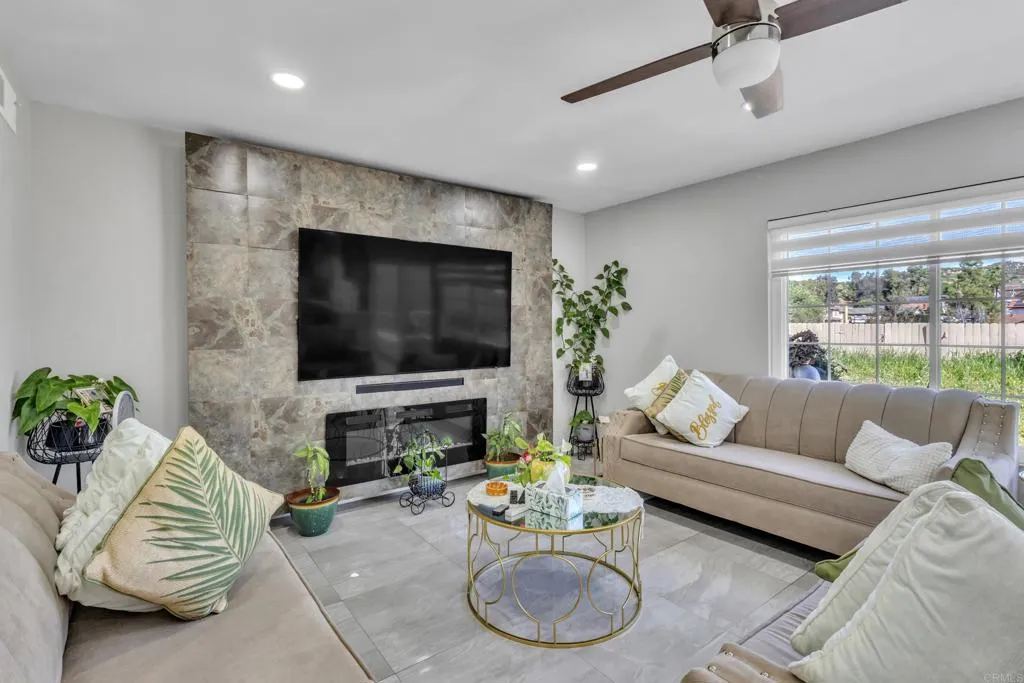 Located in a beautiful neighborhood in El Cajon, this stunning home was fully renovated approximately three years ago and offers a modern, move-in-ready feel throughout. Home has 26 PAID OFF solar panels. This beautiful home features 4 bedrooms, 2.5 bathrooms, and 2,176 sq ft of living space. Step inside to tile flooring on the first floor, recessed lighting, upgraded baseboards, ceiling fans, and blinds that complement the homes clean, contemporary design. The spacious layout features two cozy fireplaces, one in the living room and another in the family room, creating warm and inviting spaces for both relaxing and entertaining. The fully upgraded kitchen boasts modern cabinetry, stylish countertops, and updated appliances, making it both functional and beautiful. Bedrooms include mirrored closet doors, adding light and a sleek touch to each space. Outside, enjoy beautifully landscaped front yard curb appeal and a covered garage for convenience. This thoughtfully updated home blends comfort, style, and location, a true gem in El Cajon.