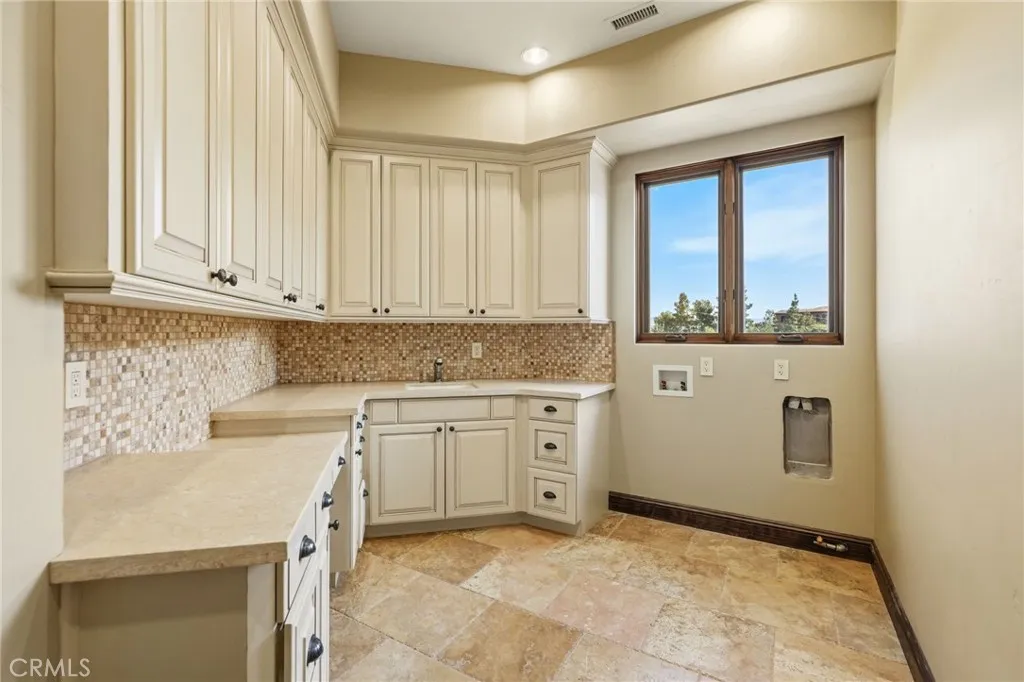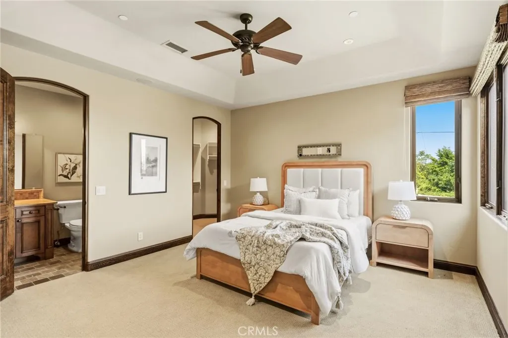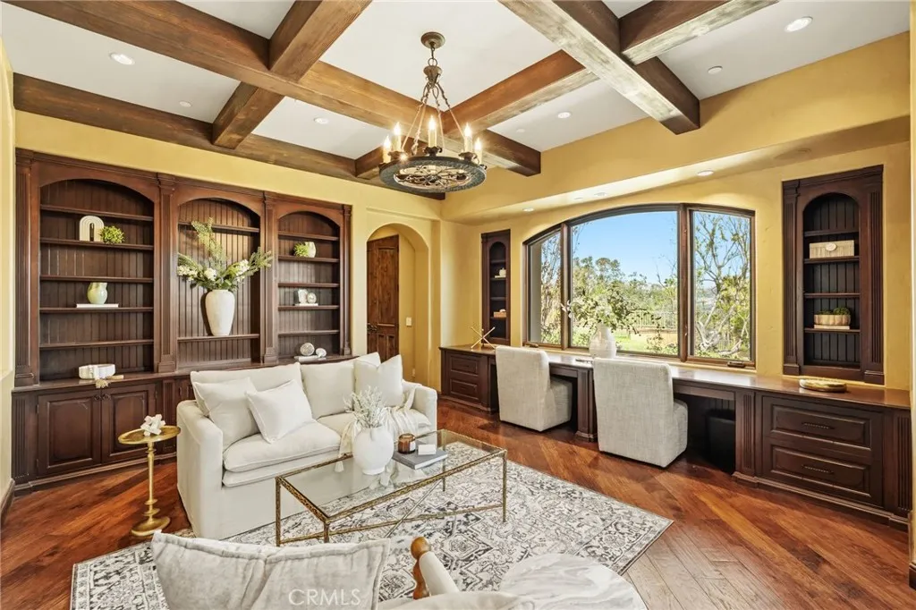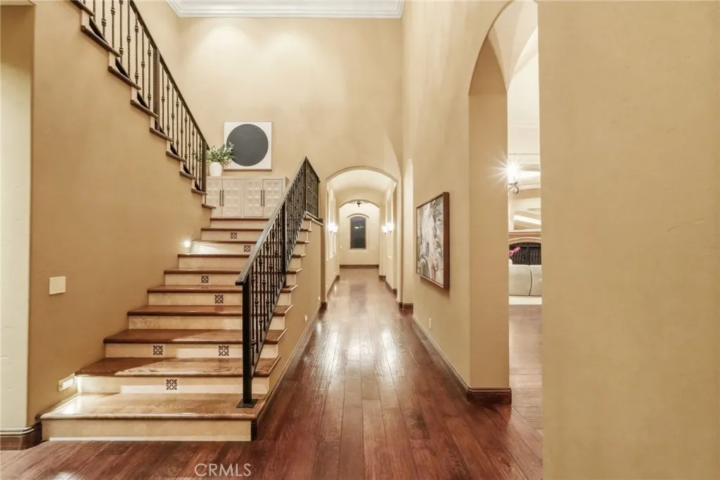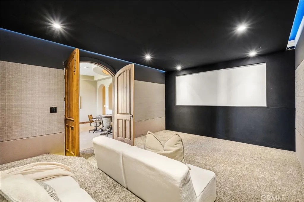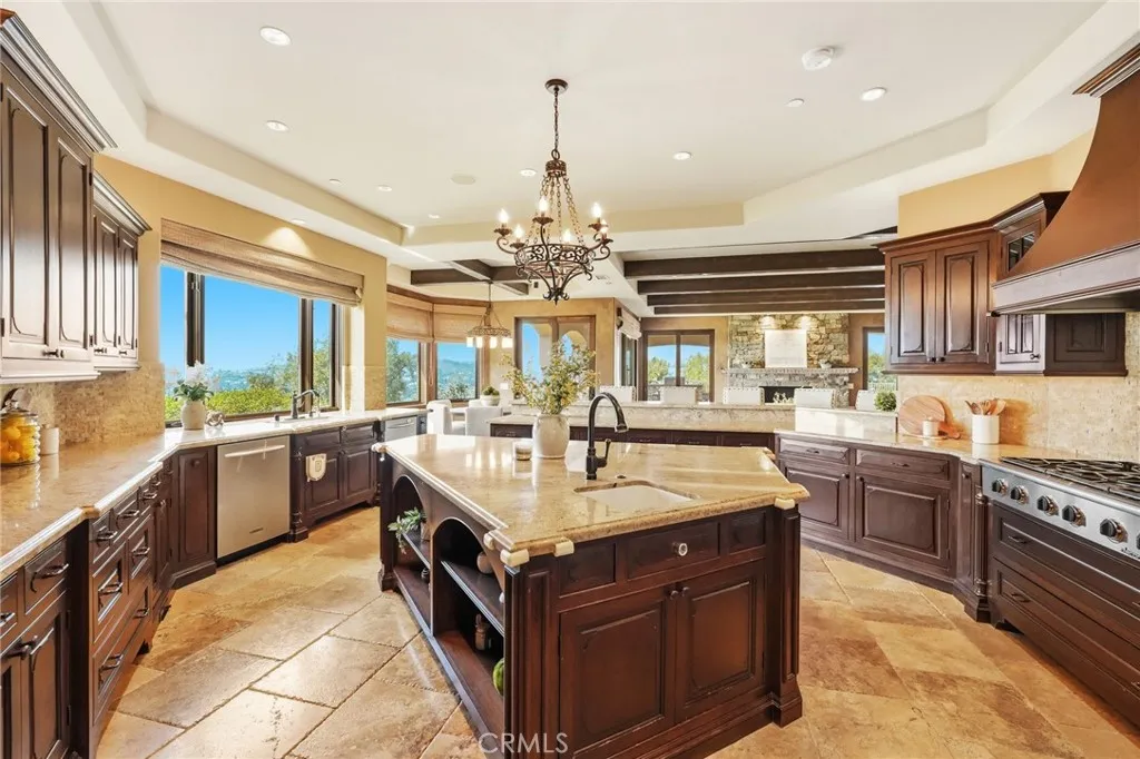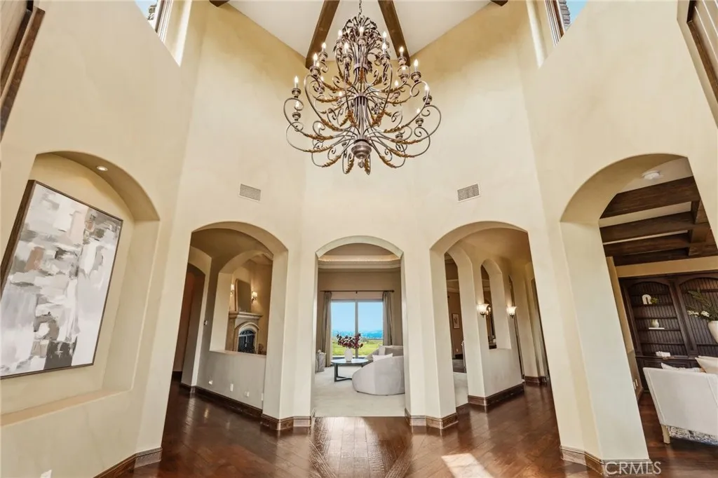 Set behind private gates on a secluded one-acre lot, this exceptional custom estate offers breathtaking 270-degree city light and sunset views with unmatched privacy. The double-door entry opens to a soaring 21-foot foyer, leading to elegant living spaces with 14-foot custom lighted ceilings designed to showcase the spectacular vistas. The chefs kitchen features a large center island, granite countertops, premium appliances, and butlers pantry, flowing seamlessly into the breakfast area and inviting family roomperfect for effortless entertaining. The main-level primary suite is a private retreat with dual custom walk-in closets, dual walk-in showers, separate vanity areas, and a soaking tub with beautiful tilework. Two additional en-suite bedrooms are located on the first floor, along with a private office featuring custom built-ins and large windows overlooking the scenic views of Orange Park Acres. Upstairs offers two additional en-suite bedrooms, a second laundry room, and a spacious bonus room with game table niche, large wet bar, and rooftop deck capturing sweeping views. A state-of-the-art home theater with leather seating, floated walls, enclosed equipment, large screen, and immersive sound system completes the homes impressive entertainment offerings. Resort-style grounds feature a pool, spa, built-in BBQ, and expansive seating areasall perfectly positioned to take in the panoramic views.