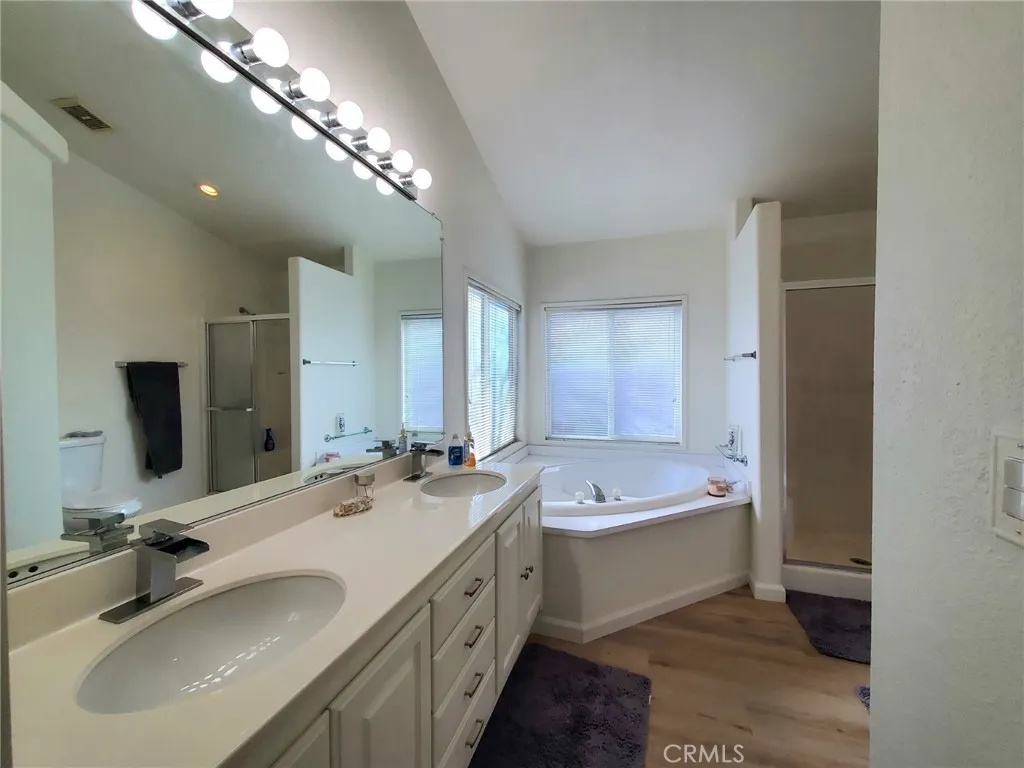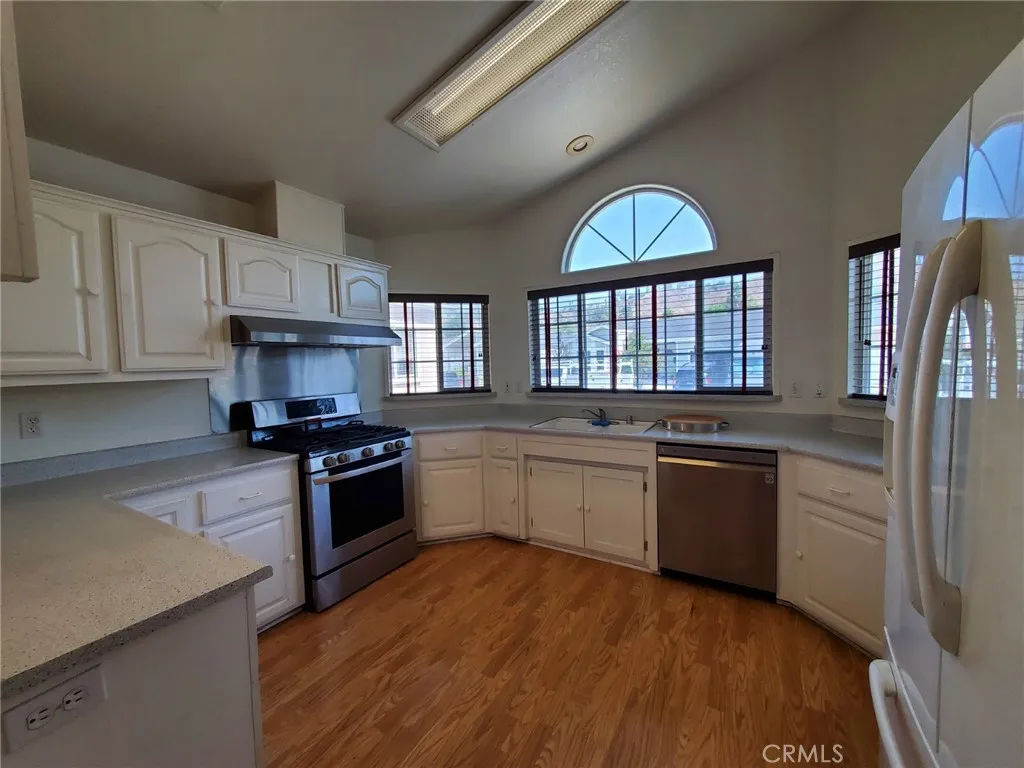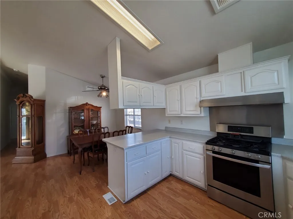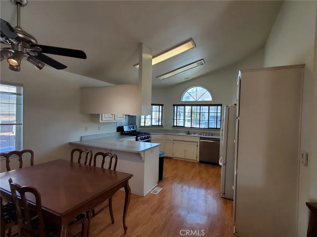 Welcome to this amazing 3 bedroom 2 bath home with a 2 car attached garage located in a quiet gated community. This home has a large living room with a fireplace, vaulted ceiling, access to the garage, a slider to the back yard and is open to the dining room and kitchen. The dining room has a ceiling fan and a breakfast bar counter to the kitchen. The kitchen faces the front yard has stainless steel appliances, including a dishwasher, white cabinets, tons of storage and a vaulted ceiling. The bedrooms are large with lots of light and closet space. The main bathroom has a beautiful vanity with a vessel sink, shower/tub combination and tiled flooring. The laundry room has additional storage and room for a side by side washer and dryer. The primary bedroom has a sliding door to the backyard, a ceiling fan, vaulted ceiling, a walk-in closet and a private bathroom. The primary bathroom features a double vanity, a soaking tub, a walk in shower, tiled flooring and windows for natural sunlight. The home has light laminate wood flooring throughout the main living areas, a 2 car attached garage, a private fenced back yard with astro turf for low maintenance.