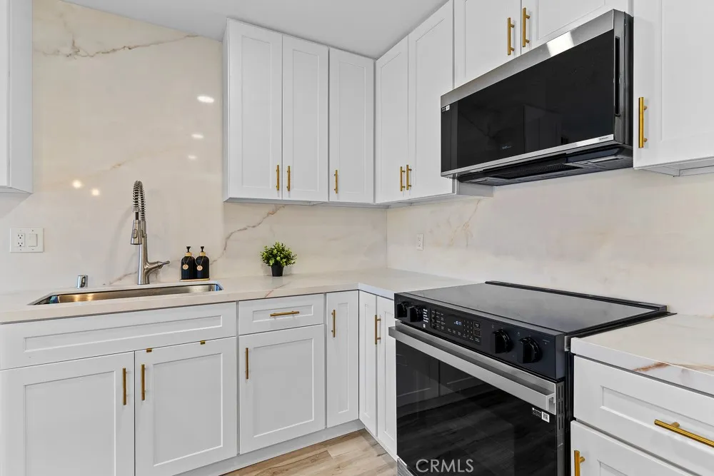 NEW! Fully renovated 2-bedroom, 1-bath top-floor unit offering privacy and an open, light-filled layout. Upgrades include Lifeproof Arches Natural luxury vinyl plank flooring, Ducale White marble-look porcelain tile, marble countertops, and copper-colored like fixtures throughout. Modern kitchen with sleek cabinetry and updated finishes, plus a remodeled bathroom. Quiet upper-level location with no units above. Located in a well-maintained Lake Forest community near shopping, dining, parks, and convenient freeway access. True turnkey opportunity.