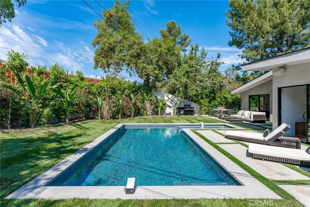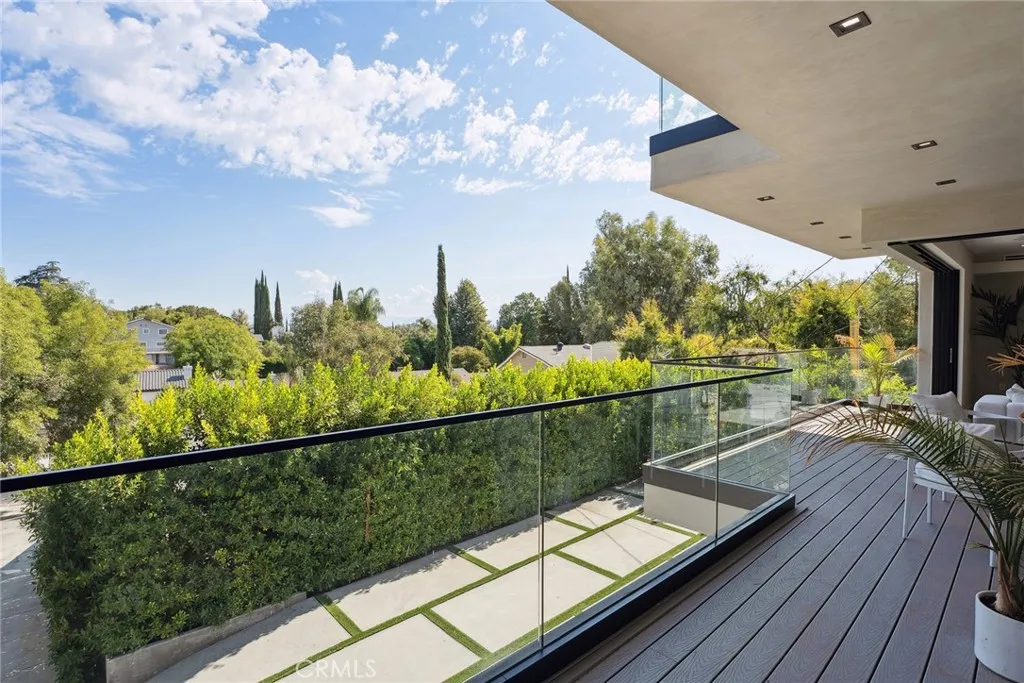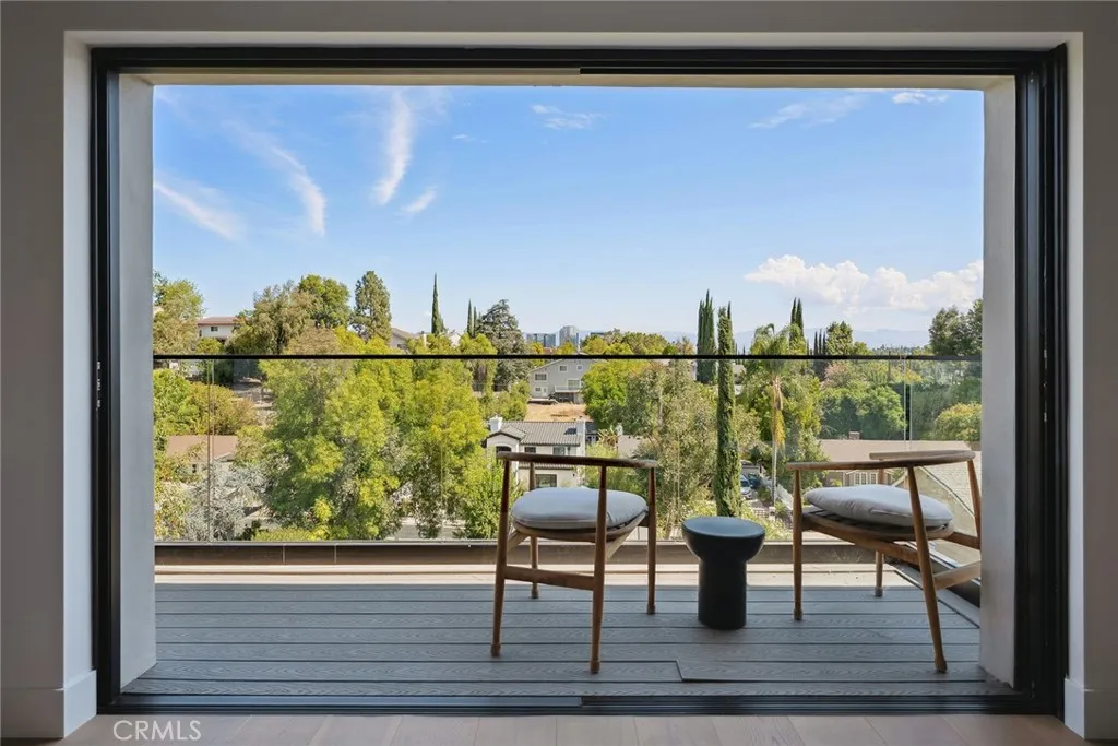 Gated modern estate newly constructed in 2024 with just completed brand new pool & spa located South of the Boulevard with Valley, mountain, & city light views! Privately tucked away and hidden from the street, the property is situated down a long gated driveway with pedestrian access and flanked by tall growth hedging. Oversized parking can accommodate 10 cars plus there is direct access to an extra deep 540 SF 2-car garage. The interiors boast meticulous craftsmanship, designer finishes, and almost every room looks out to gorgeous views. A glass pivot entry door opens to a grand foyer where youll find a completely open floor plan filled with natural light from sweeping glass doors that open to the vistas beyond. The chefs gourmet kitchen boasts massive center island with breakfast bar seating, stainless gourmet appliances, custom soft close cabinetry with quartz counters, separate wine fridge, and great pantry space. The kitchen opens directly to all living spaces including the formal dining room, the spacious family room with stone fireplace, and separate separate den - all rooms highlighted by glass pocket doors & sliders that open to a sprawling wraparound balcony deck with seating area that overlooks the amazing Valley & mountain views. A lower level movie theater has a full bathroom, access to the exterior, and can alternatively be used as a guest suite. Ascend a stunning floating glass and iron staircase to the upper level where youll find four well appointed bedrooms including the luxurious primary suite featuring stone fireplace, pocket doors that open to a balcon