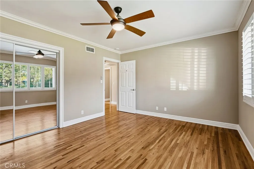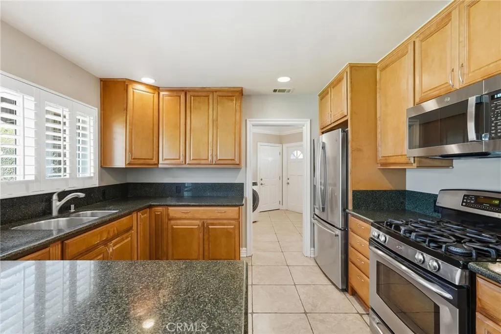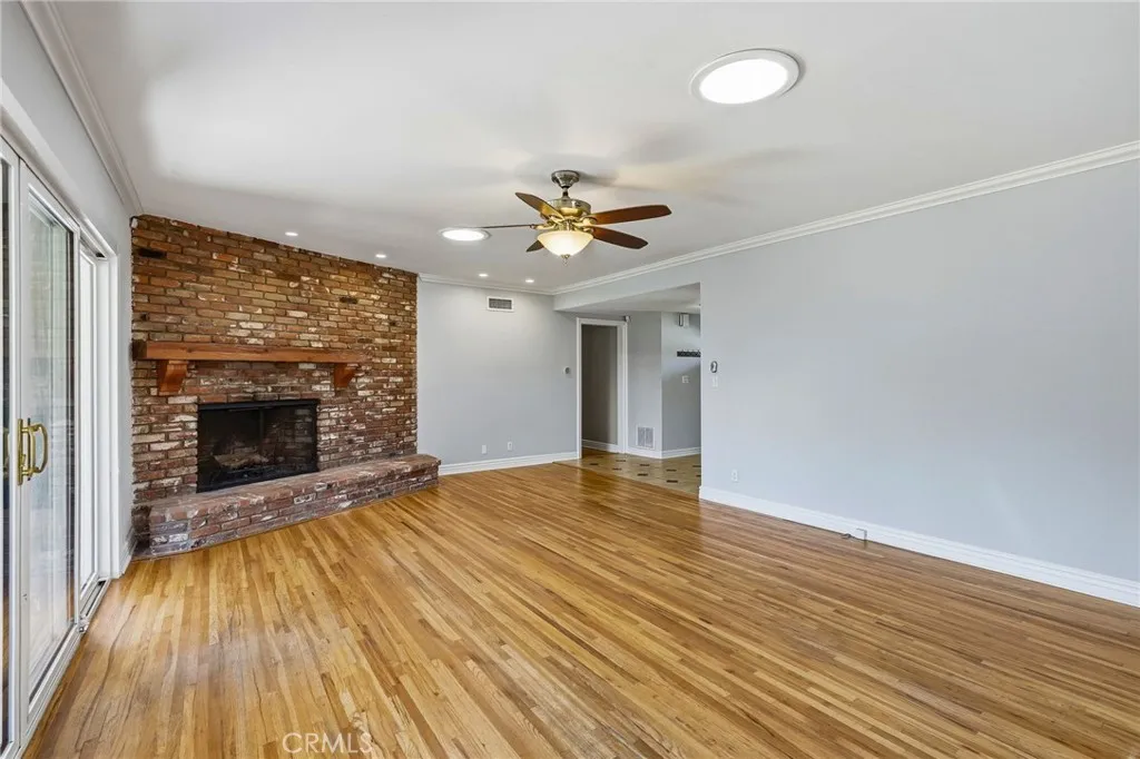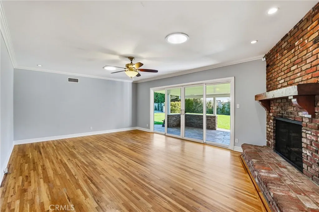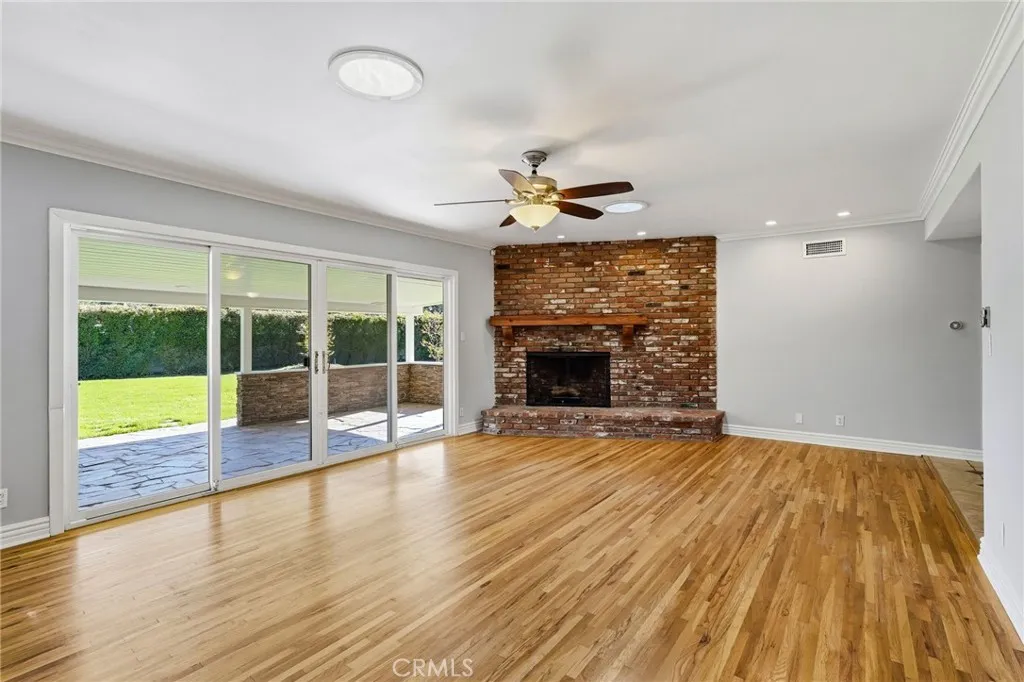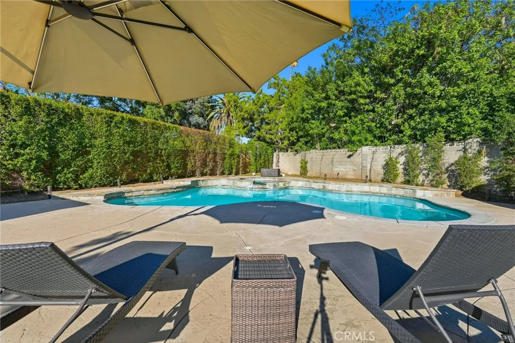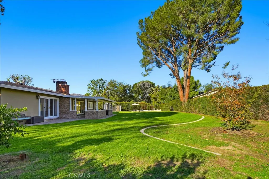 Discover the epitome of California living in this exceptional Chatsworth estate, nestled at the end of a serene cul-de-sac. This single-story residence welcomes you with impressive curb appeal, featuring a stamped concrete driveway and walkway leading to elegant double doors. Upon entry, you are greeted by an expansive living room framed by oversized sliding glass doors that seamlessly blend indoor and outdoor living. Solar tubes, crown molding and a beautifully detailed brick fireplace create an ambiance of warmth and sophistication. The gourmet chefs kitchen is appointed with rich cabinetry, granite countertops, abundant storage and opens to a sunlit dining room overlooking the manicured front grounds. The luxurious primary suite is a private retreat, offering direct access to the backyard oasis, double closets and a spa-inspired ensuite showcasing custom cabinetry, vanity with double sinks and an oversized designer-tiled shower. Two spacious secondary bedrooms enjoy picturesque front-yard views and share a beautifully appointed full bathroom. A separate fourth bedroom, located in its own wing with direct access to an updated bathroom, provides an ideal space for guests, extended family, a home office, or a personal fitness studio. Additional interior amenities include a generous indoor laundry room and a walk-in pantry. The impeccably finished garage offers direct access, epoxy floors, an insulated door, recessed lighting, seperate A/C system and convenient pull-through capability. The amazing rear grounds provide the feeling of a private park designed for both intimate