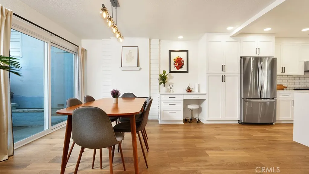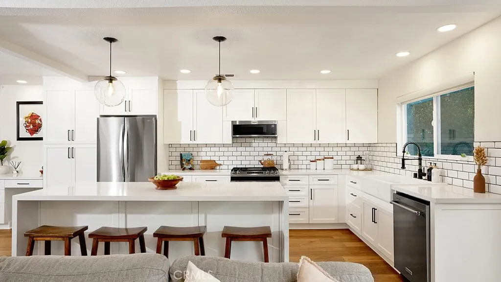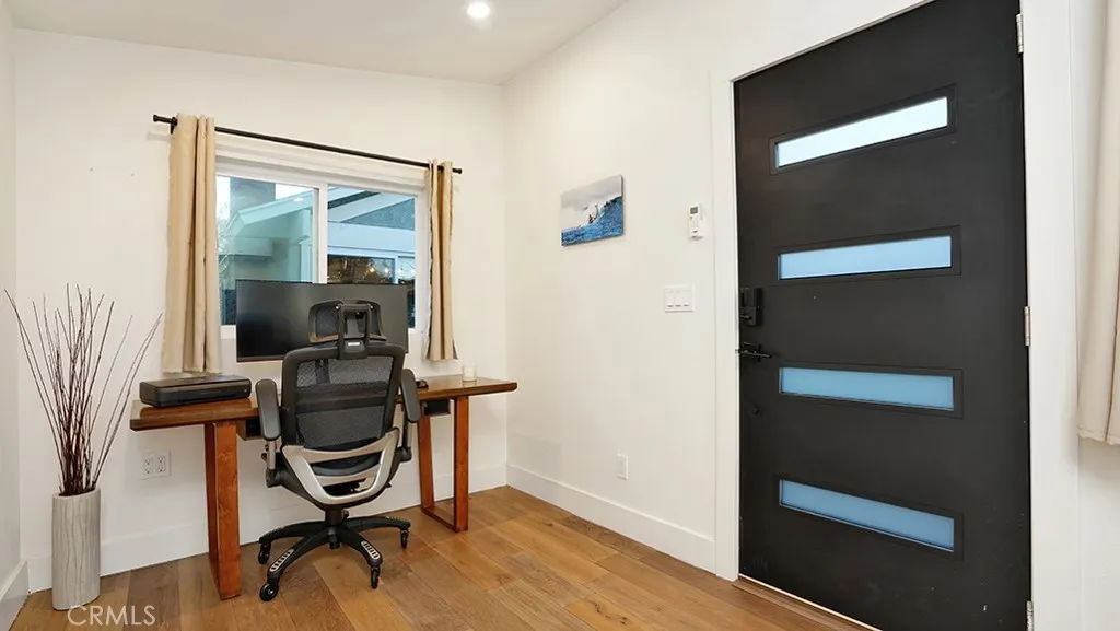 Experience luxury living in this tastefully renovated single level home that features 3 bedrooms, 2 baths, 1,485 square feet of living space on a 5,750 square foot lot with room for a pool. Upon arrival, the home's intentional landscape and well maintained exterior offers a preview of what you'll find past the front gate. Enter to a spacious courtyard that is illuminated with string lights and also home to a detached, custom 120 square foot shed that is currently used as an office. The office's finished interior features dual-pane windows, engineered flooring, recessed lighting and a mini-split AC system that all combine to create an ideal work-from-home environment. Through the double door entry you are welcomed to an open floor plan where the designer kitchen is the centerpiece. Remodeled in 2022 the kitchen features stainless steel appliances, farmhouse sink, new cabinets with soft closing doors and drawers, a pantry and built-in desk off adjacent to the dining area. The kitchen island is well proportioned to the space and provides more storage with built-in cabinets, room to seat four, additional counter space and an aesthetically pleasing waterfall countertop. The open concept design is best illustrated by looking around when being near the kitchen sink; from there you can keep an eye on what's going on in the backyard, the dining area, family room, front courtyard and inside the office if the curtains are open. Step through the great room's sliding glass door to a sizable backyard with no neighbors behind, a West-northwest orientation perfect to enjoy sunsets and a pe