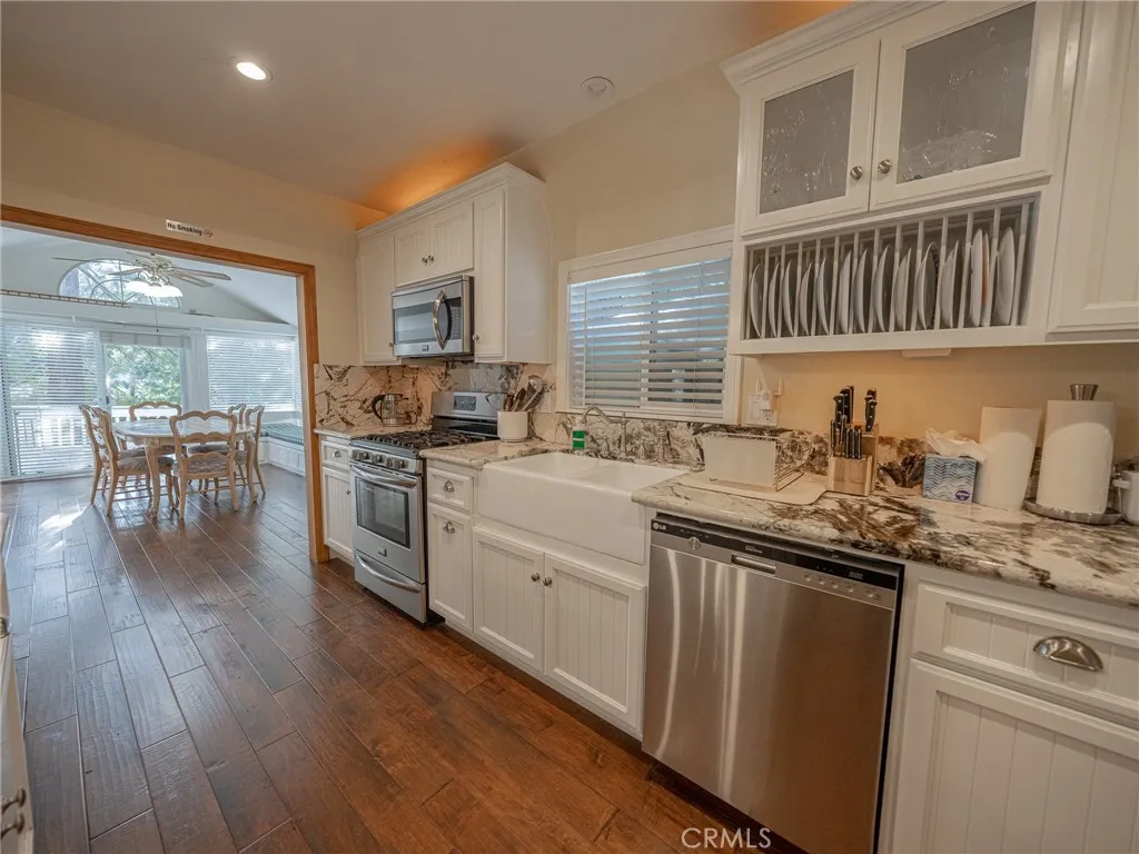 This well maintained residence is situated in a prime location near the Village and Burnt Mill Beach Club. The exterior features durable vinyl siding, mostly dual-pane windows, and a wraparound deck offering serene wooded views. The main level boasts a bright living room highlighted by four skylights, a ceiling fan, and a painted stone fireplace with a wood stove insert. Adjacent to the formal dining room, the updated kitchen features premium granite countertops, wood flooring, stainless-steel appliances, and a separate pantry with laundry hookups.The versatile floor plan includes a bedroom and bath on the mid-level, with a private primary suite and a third bedroom on the upper level. Ample parking is a standout feature, providing space for up to six vehicles, a boat, or an RV.