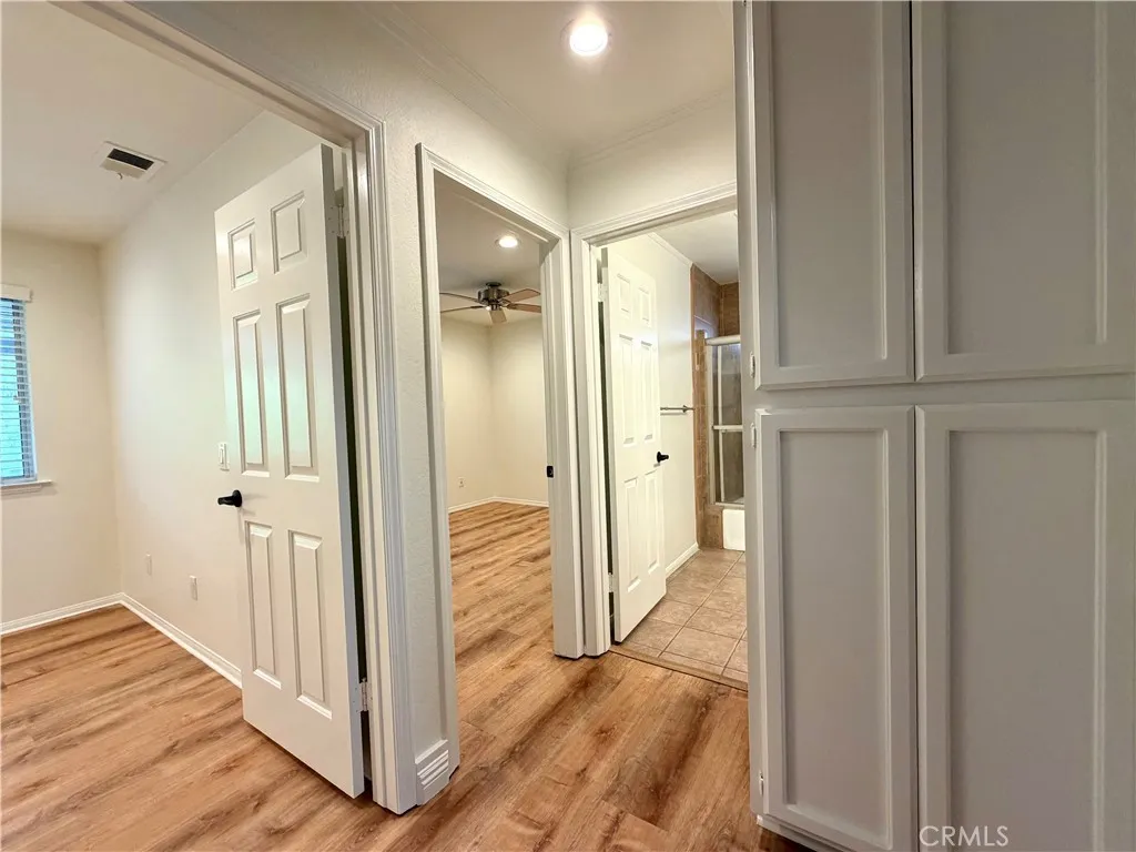 Welcome to the sought-after community of Canyon Lake, where resort-style living meets everyday comfort. This unique home offers 3 bedrooms and 2 bathrooms in the main living area, plus a separate 4th bedroom with a full bathroom and private entranceperfect for guests, extended family, or a private workspace. Residents enjoy access to incredible community amenities including the iconic lake, golf course, lodge with restaurant, community pool, tennis and pickleball courts, 24/7 gated security, and so much more. As you arrive, youre greeted by low-maintenance landscaping and a welcoming staircase leading to the main entry. Inside, the spacious living room features luxury-style flooring, recessed lighting, and built-in shelving ideal for books, dcor, or additional storage. A convenient coat closet is located near the front door. The kitchen is both functional and stylish, showcasing a cozy nook with an electric stovetop, pendant lighting, sleek countertops, wood-finish cabinetry, and recessed lighting throughout. Down the hallway, the primary suite serves as a relaxing retreat with recessed lighting, a large closet, and an updated en-suite bathroom featuring dual sinks, white cabinetry, dual vanities, and a shower/tub combination with upscale finishes. Two additional bedrooms are generously sized and feature matching elegant flooring and recessed lighting. The hallway bathroom includes tile flooring and a shower/tub combination. From the kitchen, access the lush, green backyard, offering a peaceful outdoor setting and access to the lower level. Downstairs, youll find the garage